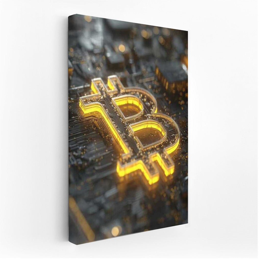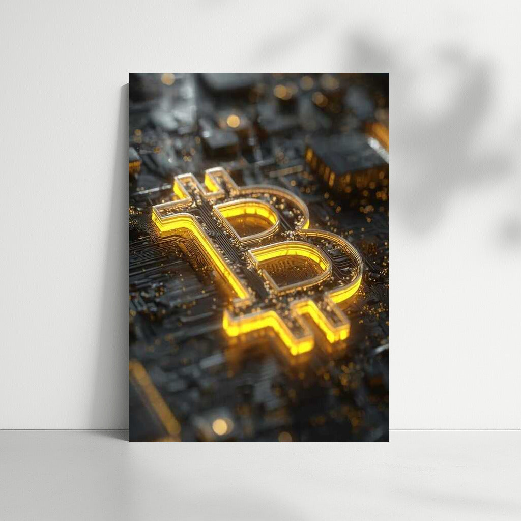 Glowing Bitcoin On Chip Background: Cryptocurrency Themed Wall Art Glowing Bitcoin On Chip Background: Cryptocurrency Themed Wall Art