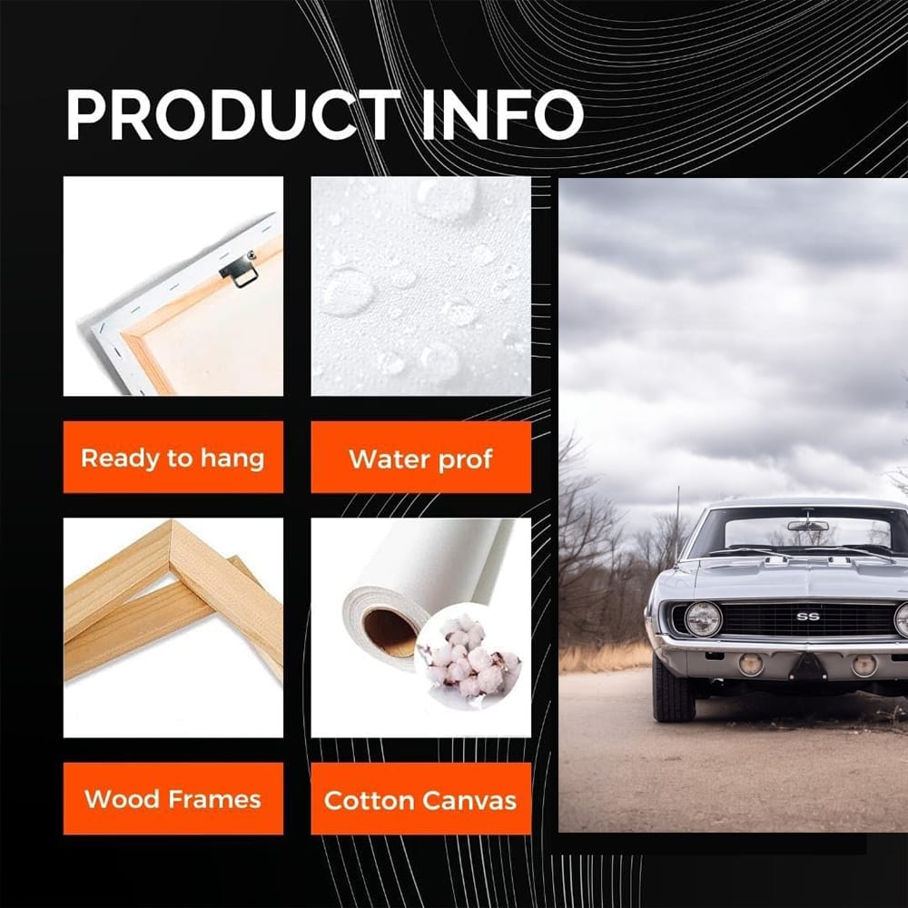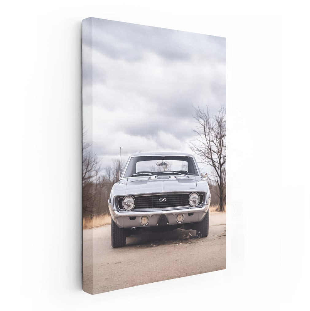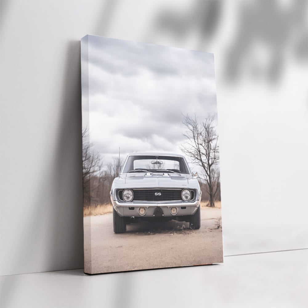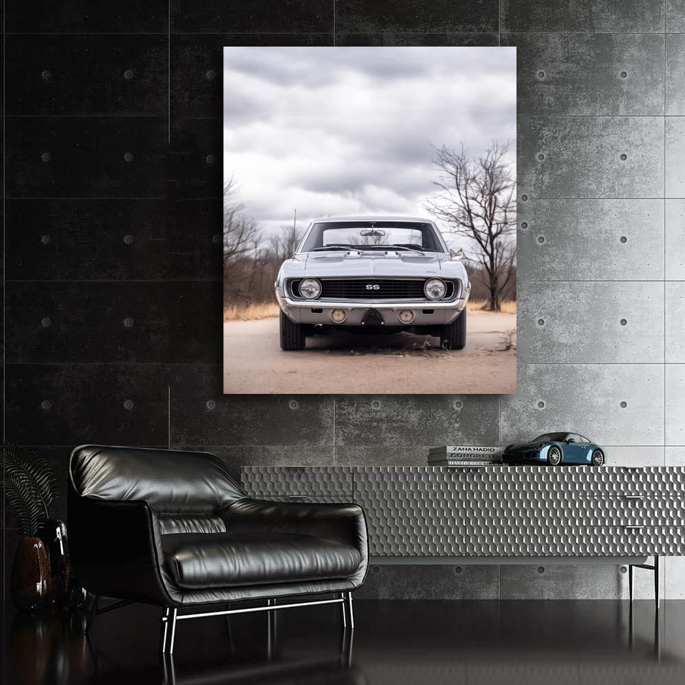 This poster is pure joy for car fans. The painting of a 1969 Chevy Camaro SS roaring in the nature is wall art that makes the wall look cooler. The Camaro is here like a beast ready to pounce. If you are a fan of muscle cars, this is your must have! See more from the collection: Chevrolet Art