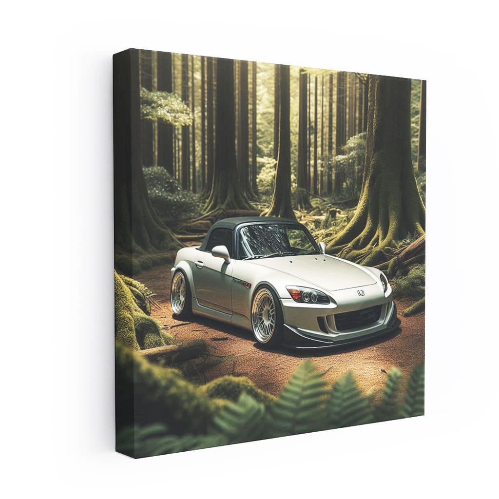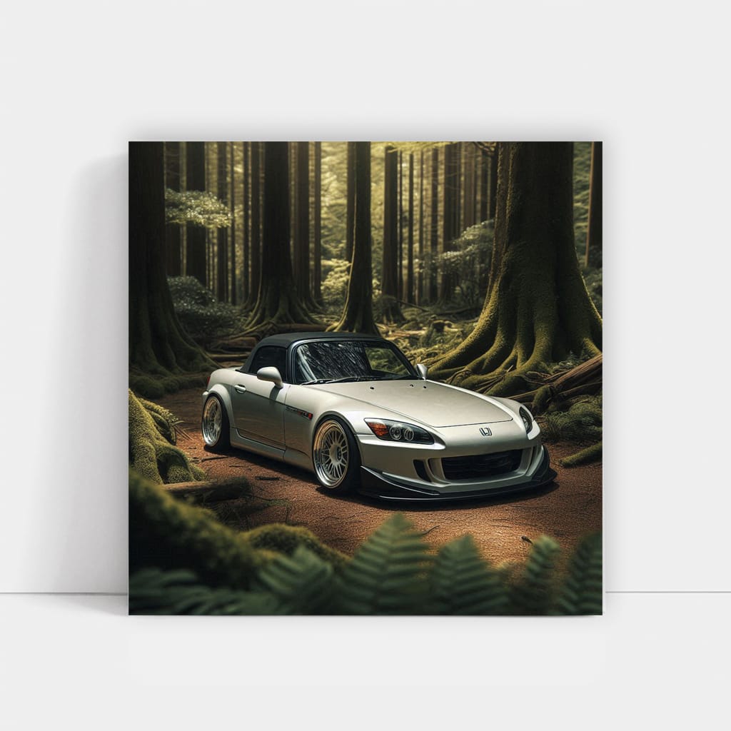 Dream car! This 2001 Honda S2000 in the woods is a blast. Wall art for those who know cars. A poster of this crazy car will add a bold touch to any wall. A painting with an S2000 is a perfect choice for a garage or a man cave. You can almost feel the roar of the engine when you look at it! See more from the collection: Honda Art