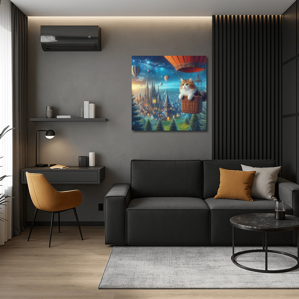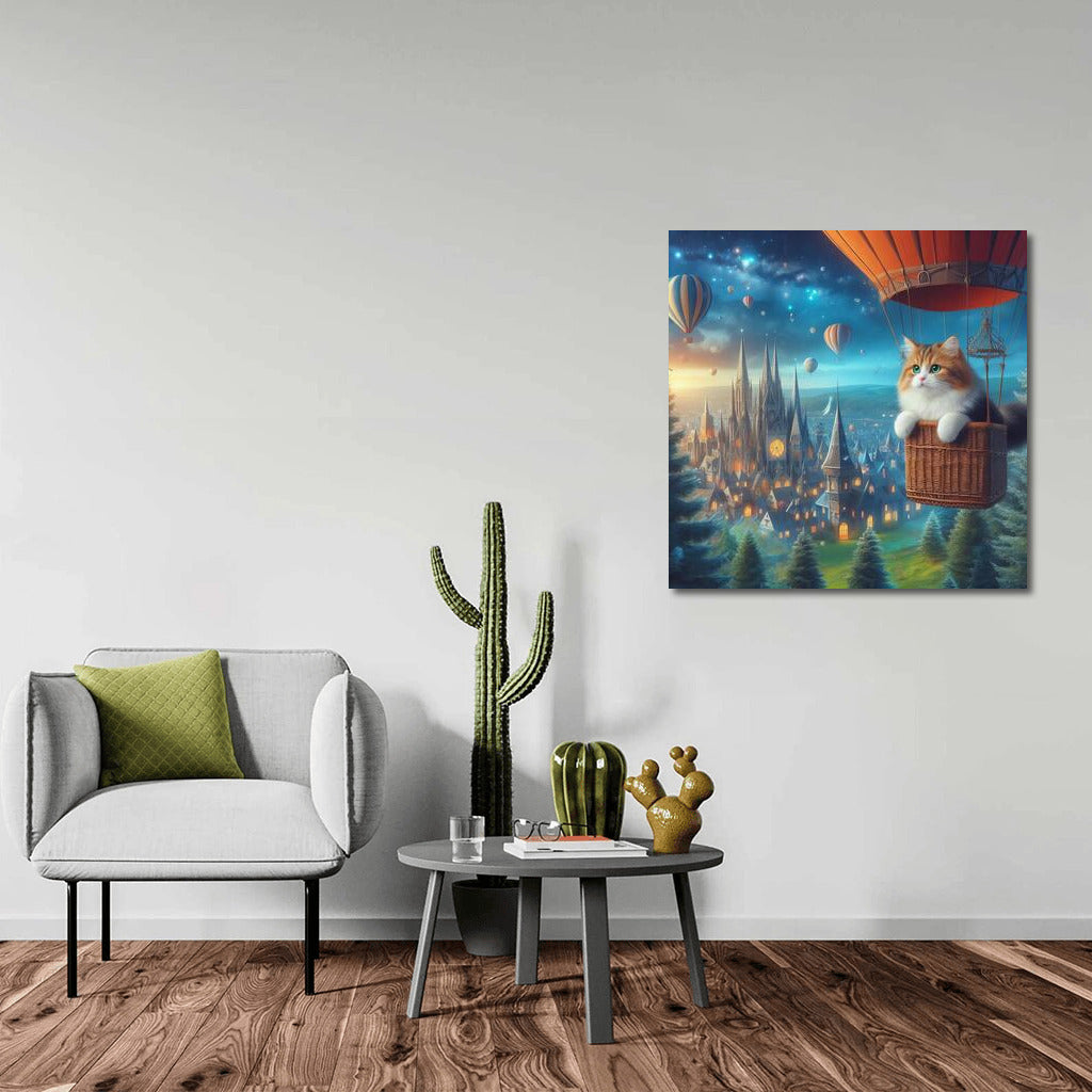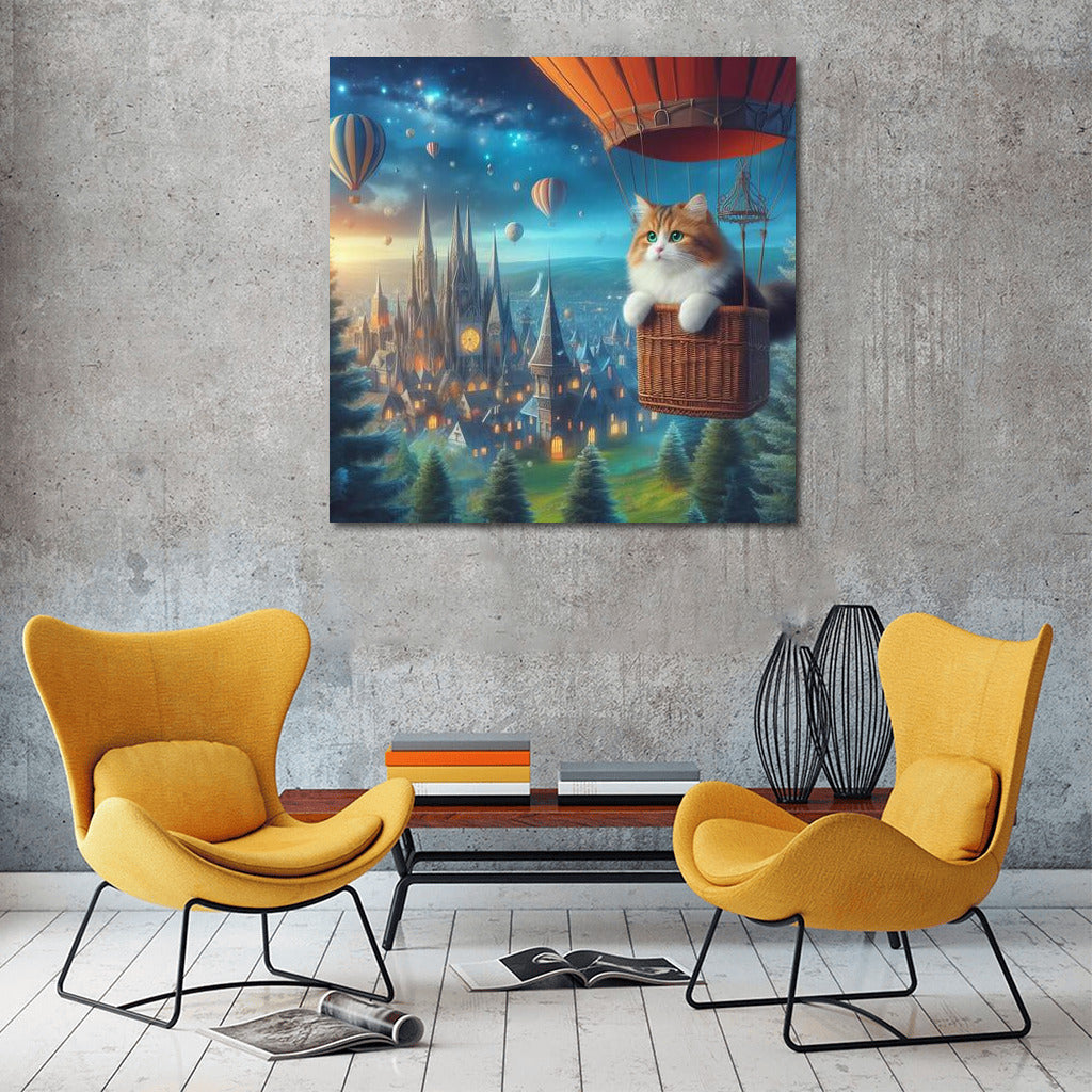 A soaring cat in a hot air balloon explores a fairytale city. Bring your interior to life with the magic of wall art! See more from the collection: Animals Art