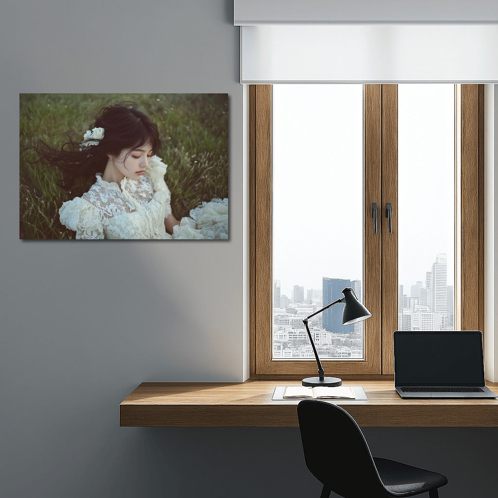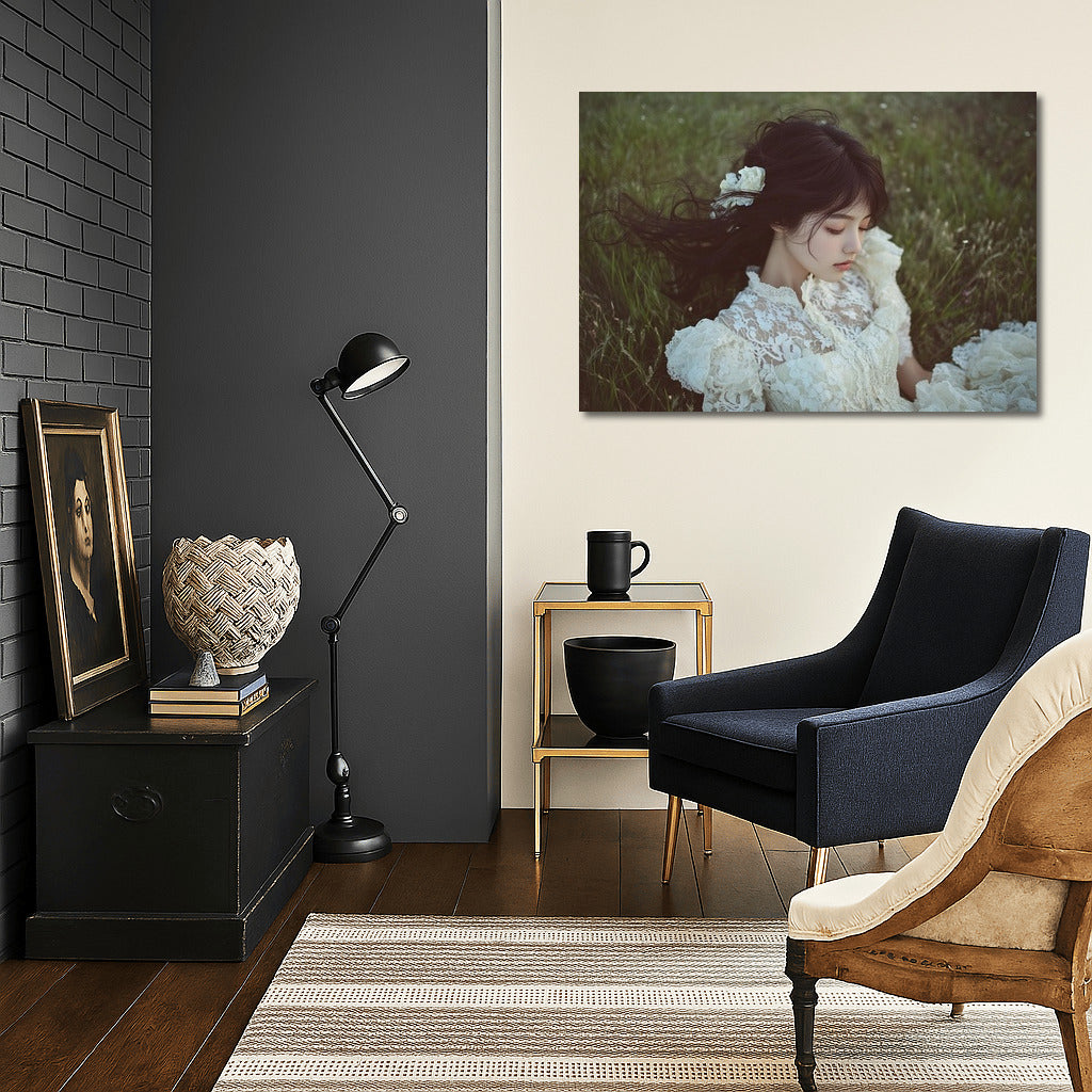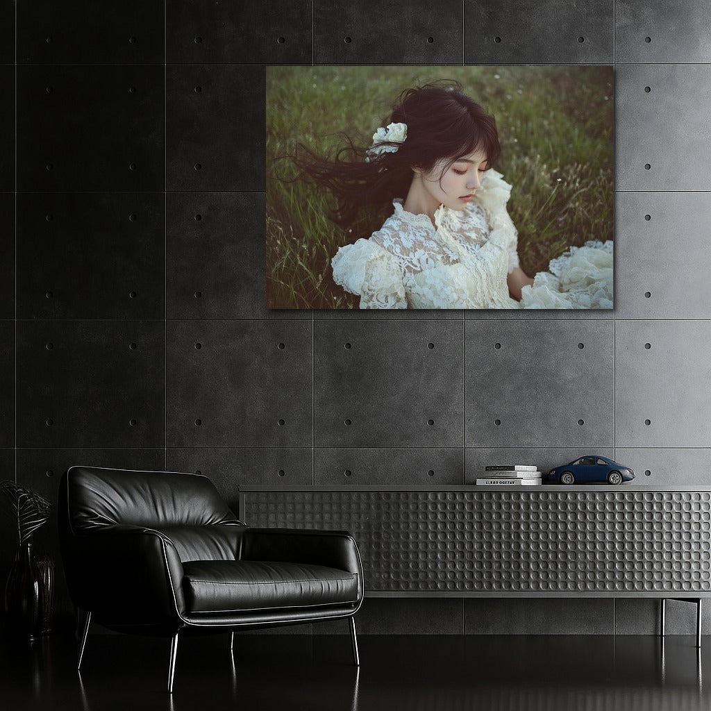 An elegant poster: a gentle dream in a flower field. The painting embodies the tranquility and beauty of nature. Ideal for wall art. See more from the collection: Mixed Wall Art