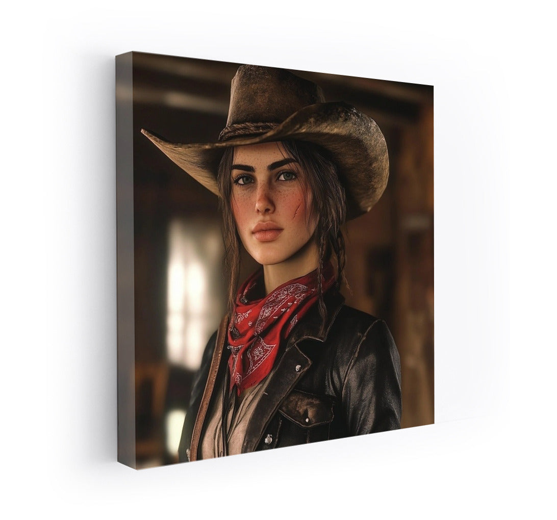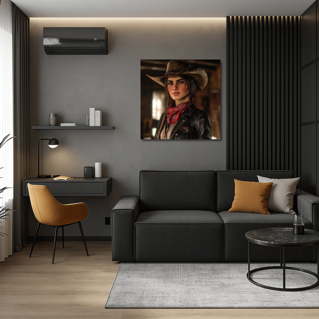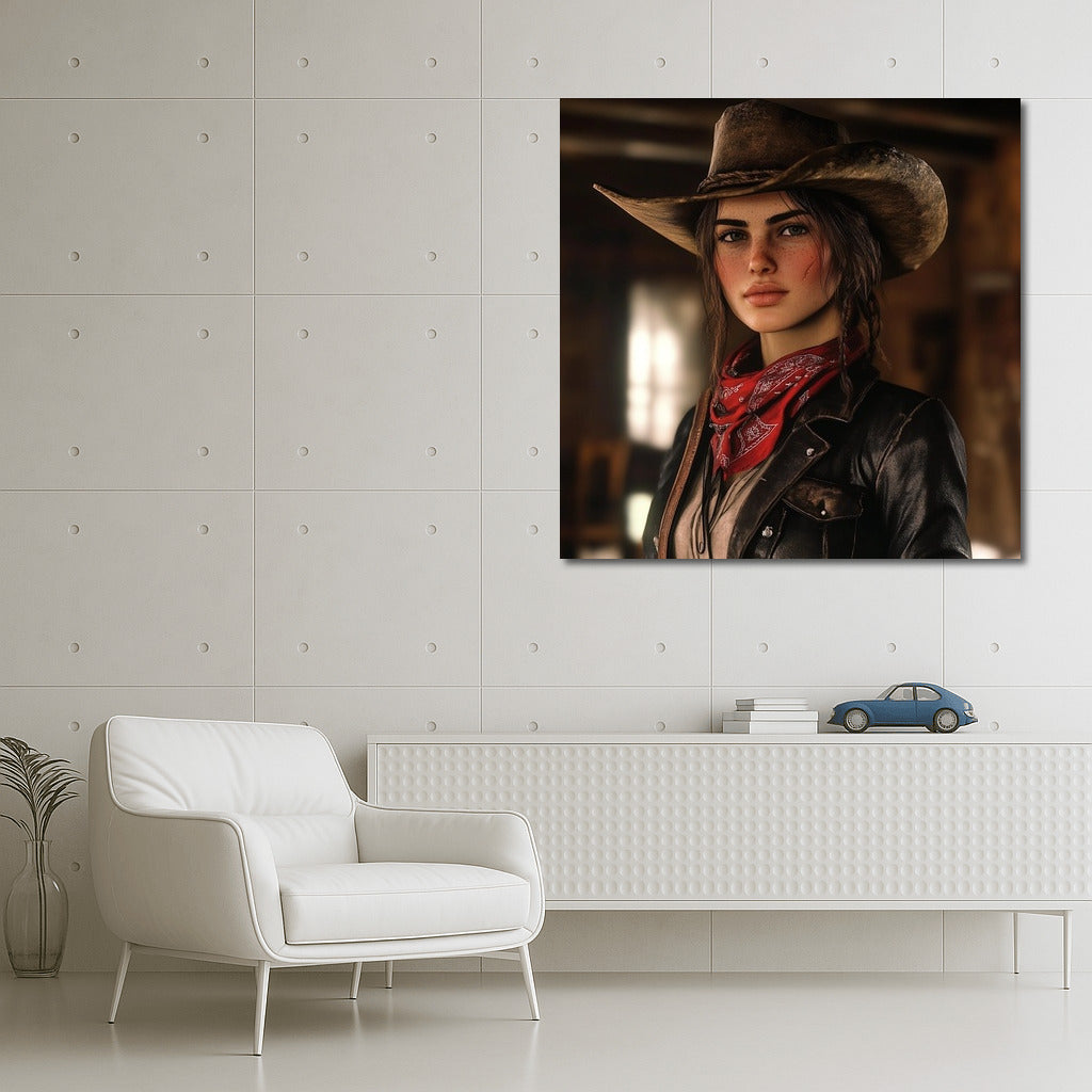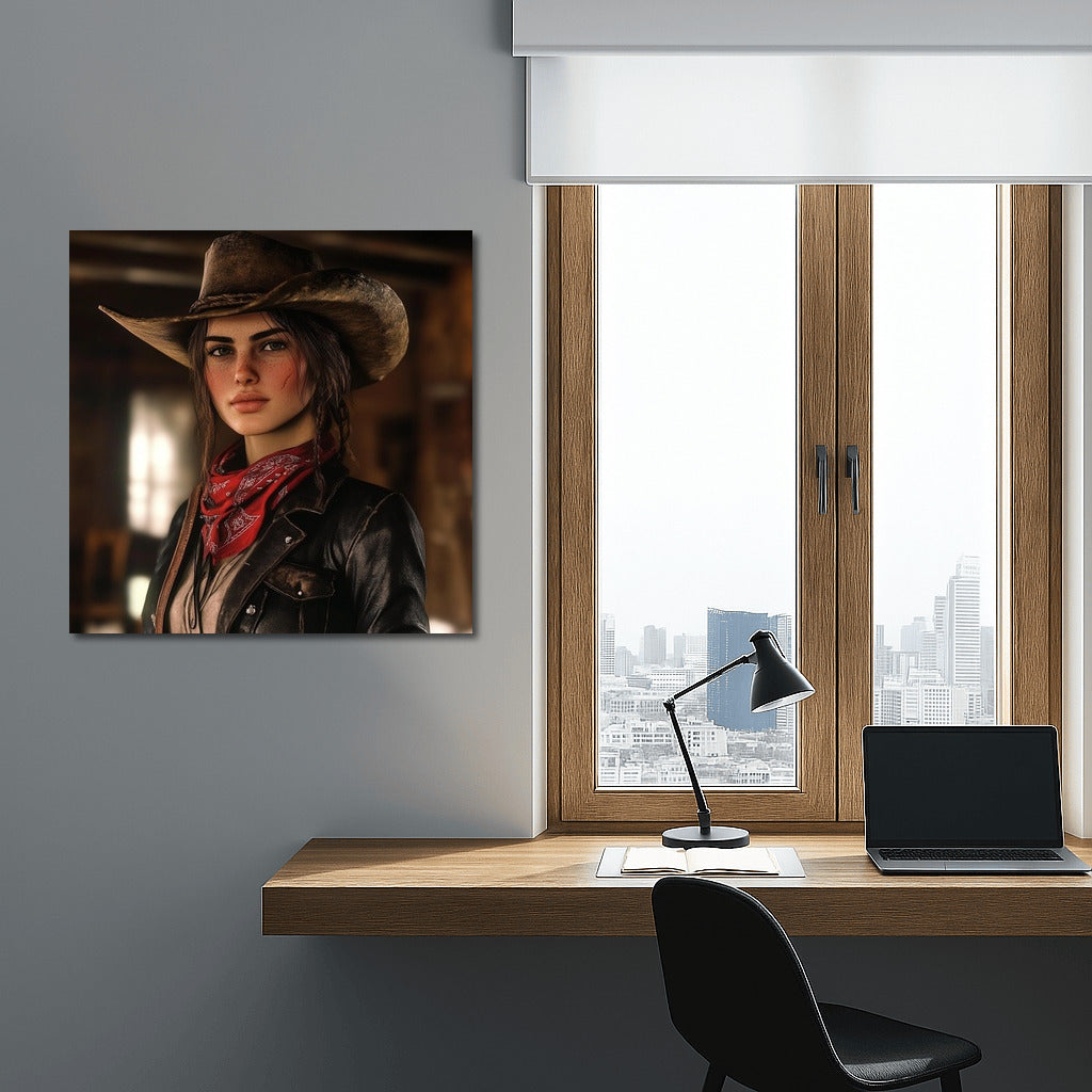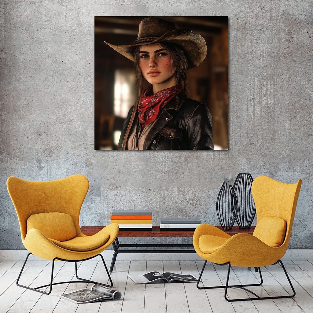 Cowboy spirit in this poster: a sophisticated girl in a stylish hat. Wall art filled with the atmosphere of the Wild West. See more from the collection: Mixed Wall Art