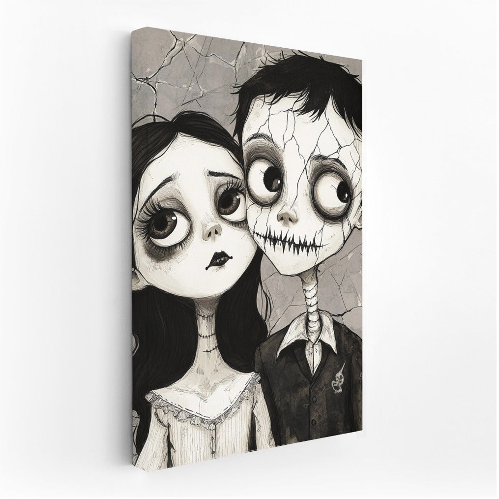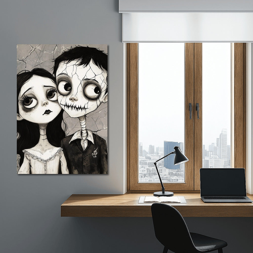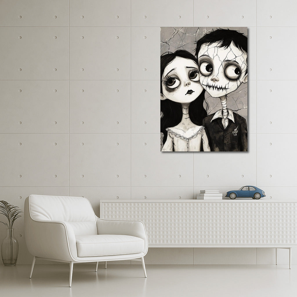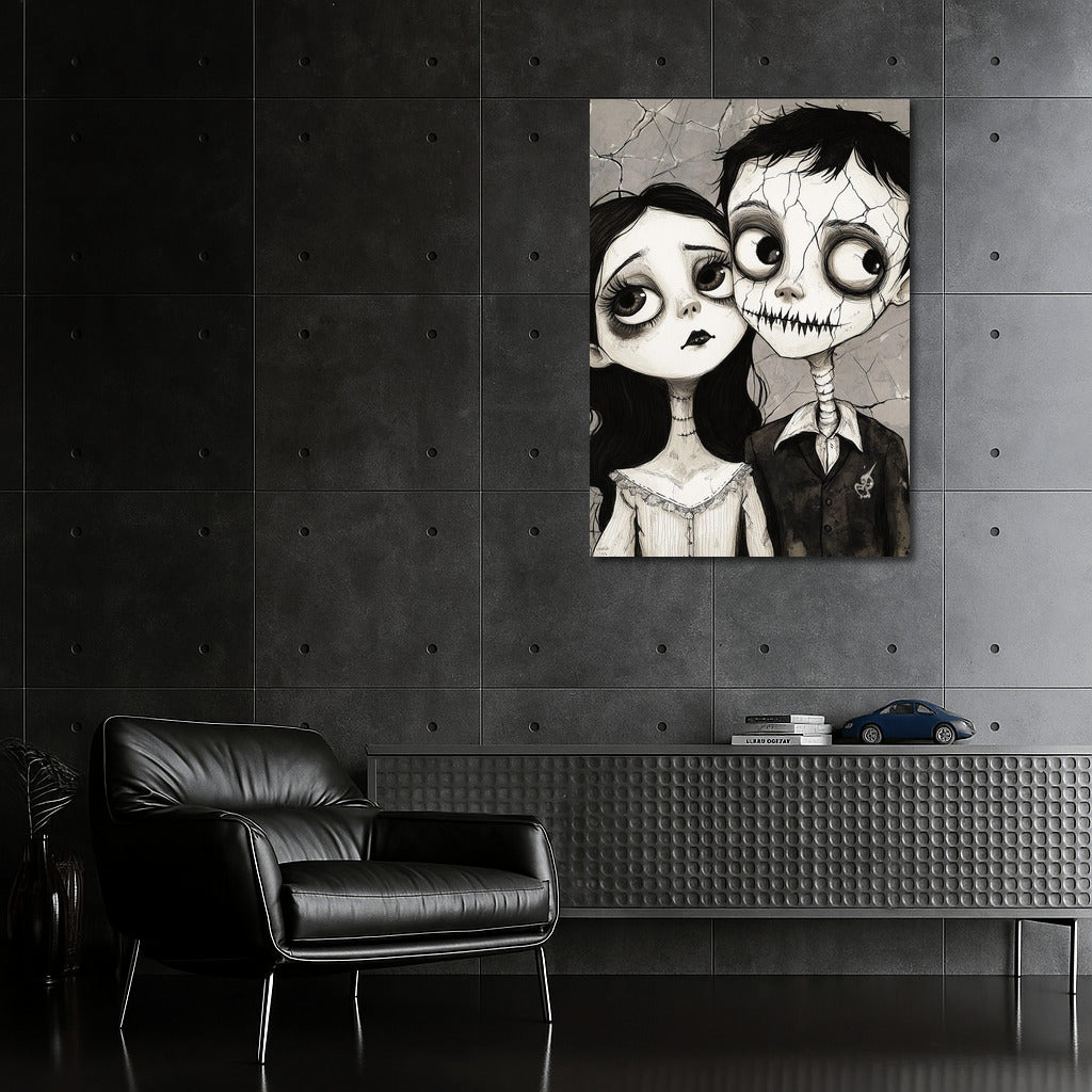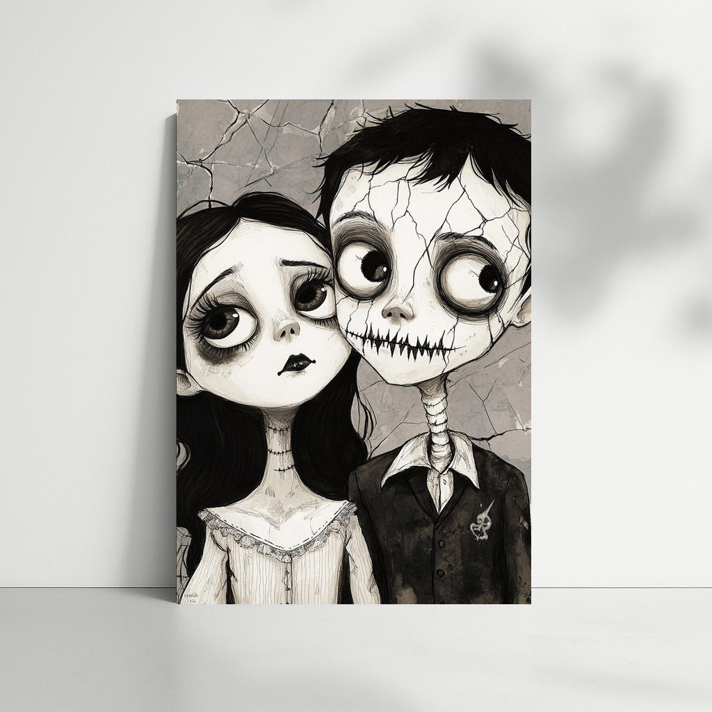 Poster Cracks in the Soul: a mysterious couple with big eyes on the verge of a fairy tale and gothic. Wall art for dreamers. See more from the collection: Black and White Art