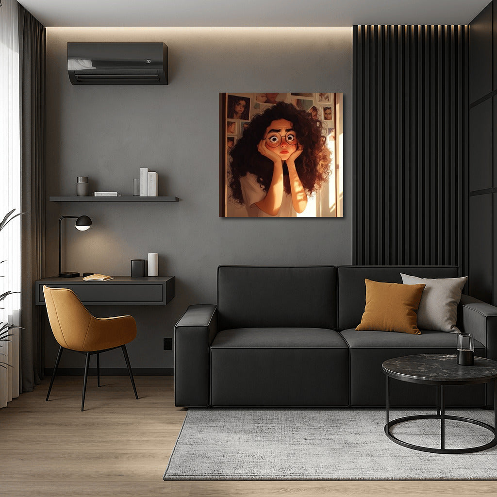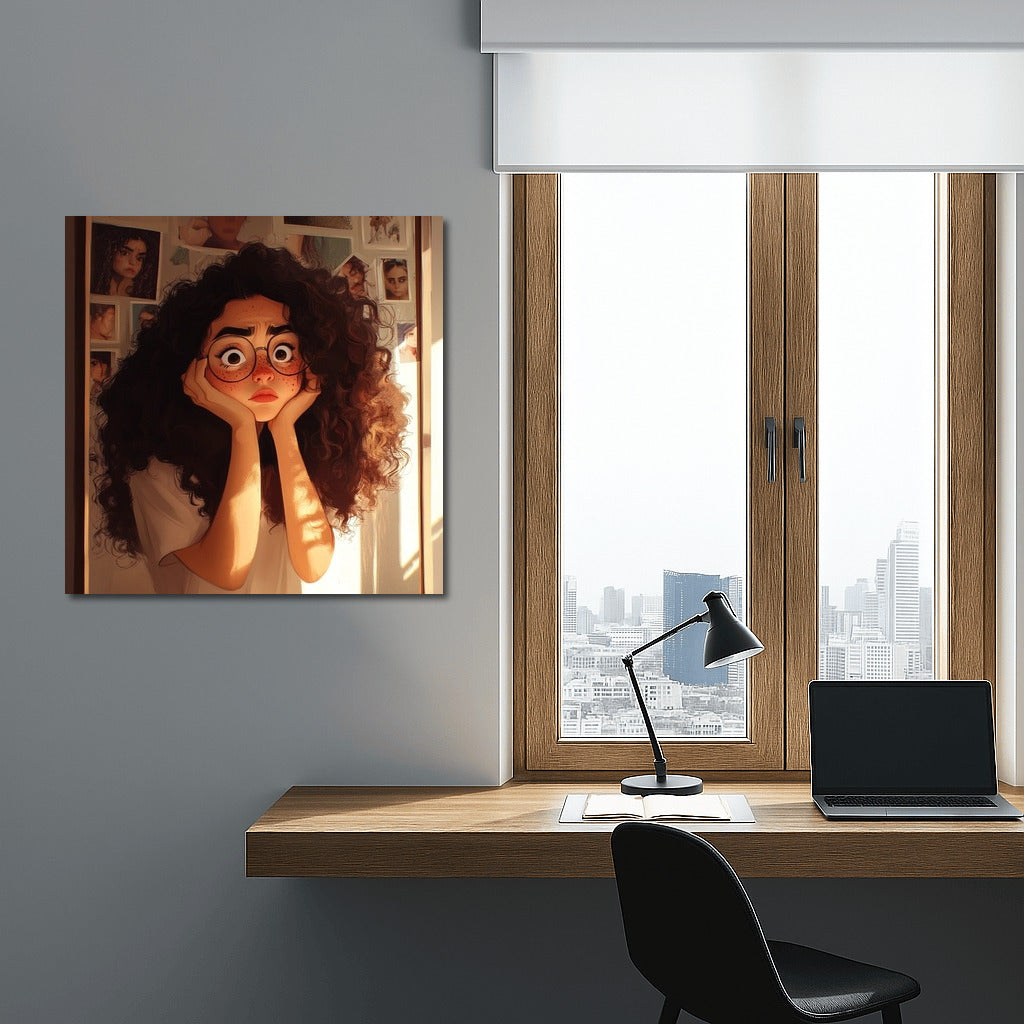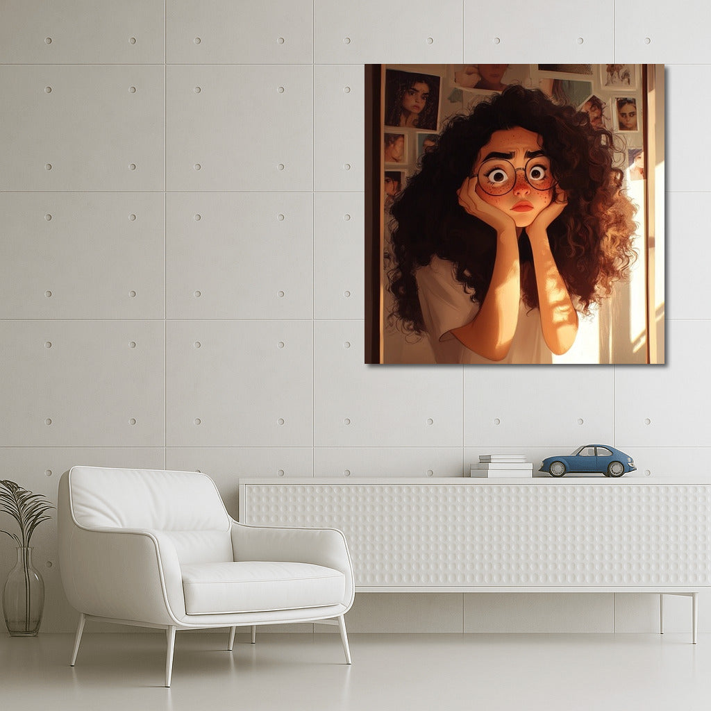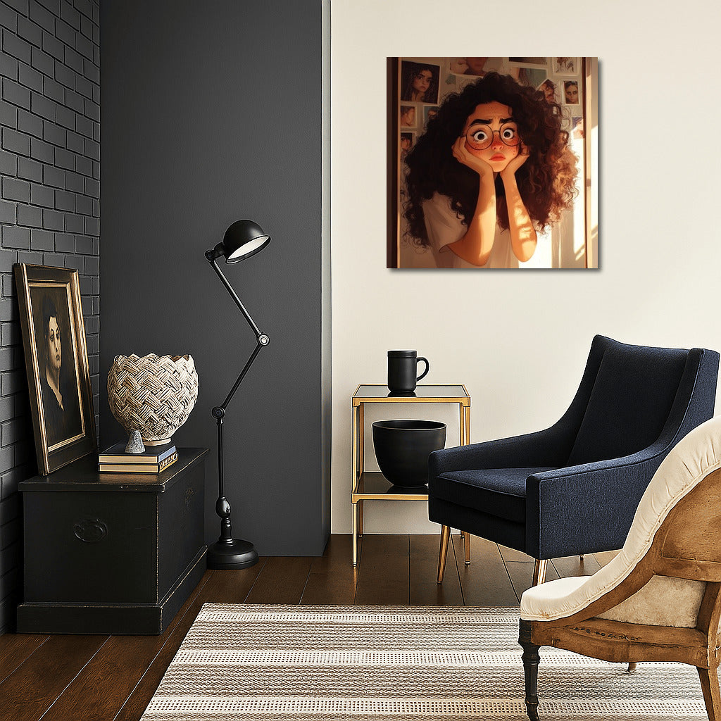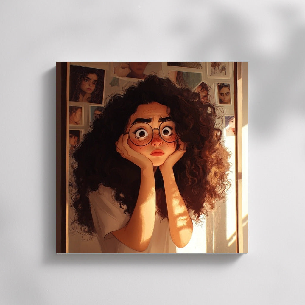 An image of a dreamy character with curls and large glasses. The poster brings personality and creativity to the interior. See more from the collection: Cartoon Art