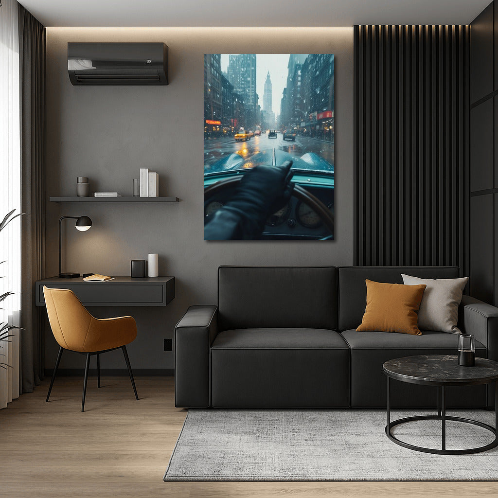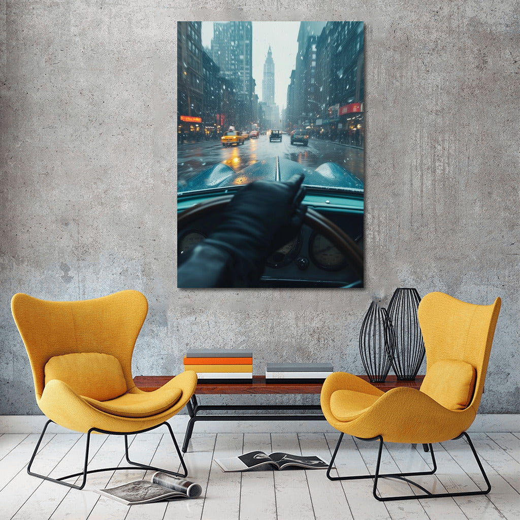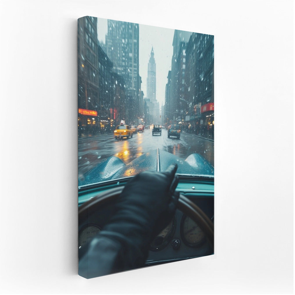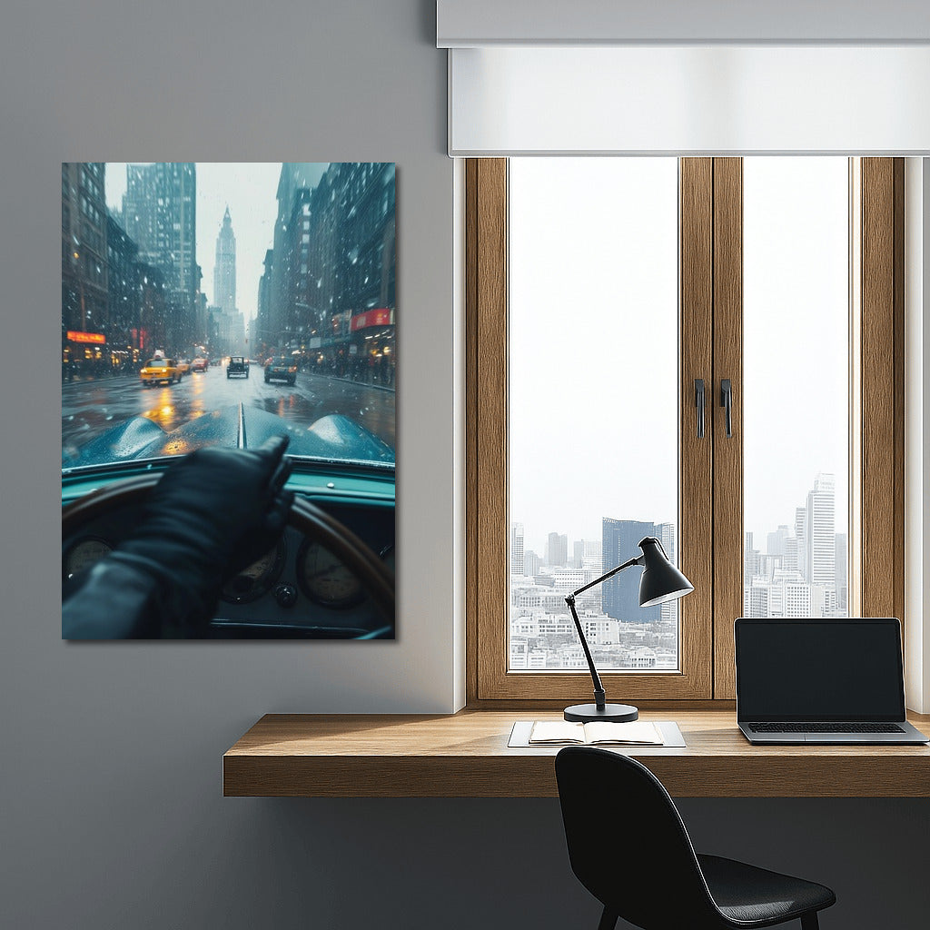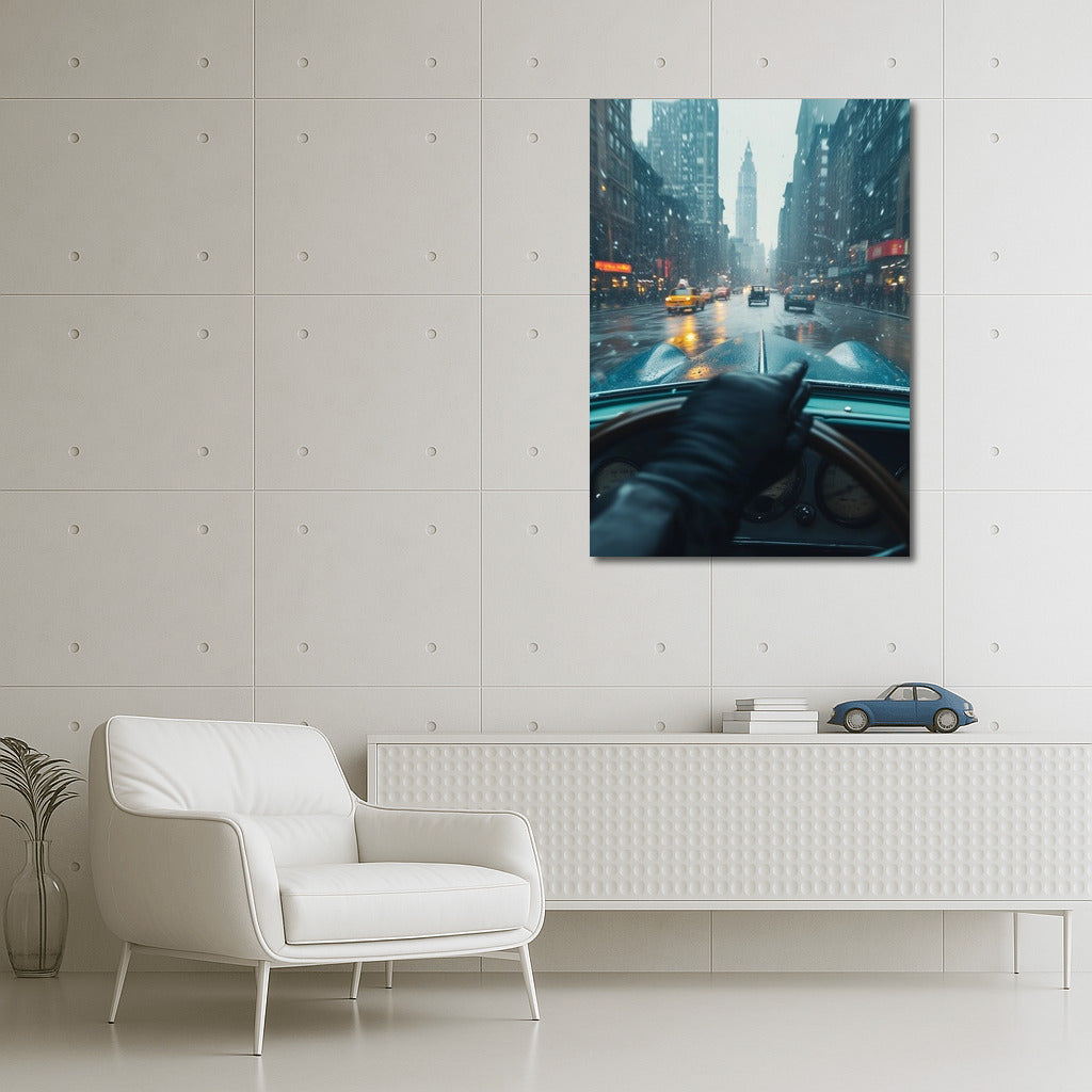 City bustle from the cabin of a retro car. Immerse yourself in the atmosphere of a vintage journey with our wall art poster. See more from the collection: Mixed Wall Art