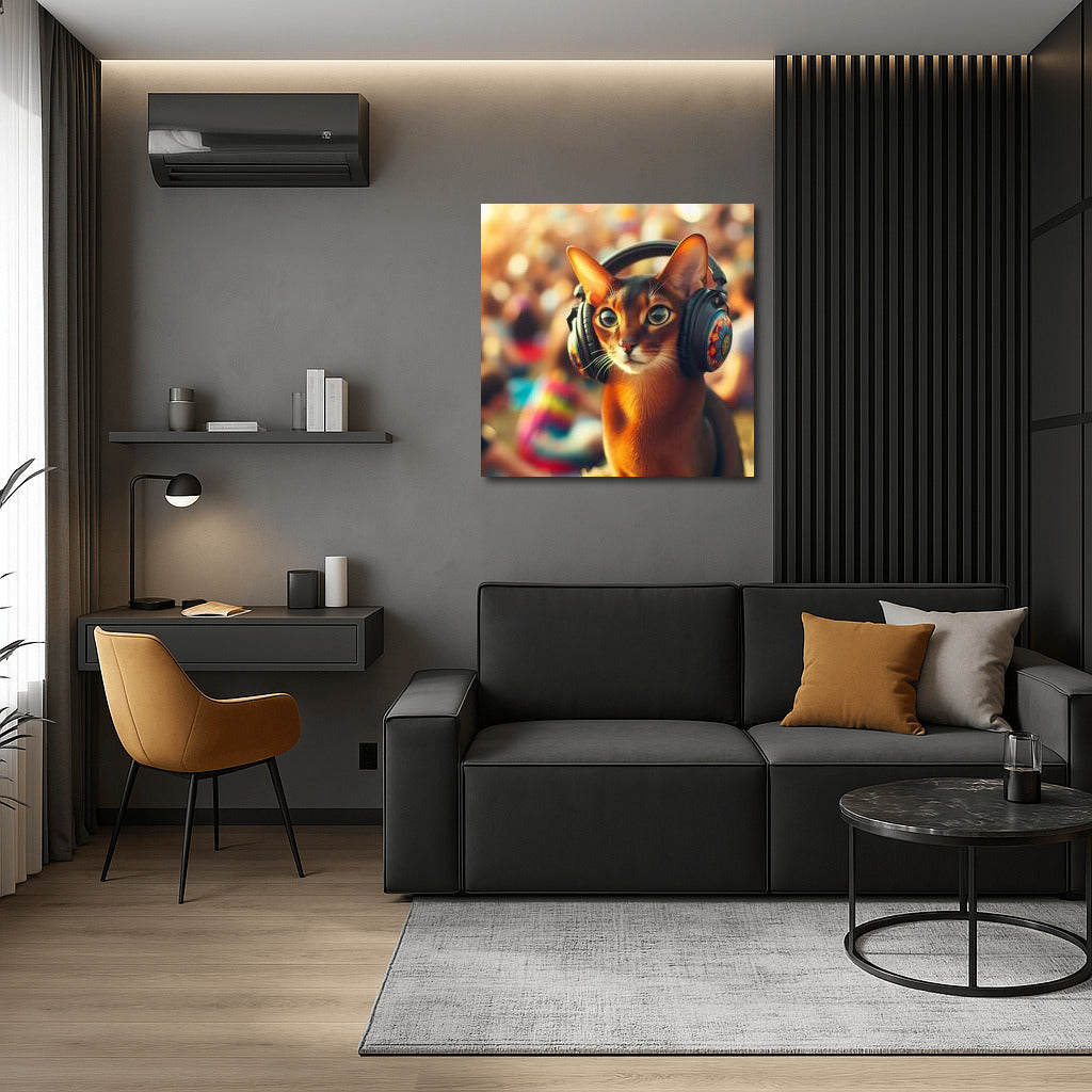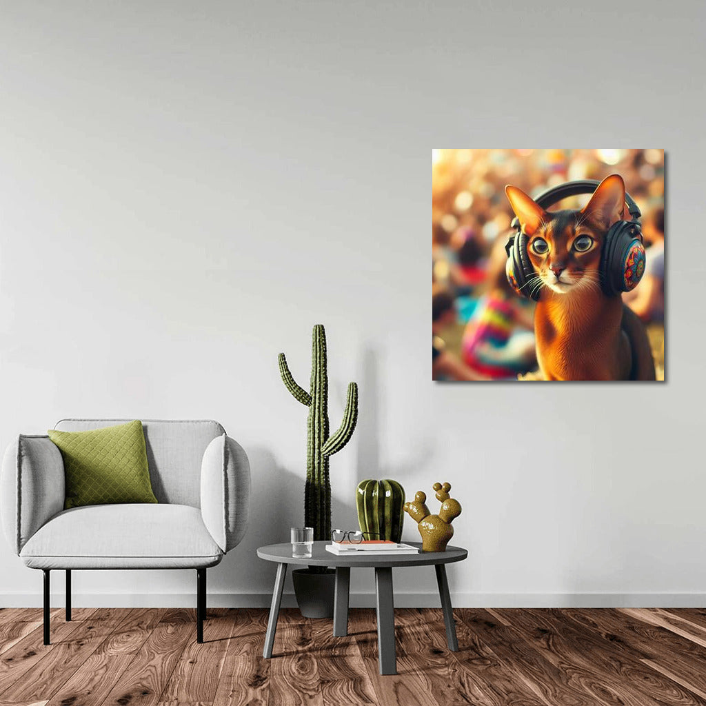 Abyssinian cat at a music festival wearing stylish headphones Wall Art