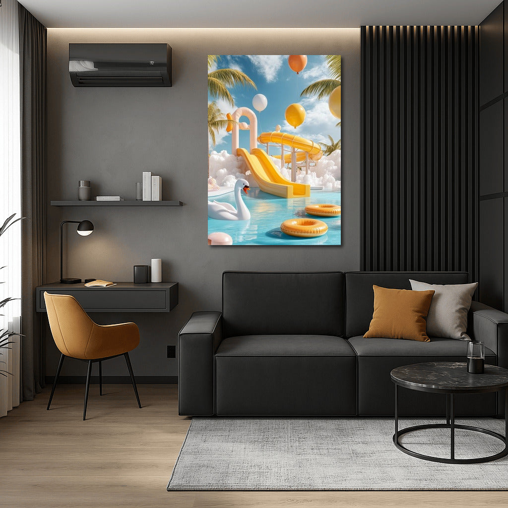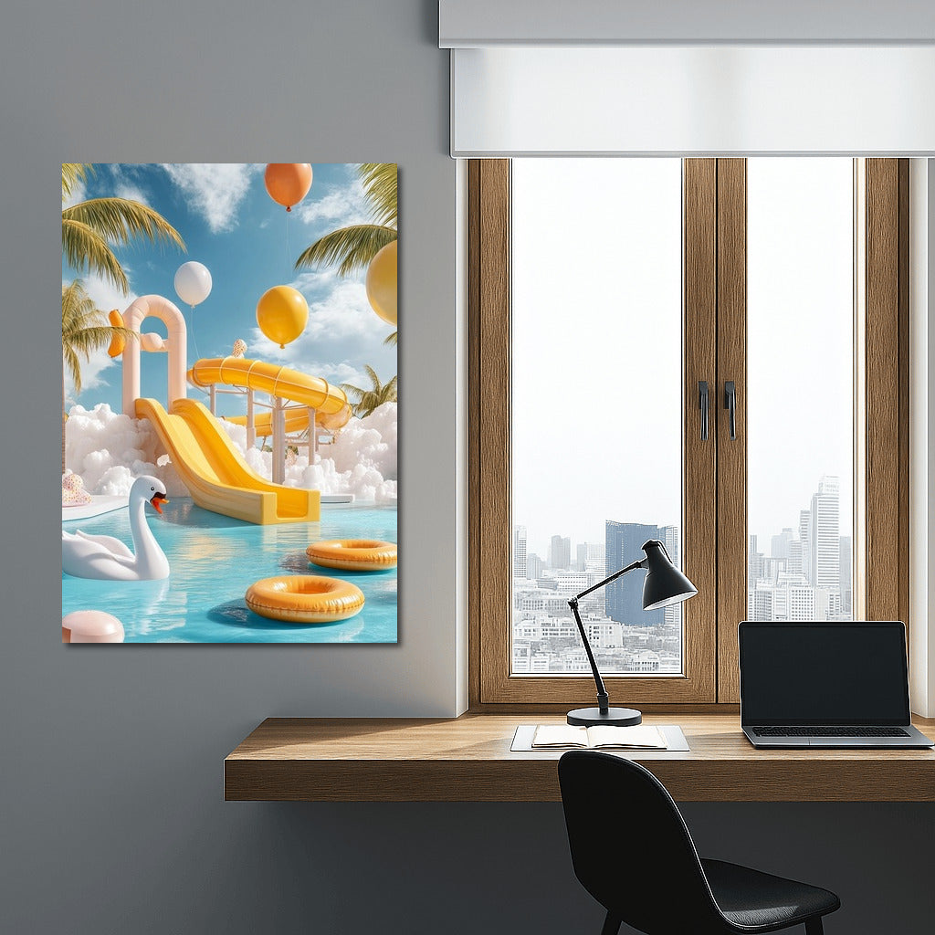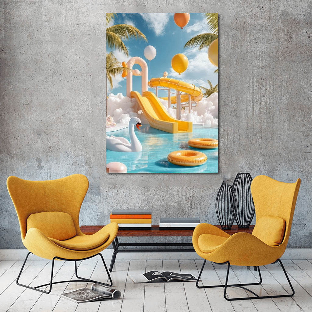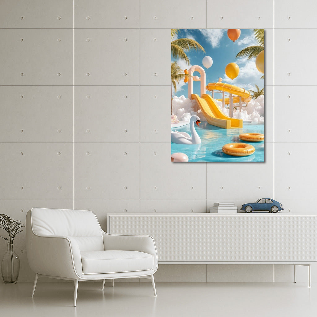 A bright poster with a tropical water park and balloons. Dive into the world of summer fun and serenity! See more from the collection: Mixed Wall Art