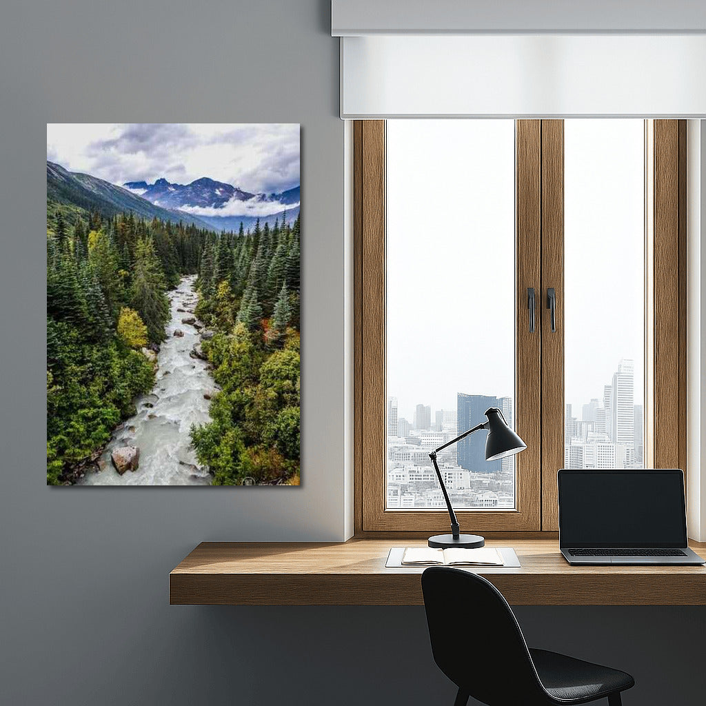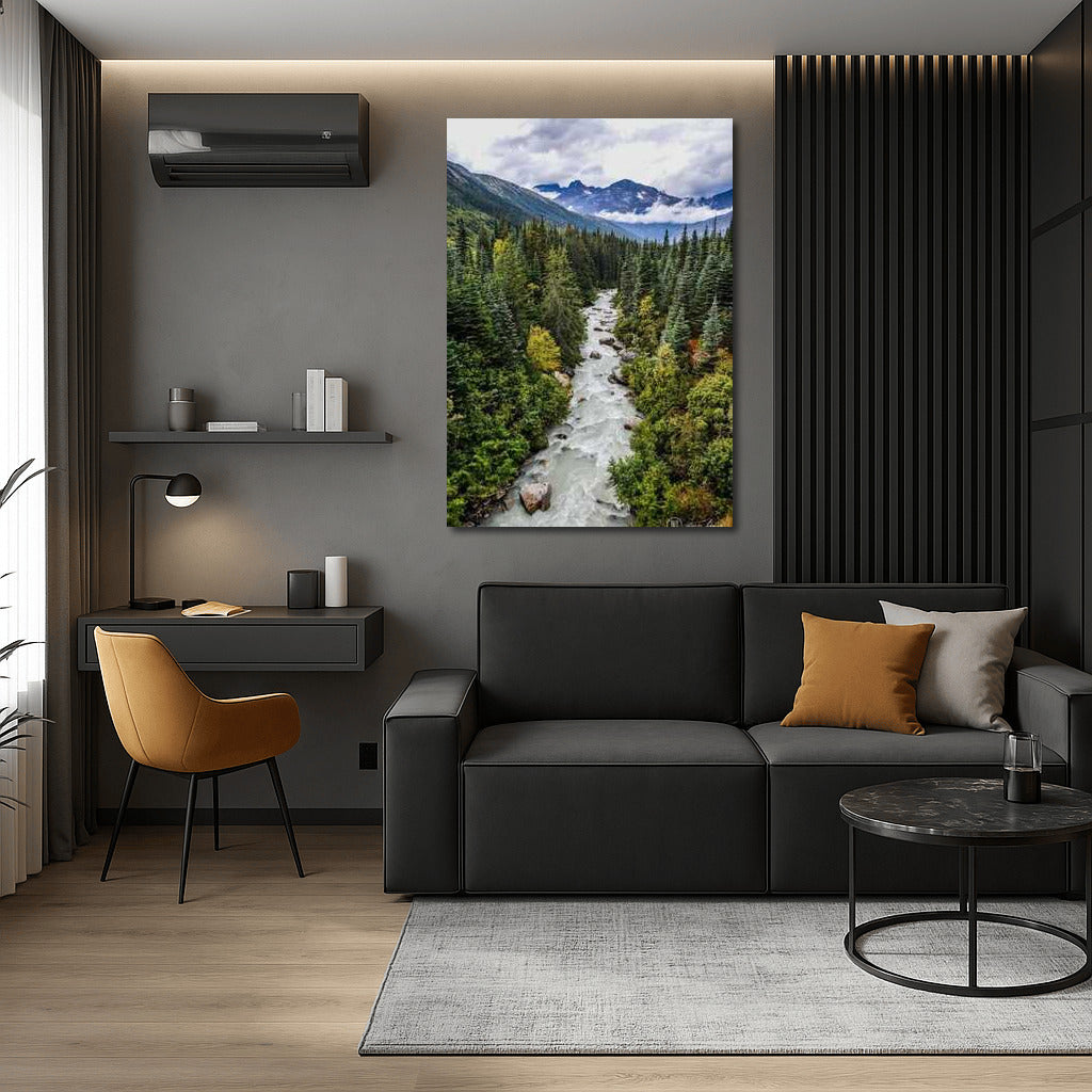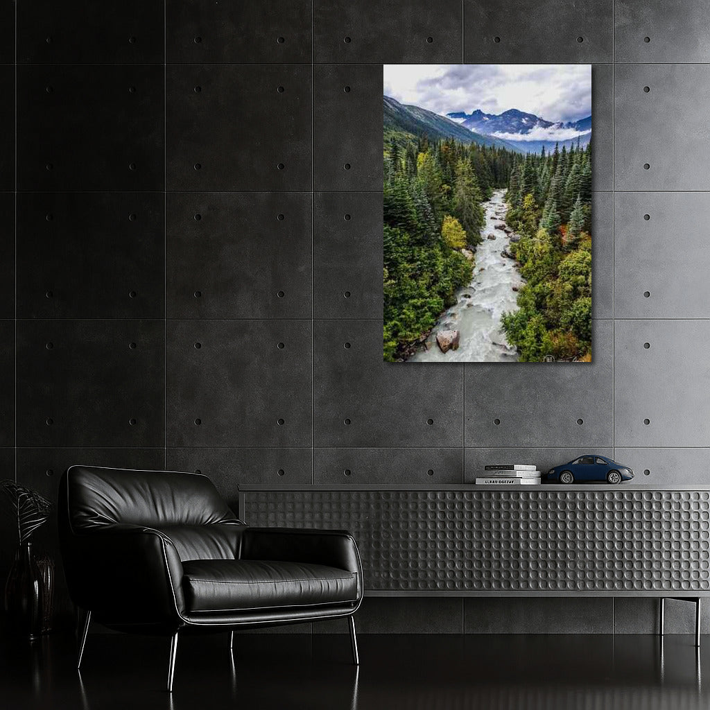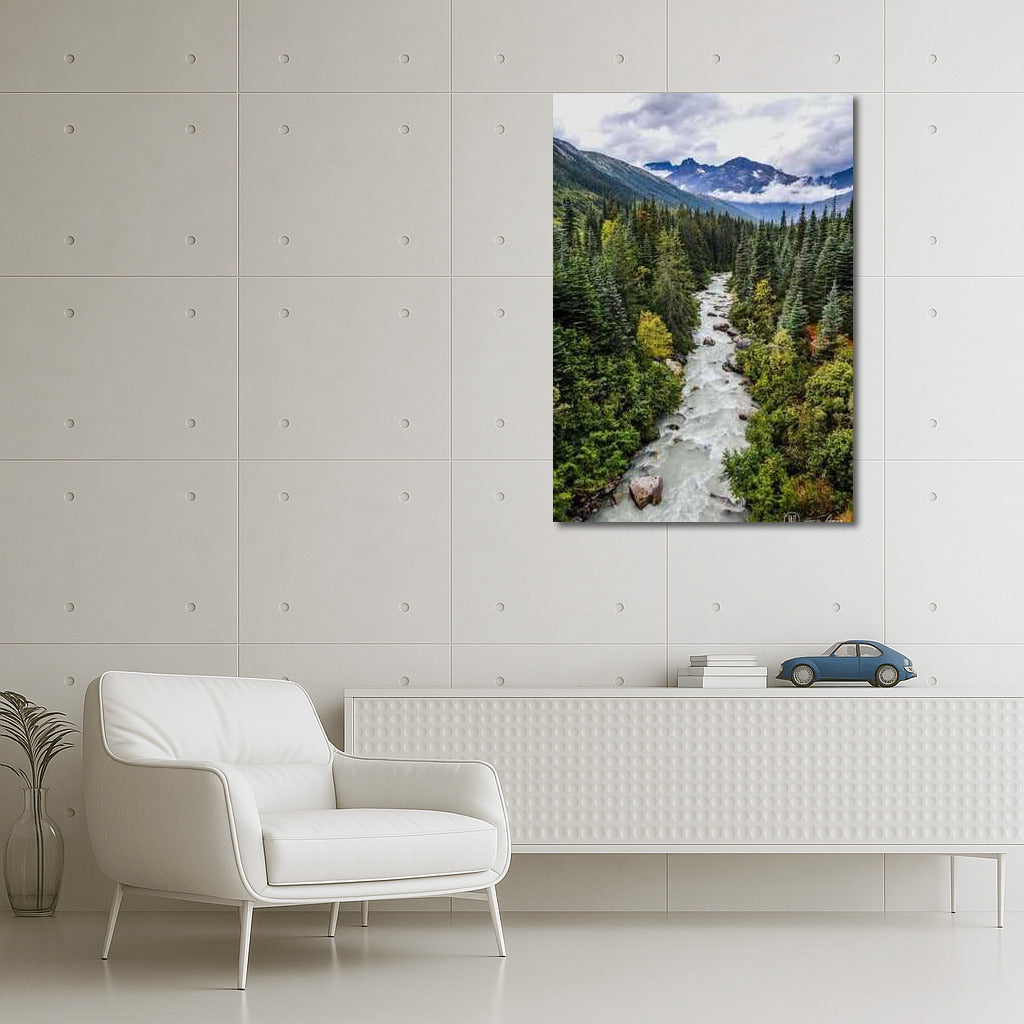 Immerse yourself in the wild charm of Alaska with this painting. A wild river among mountains and forests will bring your wall art to life. See more from the collection: Country Art
