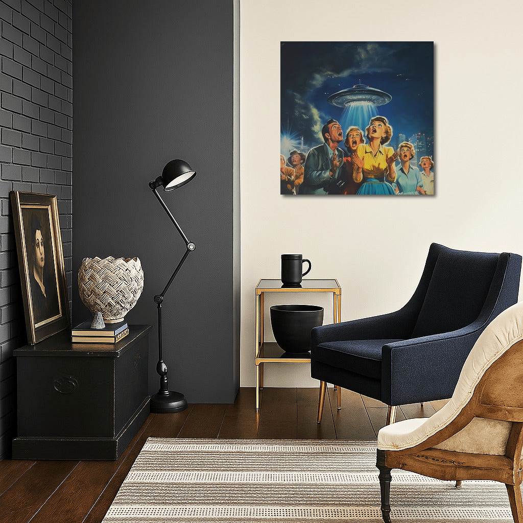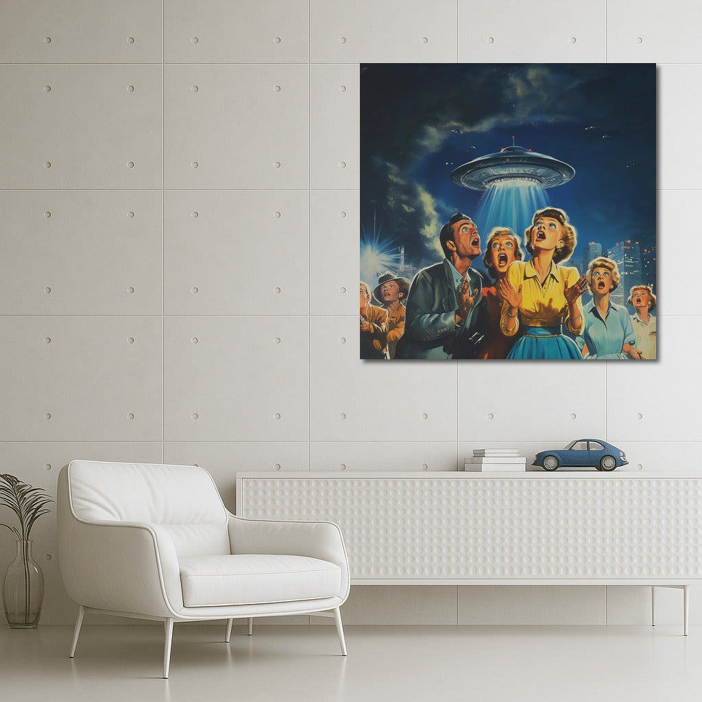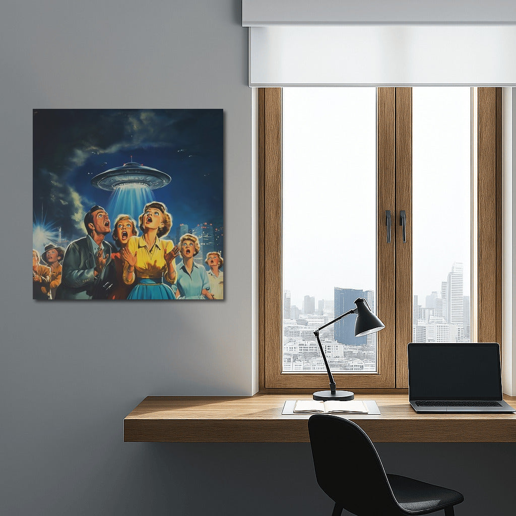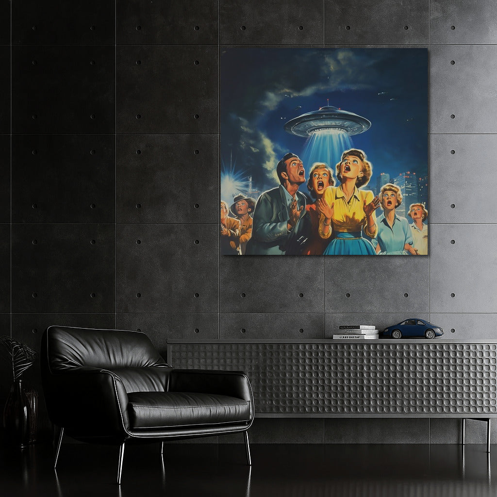 This poster brings the fantasy of the 50s to life: UFOs over the city and amazed looks. Dive into the classics of wall art! See more from the collection: Trippy & Psychedelic Art