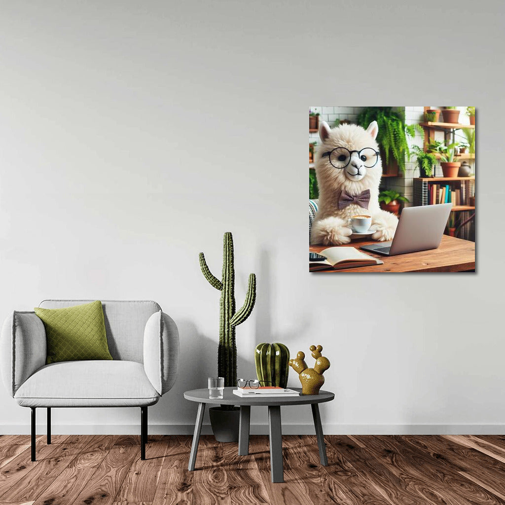 Adorable poster: alpaca in a cafe with a laptop. Perfect wall art for a cozy interior! See more from the collection: Alpaca & Llama Art