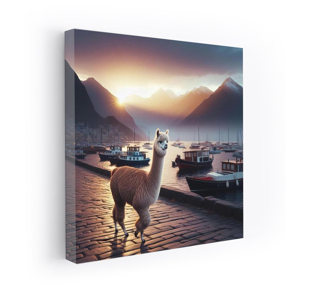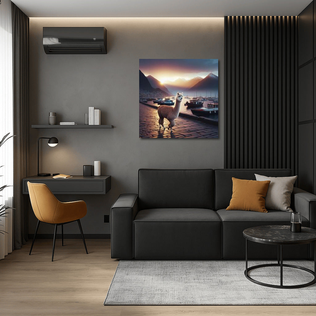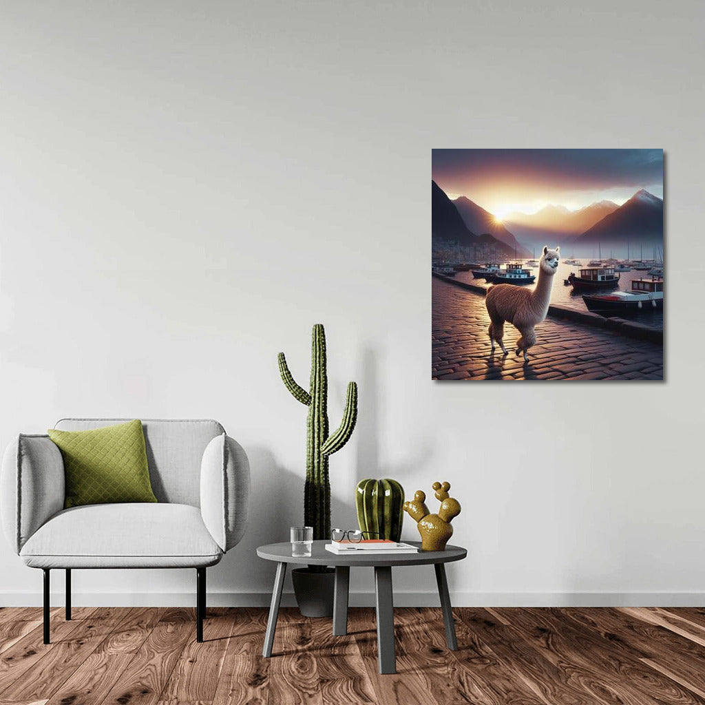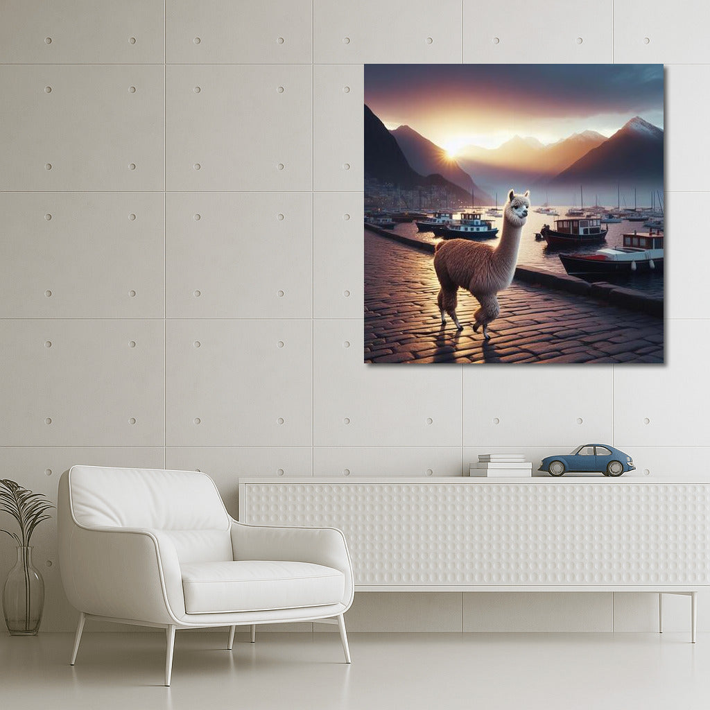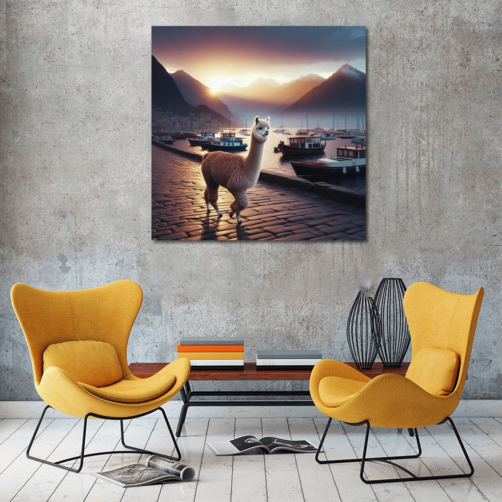 Poster Evening Walk of the Alpaca: the magic of the sunset and the serenity of the embankment, enliven the walls and inspire dreams. See more from the collection: Alpaca & Llama Art