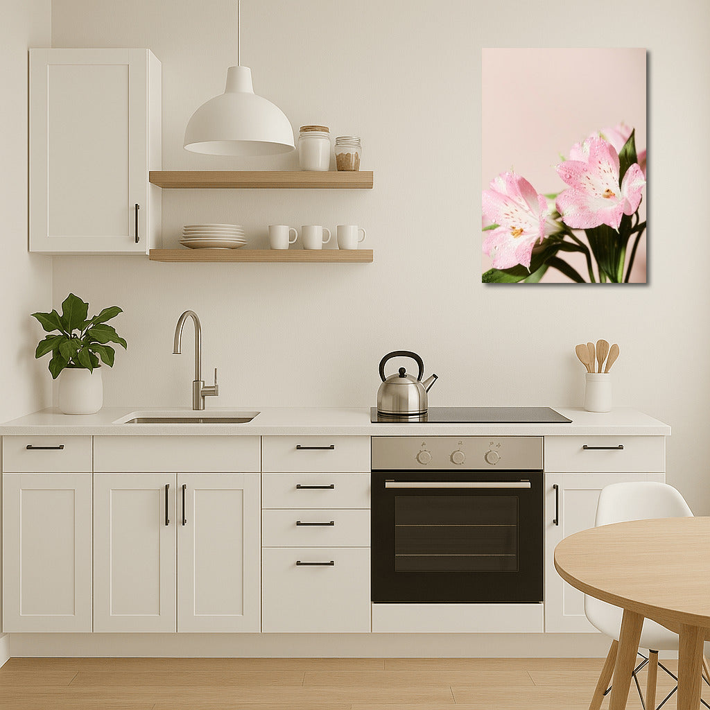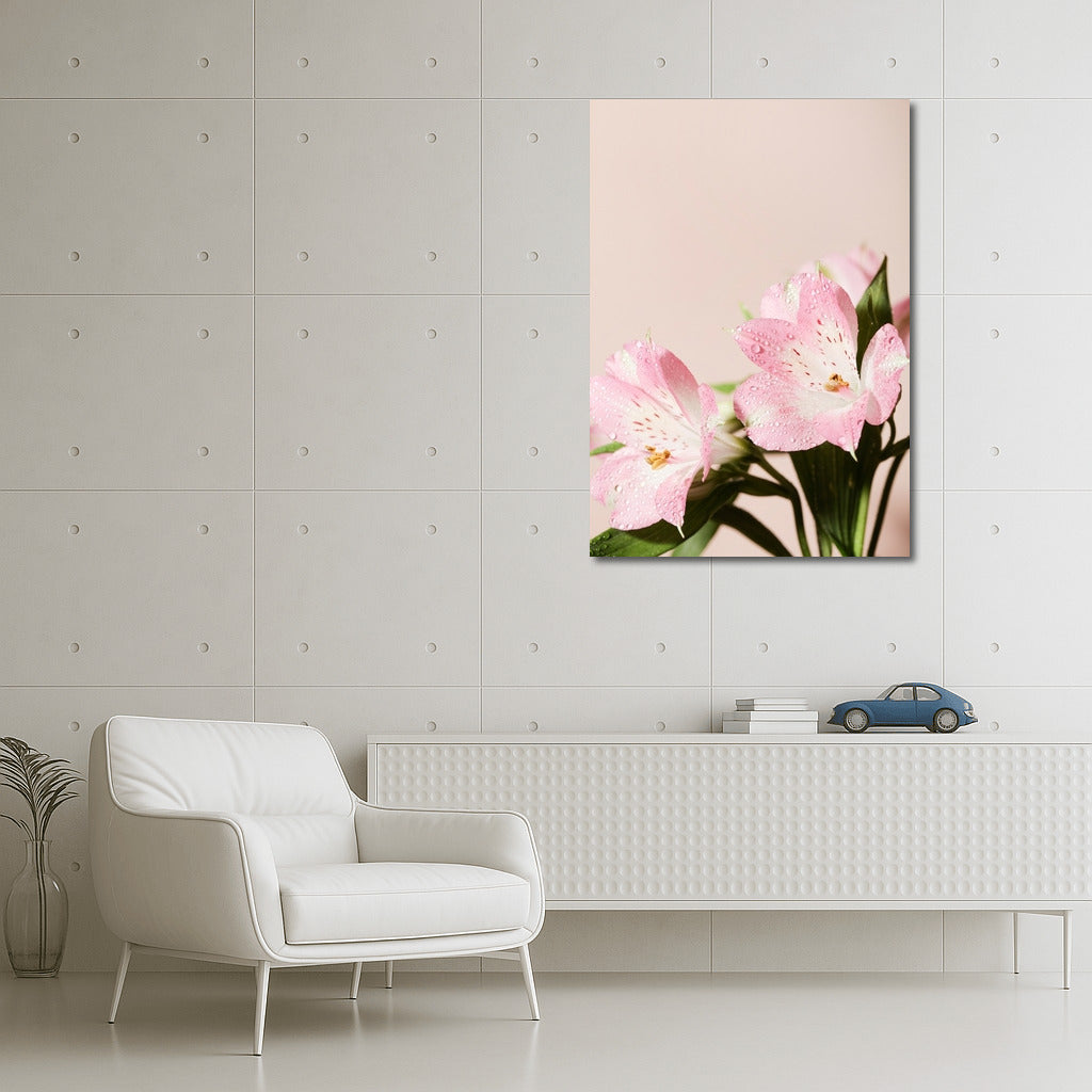Watercolor painting with alstroemeria: the tenderness of pink petals and drops of dew enliven your interior in a unique wall art. See more from the collection: Flowers Art