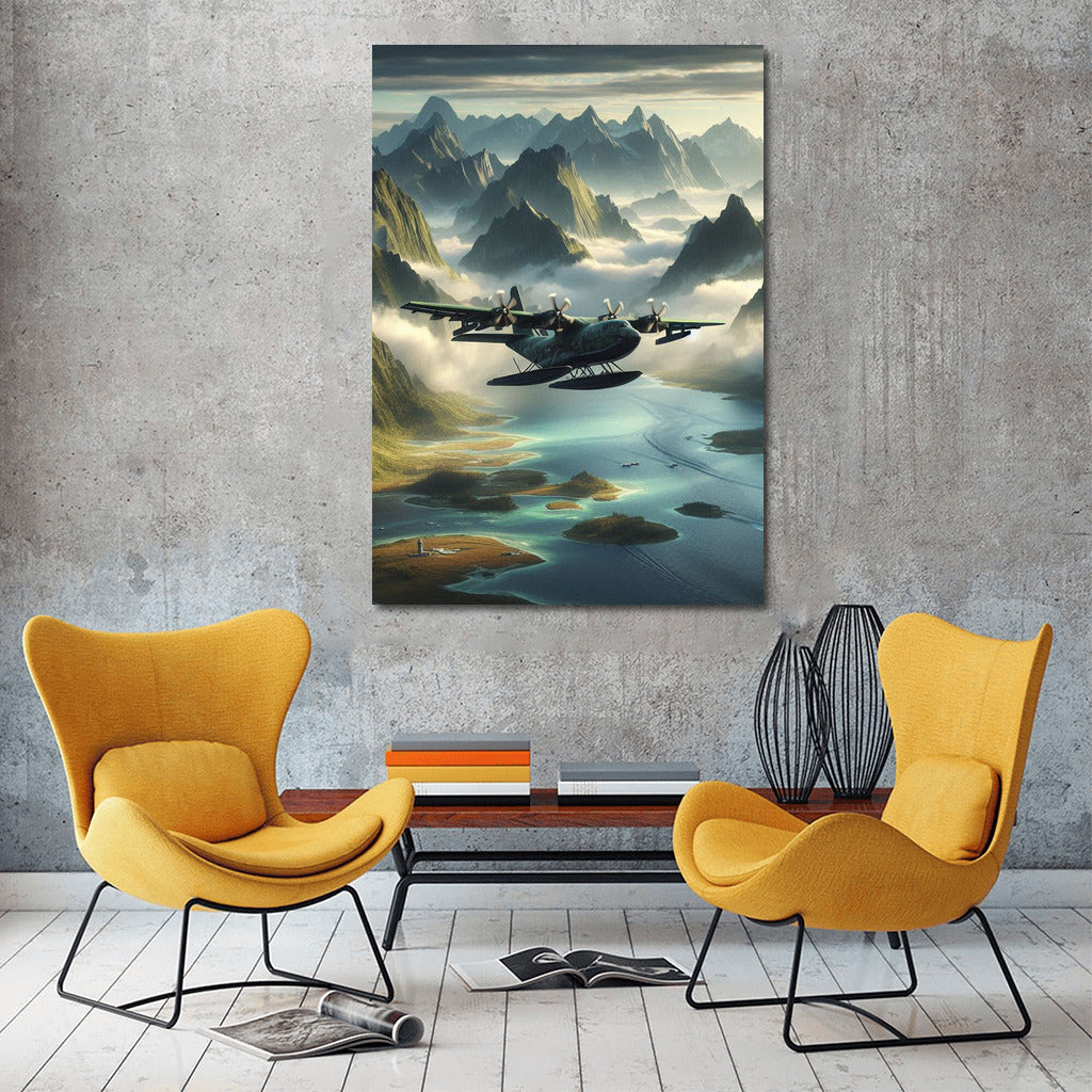 The ease of flight over mountain peaks and the reflection of the sky in the water. Poster with an amphibious plane and a charming landscape. See more from the collection: Airplanes Art