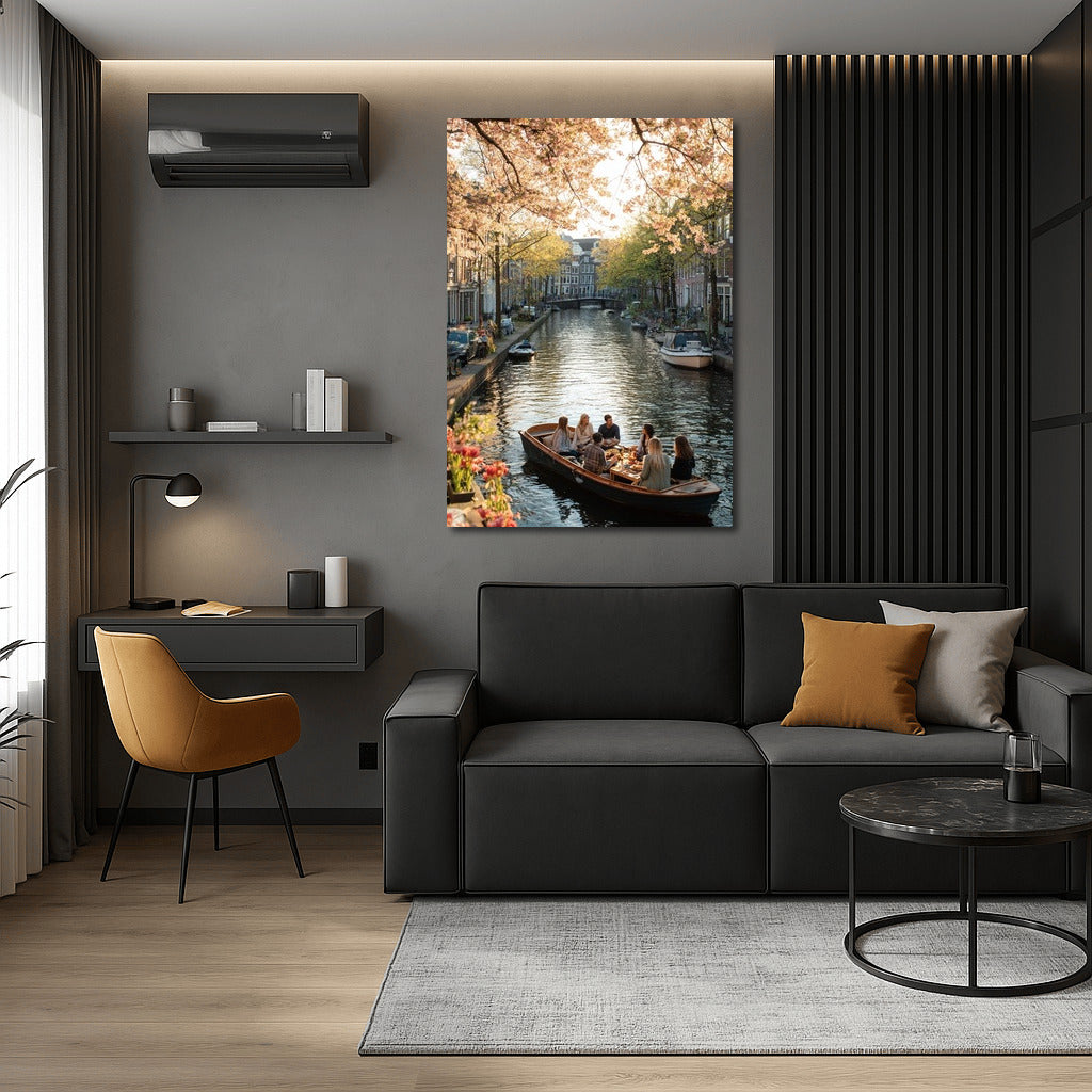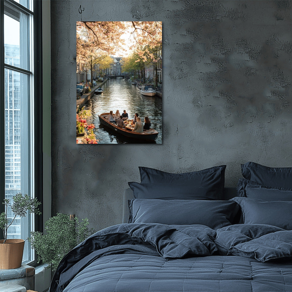 Amsterdam Canal in Spring: Blooming Trees and Boats Wall Art