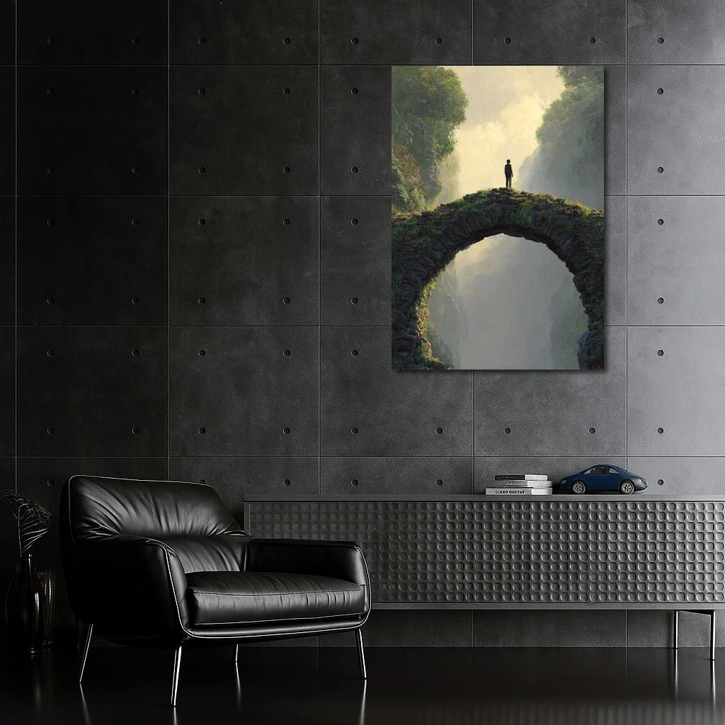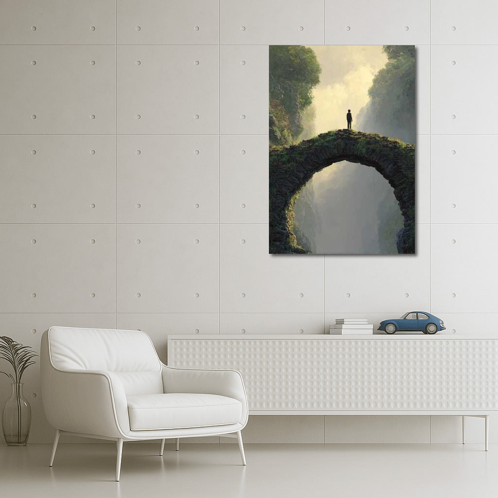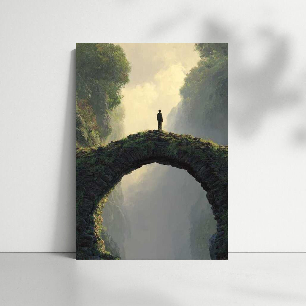 Take a dreamy journey through this poster where a figure stands on an ancient bridge, combining architectural mystery and nature. See more from the collection: Architectural Art