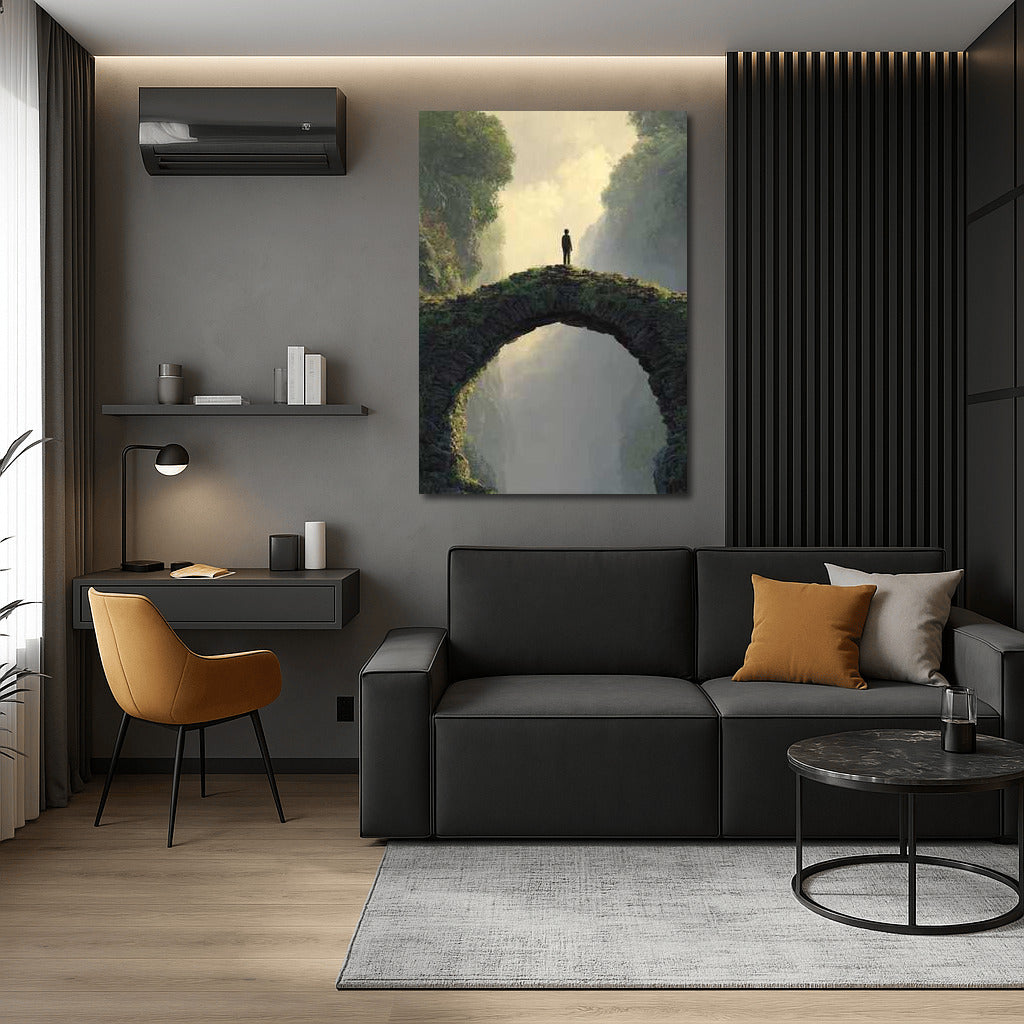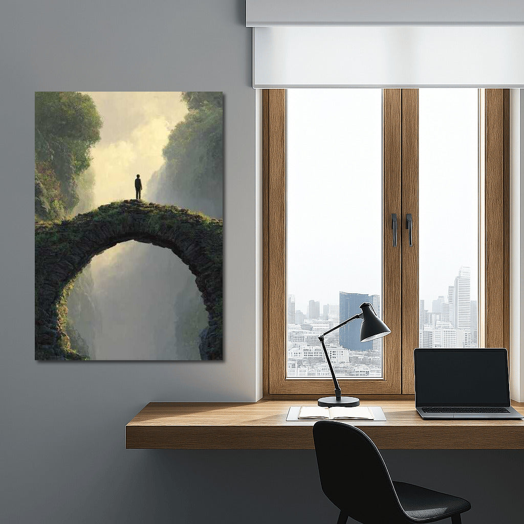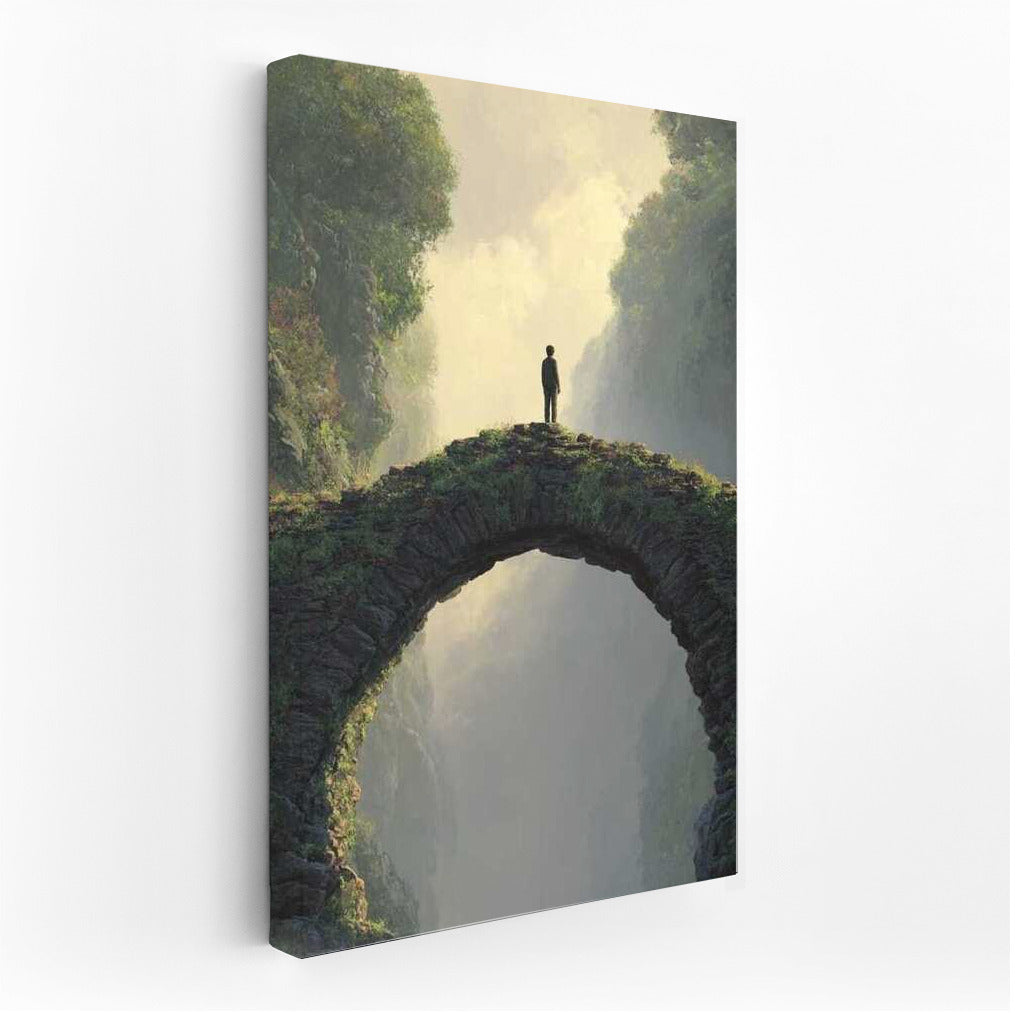 Take a dreamy journey through this poster where a figure stands on an ancient bridge, combining architectural mystery and nature. See more from the collection: Architectural Art