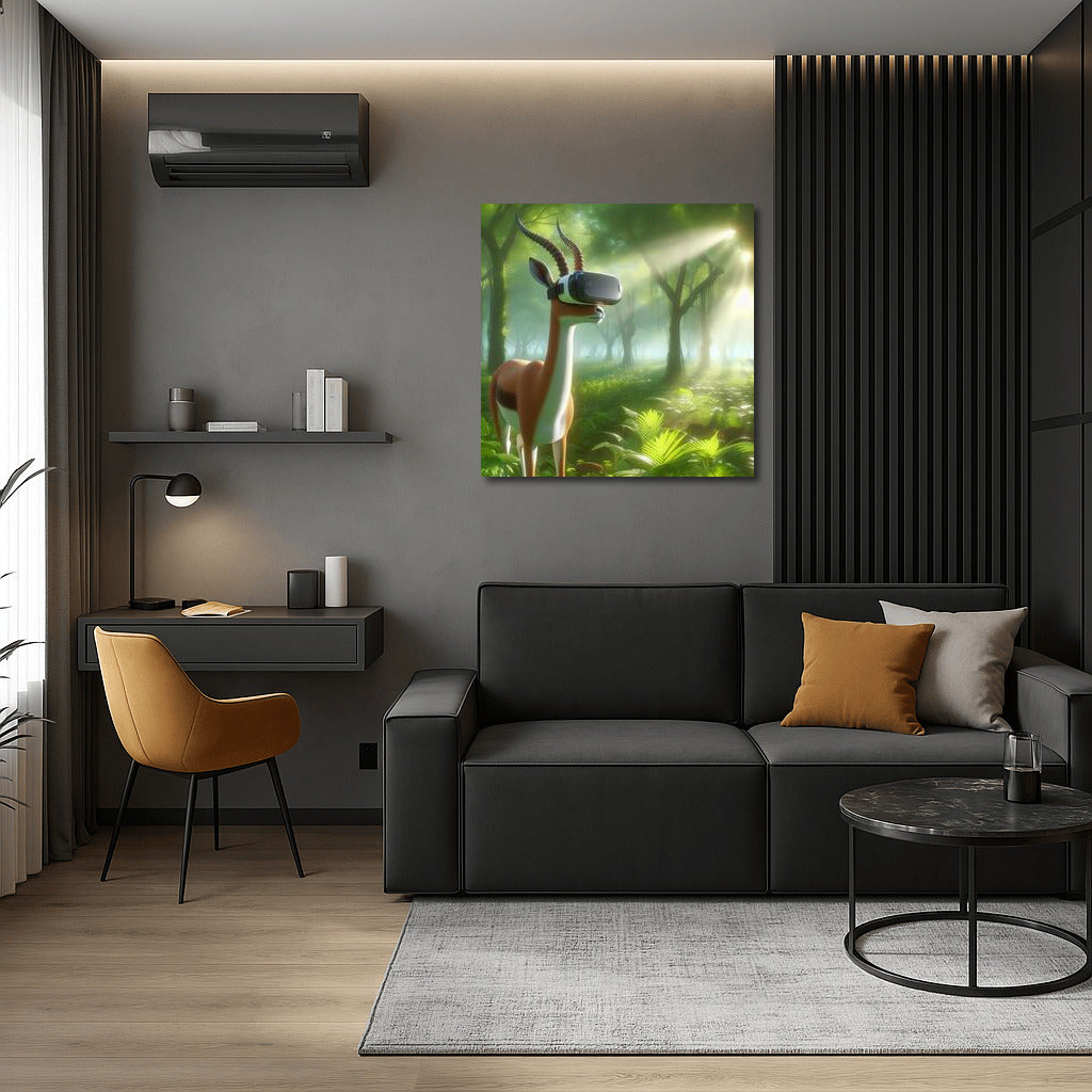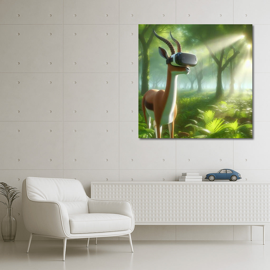This poster features an antelope in virtual reality walking through the forest. Open the doors to a fantasy world with wall art! See more from the collection: Animals Art