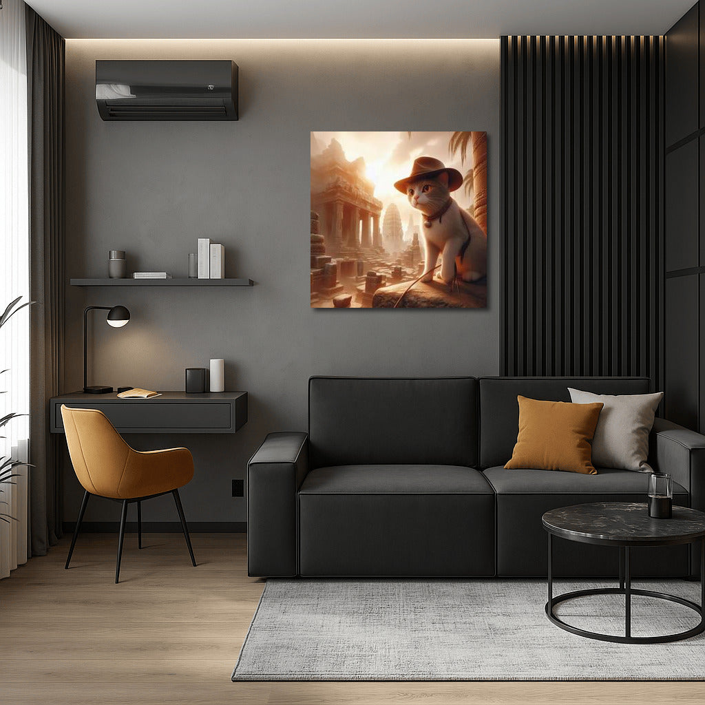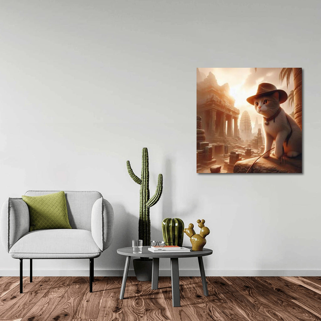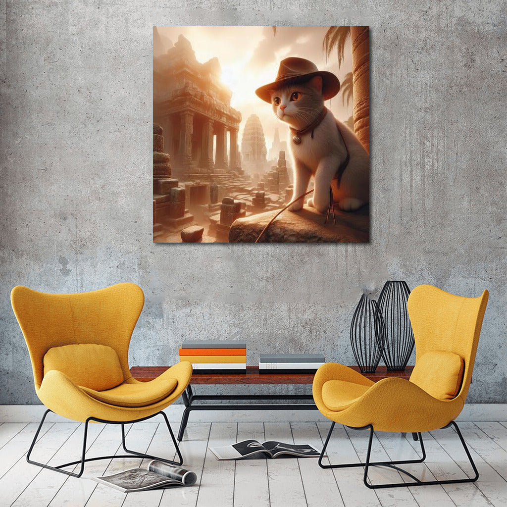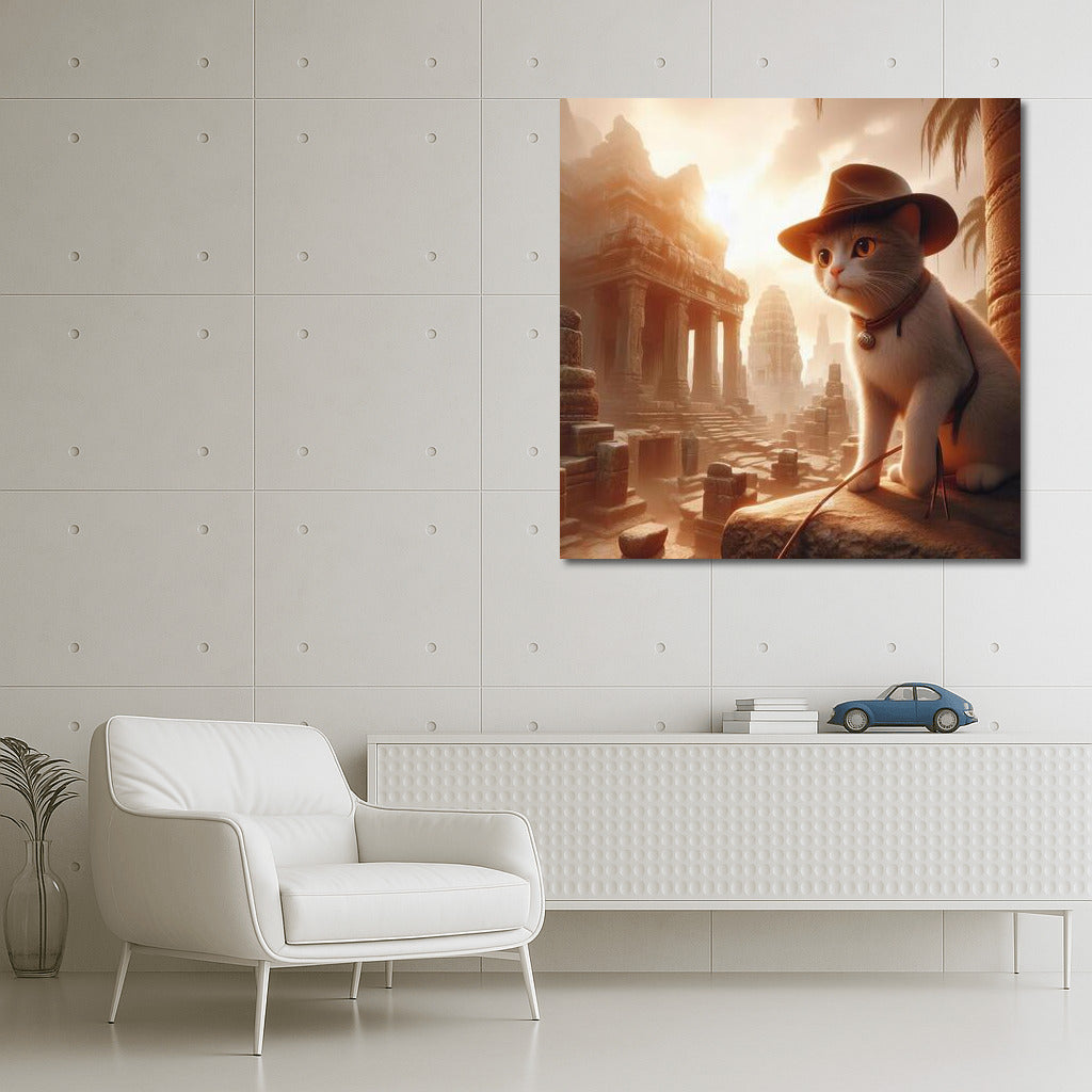 Indiana Jones style cat explores ancient ruins. Wall poster for adventure and mystery lovers! See more from the collection: Animals Art