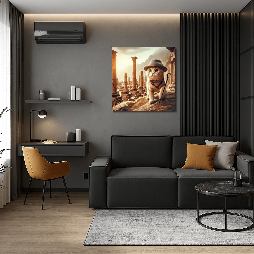 Indiana Jones style cat explores ancient ruins. Perfect poster for adventure and mystery lovers! ??️ See more from the collection: Animals Art