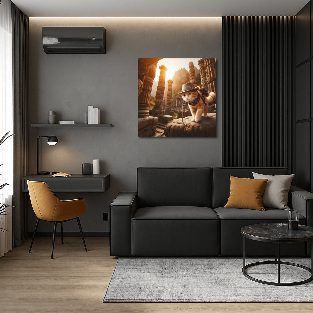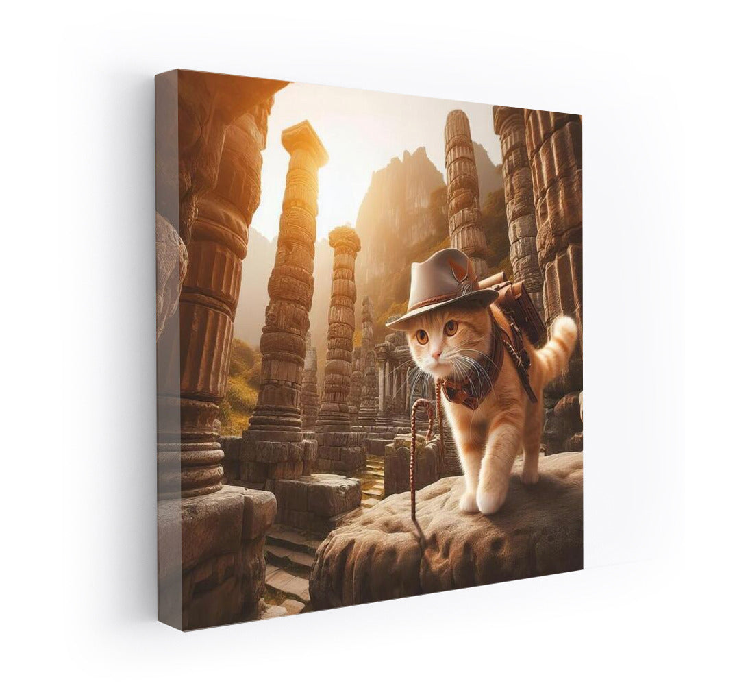 Indiana Jones style cat: hat, whip, ancient ruins. Wall art full of adventure and charm! See more from the collection: Animals Art