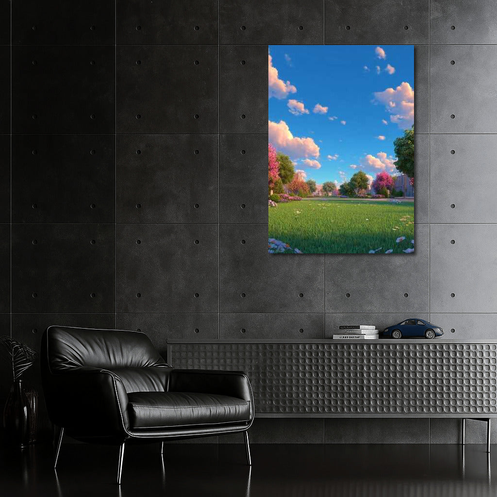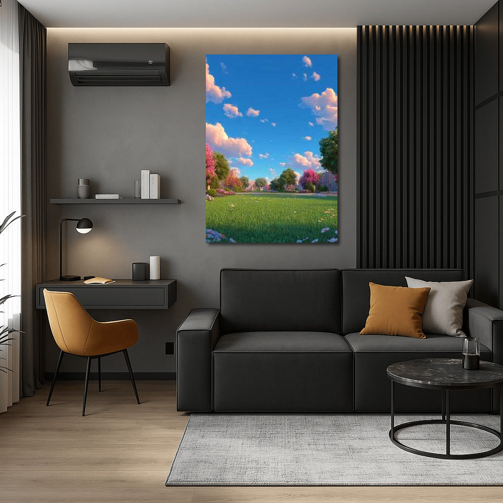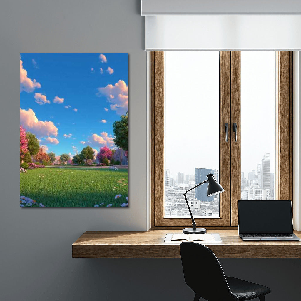 Vibrant wall art with the architectural charm of parks where clouds float over green expanses and flowering trees. See more from the collection: Architectural Art