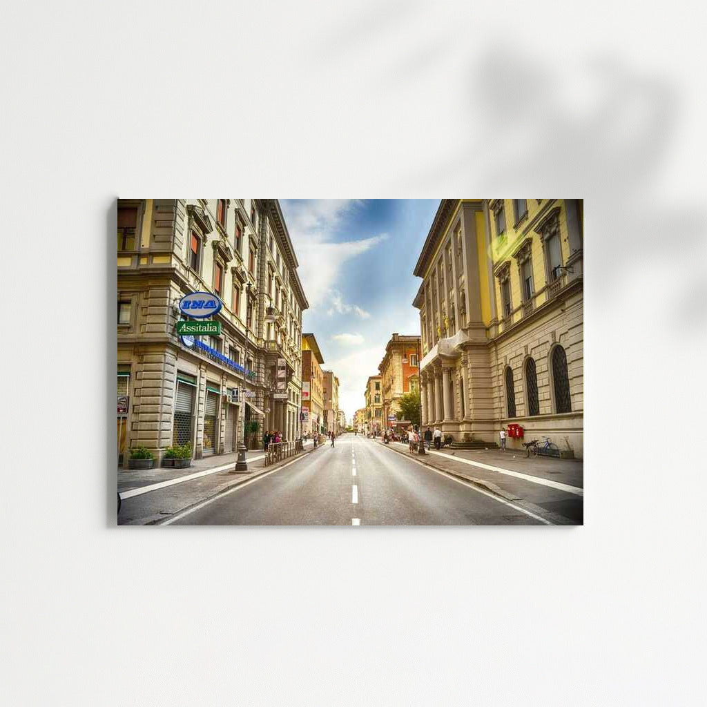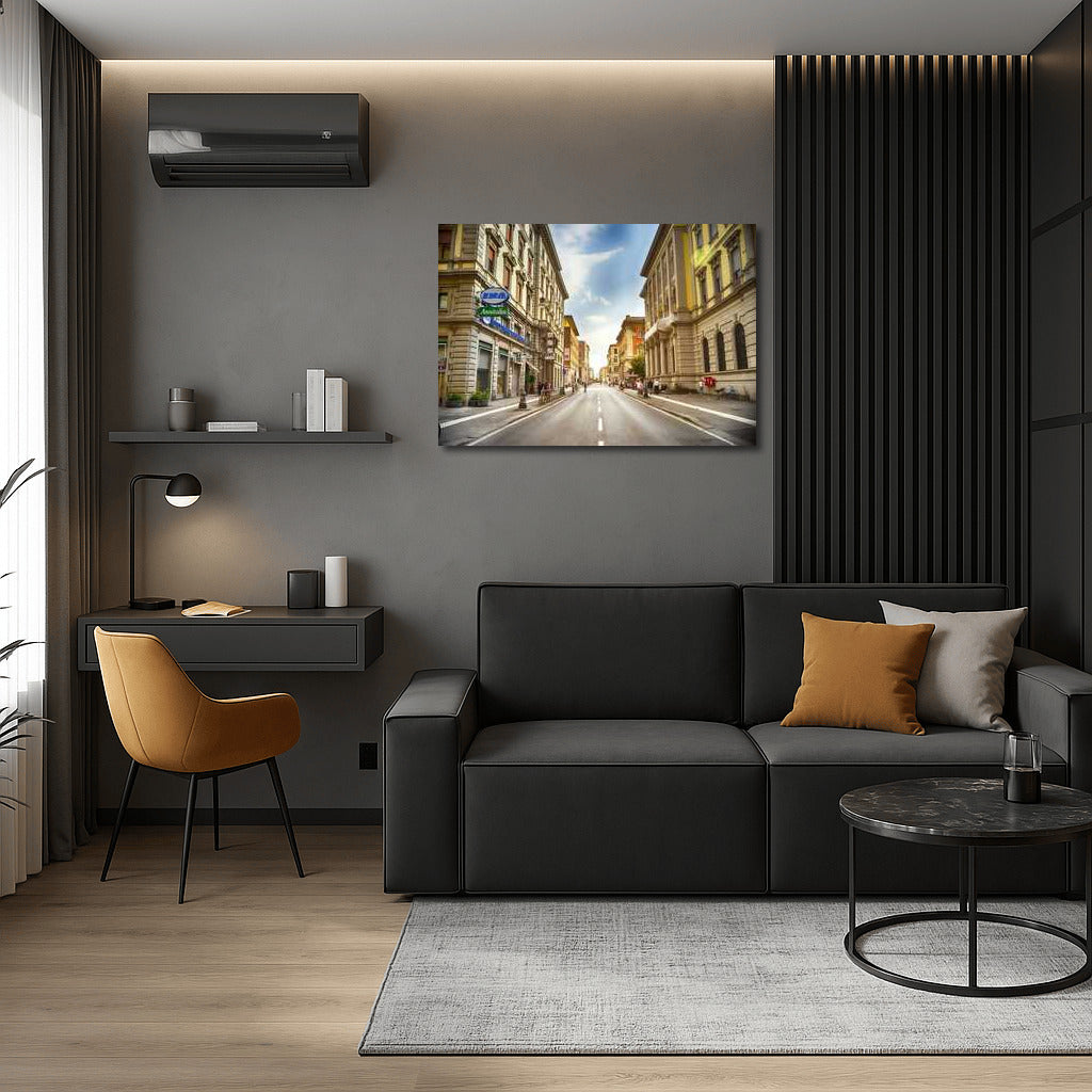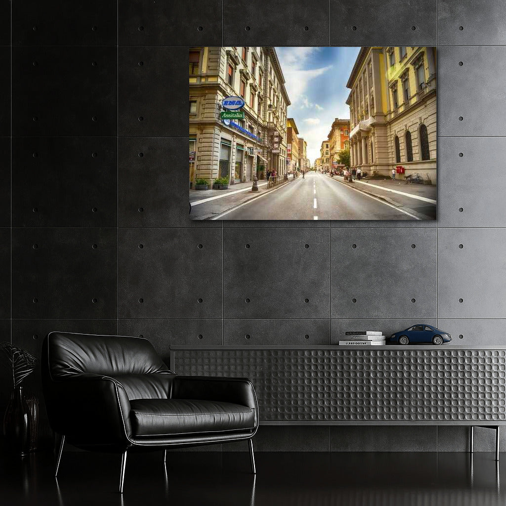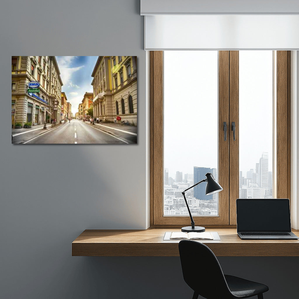 Elegant wall art: a city street comes alive with architectural harmony, giving the feeling of traveling through time. See more from the collection: Architectural Art