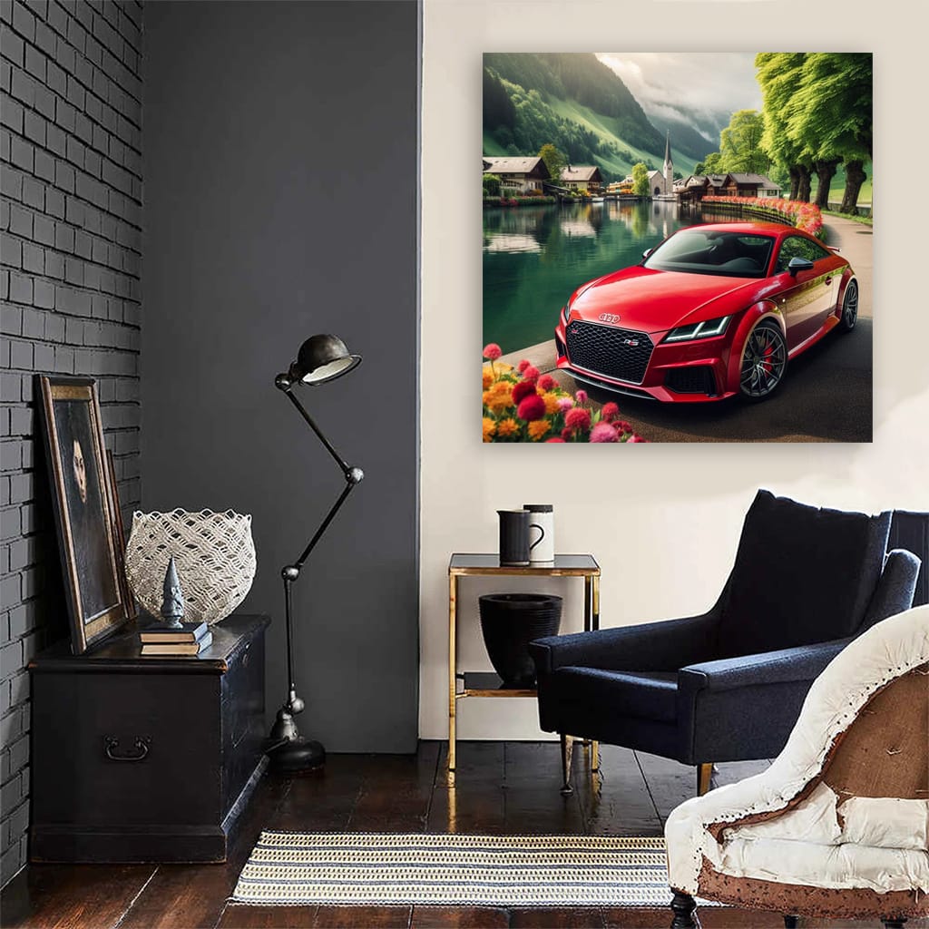 Here's a poster of an Audi TT RS against a river - pure adrenaline on the wall! This piece of wall art is perfect for guys who breathe cars. The painting seems to rumble with an engine and call to the track. Take a look - and you can already hear the roar of the turbine! See more from the collection: Audi Art
