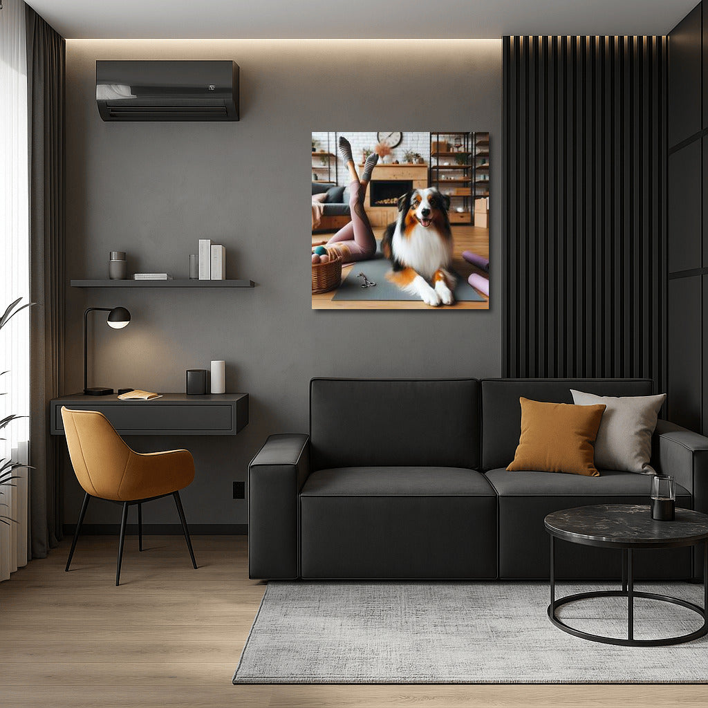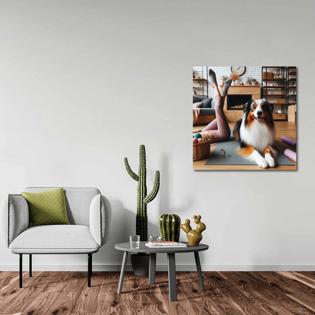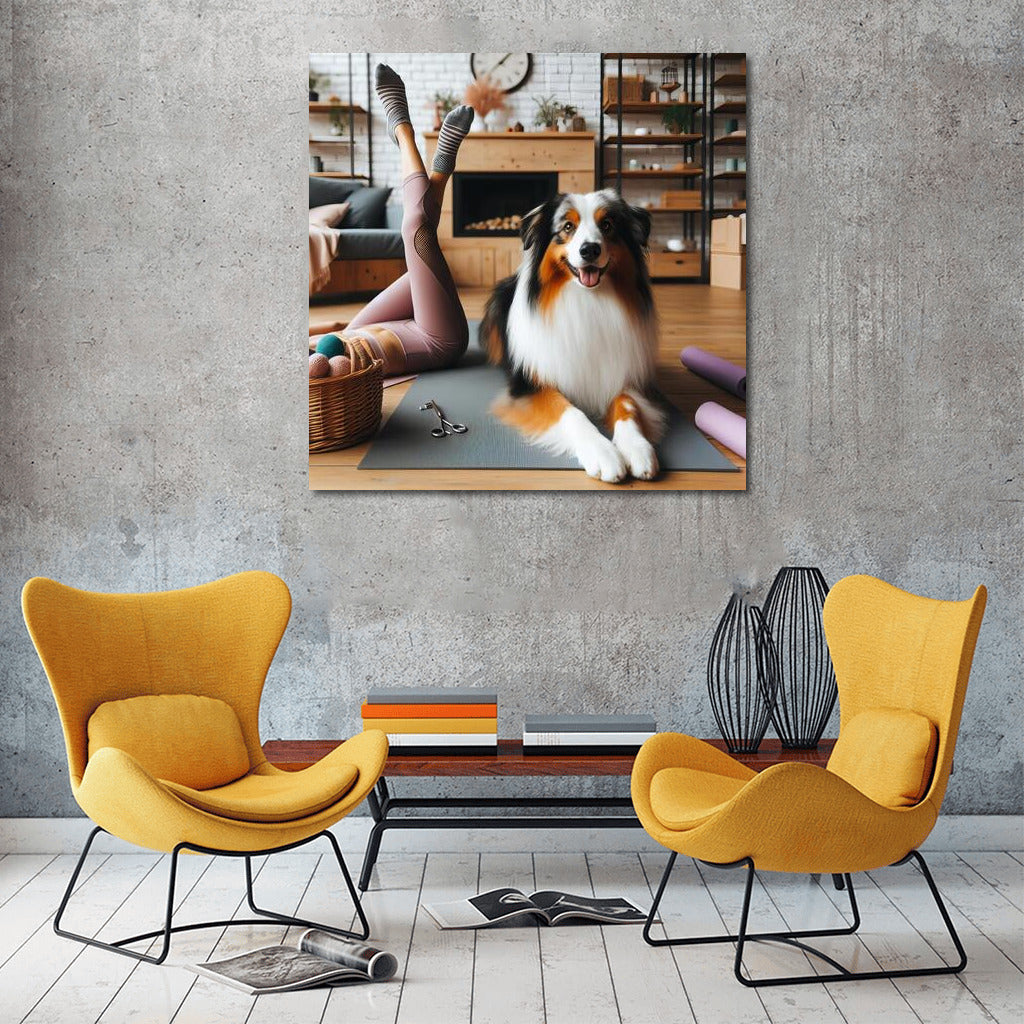 Australian Shepherd poster in a yoga studio: harmony of movement and comfort. Perfect wall art for inspiration! See more from the collection: Animals Art