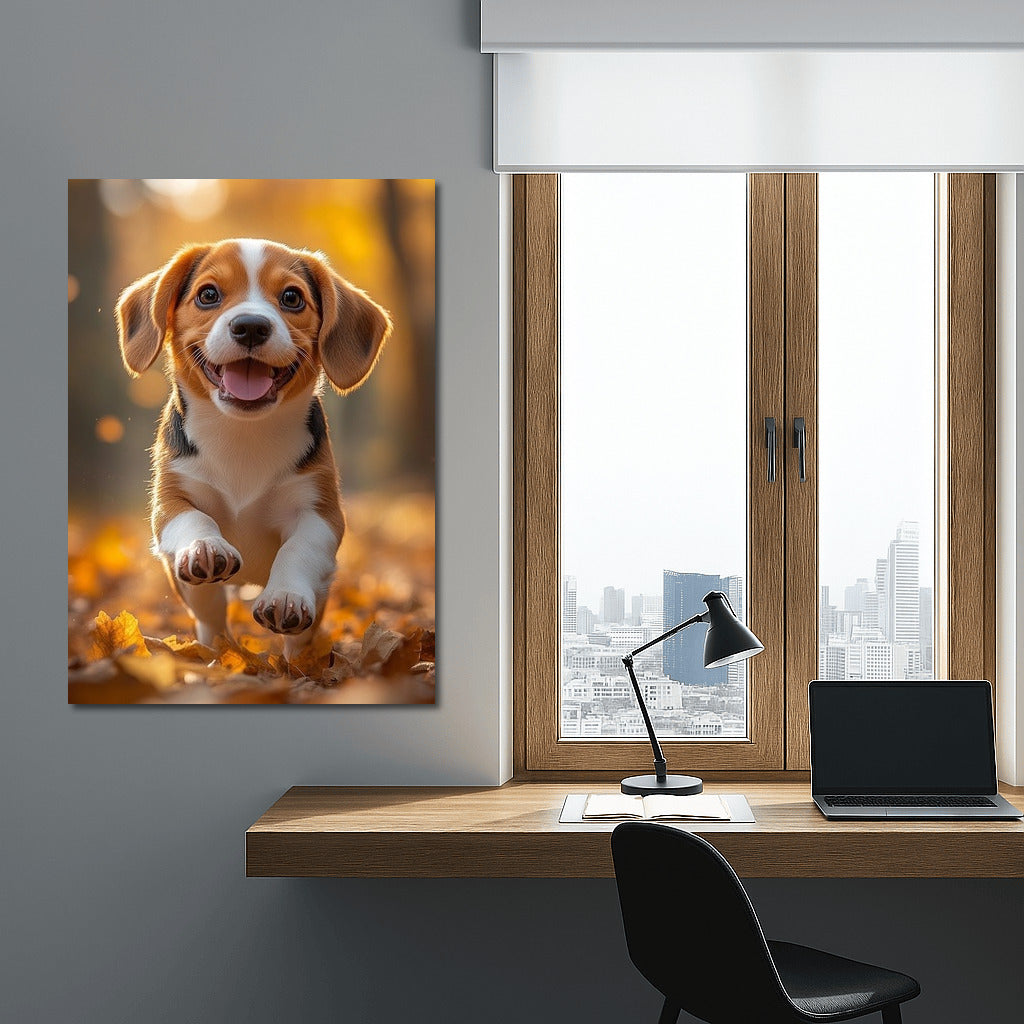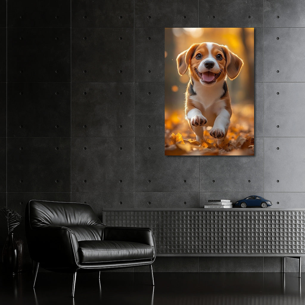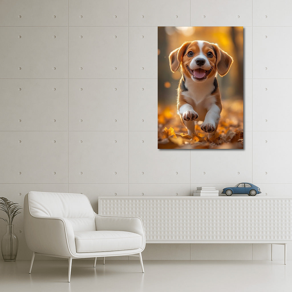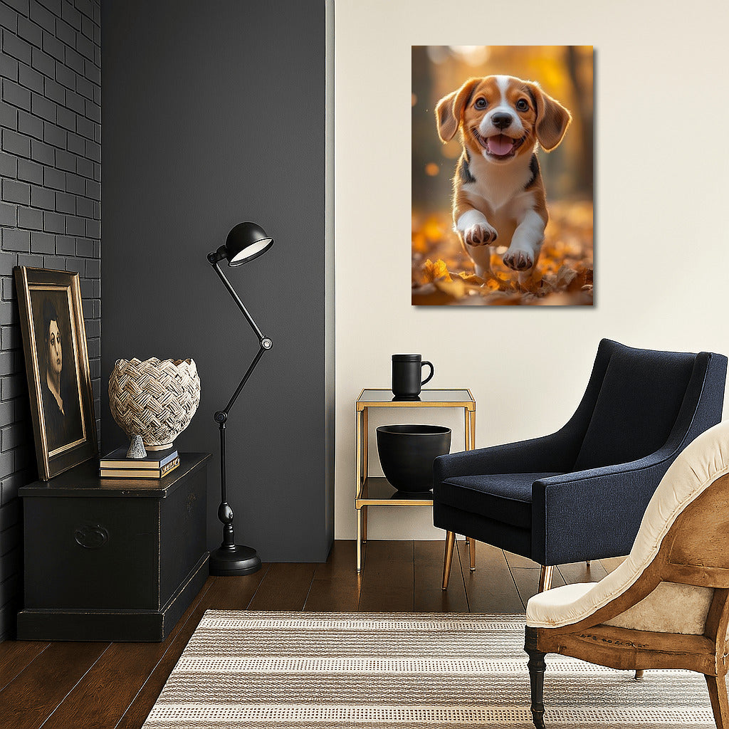 Add a cozy touch to your space with this cheerful painting of a puppy frolicking in an autumn forest. Wall art that is full of joy! See more from the collection: Animals Art