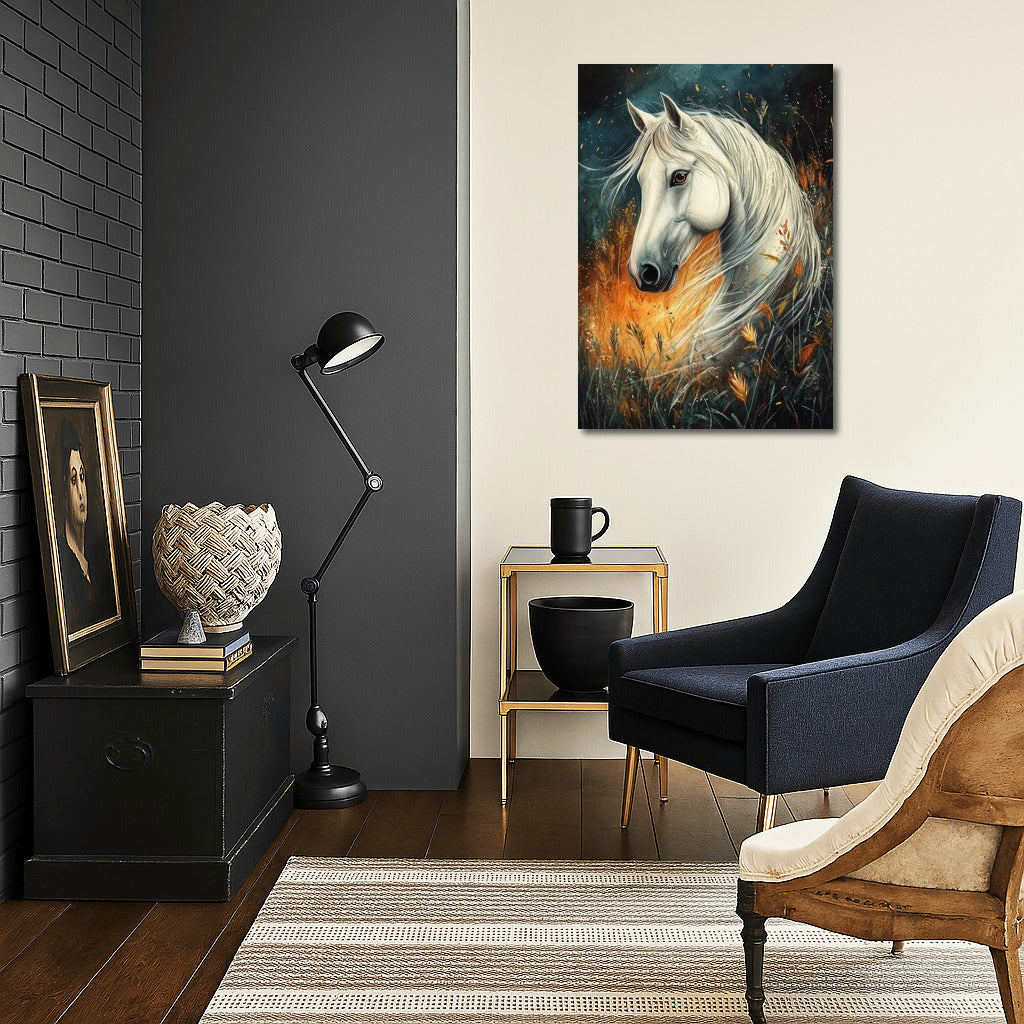 Magical poster: a graceful white horse in a whirlwind of autumn colors. Wall art that brings life to any space. See more from the collection: Animals Art