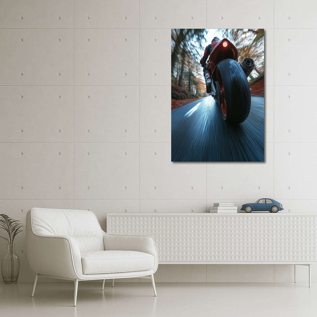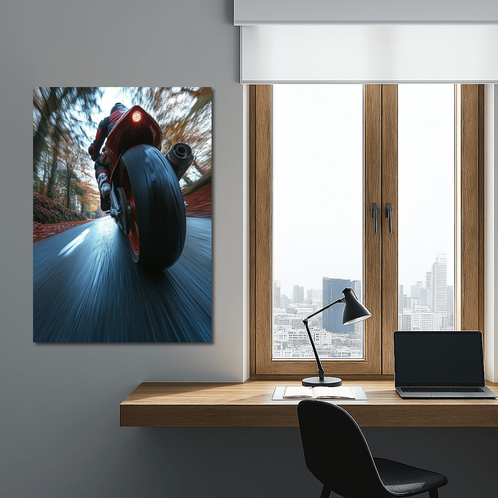 Race towards your dreams with this dynamic poster: the art of speed on a Ducati bike in the swirl of an autumn forest.