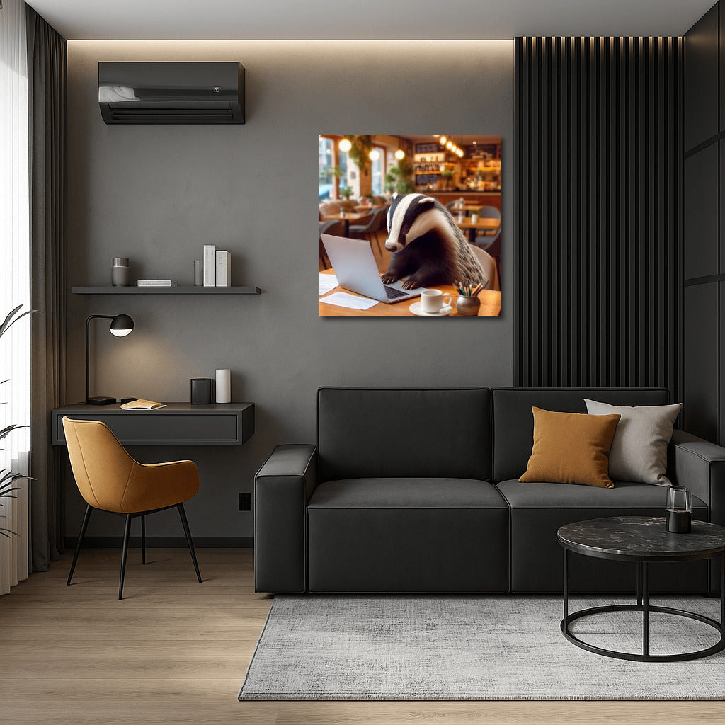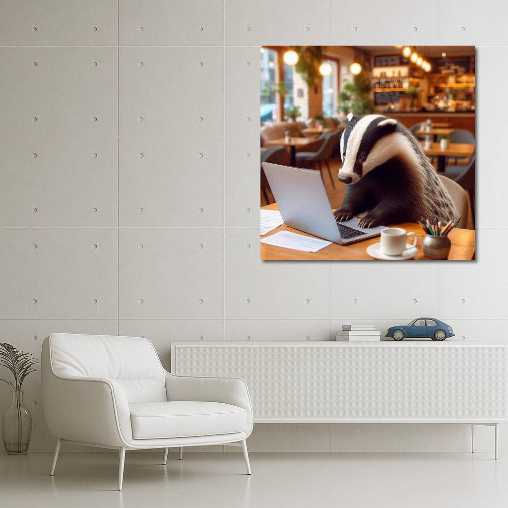 Badger at Work: Cozy Cafe and Laptop Wall Art