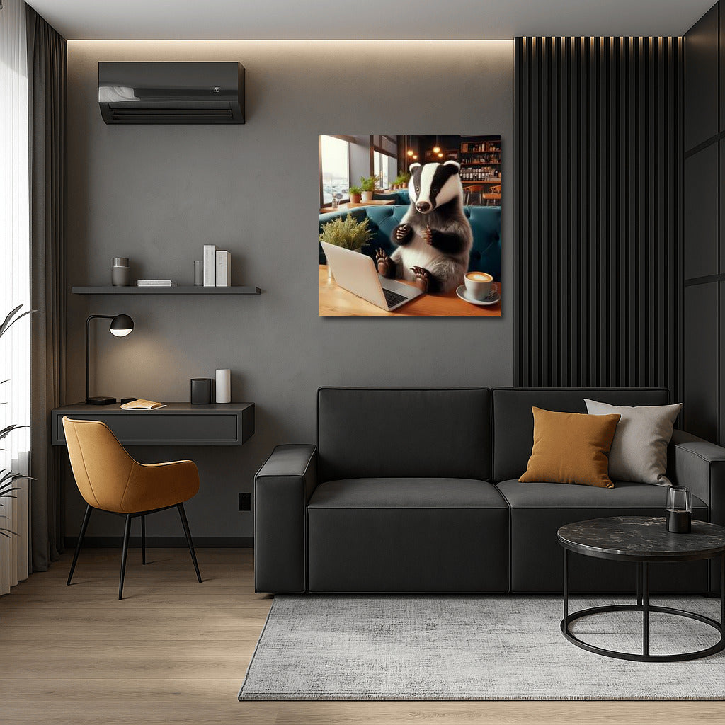Badger in a cafe with a laptop: unique wall art that combines nature and modernity. Perfect for a creative space! See more from the collection: Animals Art