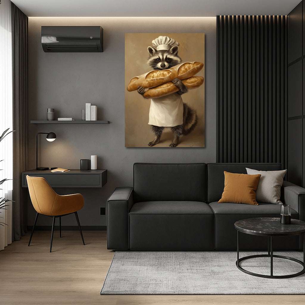 This adorable raccoon baker with baguettes is the perfect poster for your kitchen. Add humor and coziness to your home wall art! See more from the collection: Mixed Wall Art