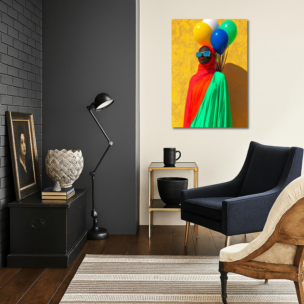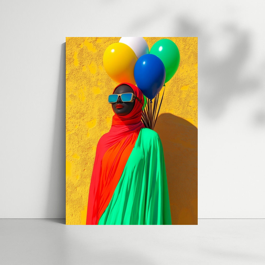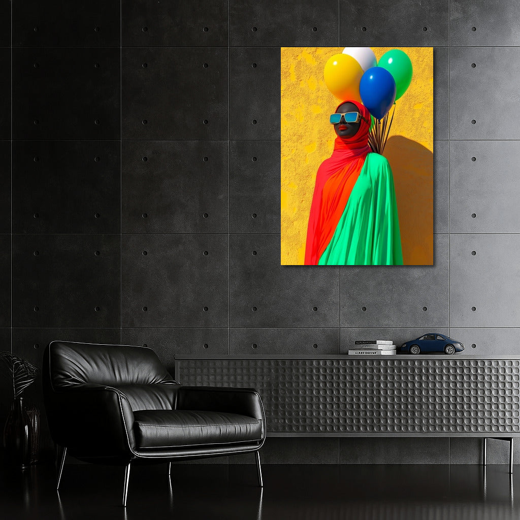 A bright poster: a mysterious figure in stylish glasses against a cheerful wall, surrounded by colorful balls. Wall art that enlivens the interior. See more from the collection: Mixed Wall Art