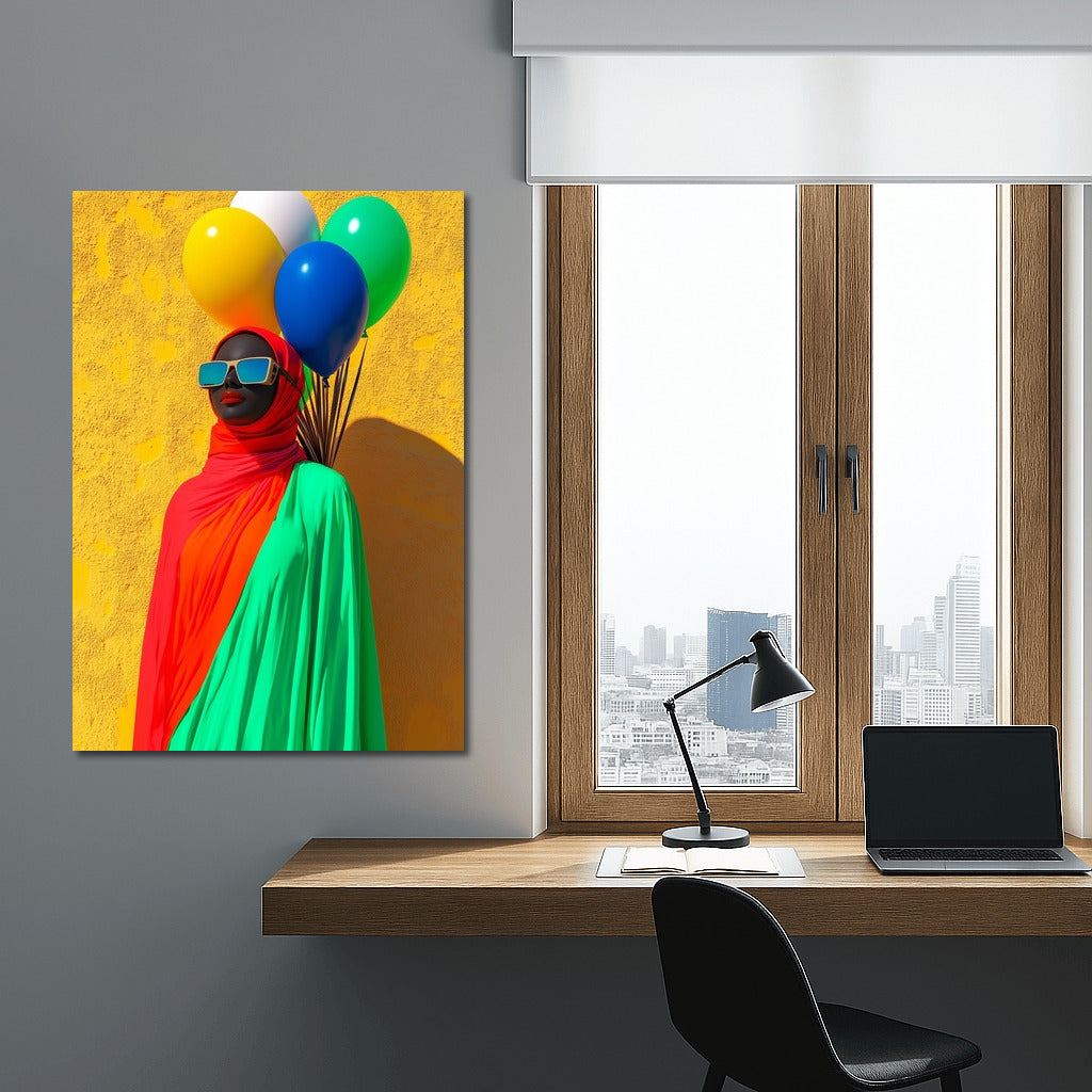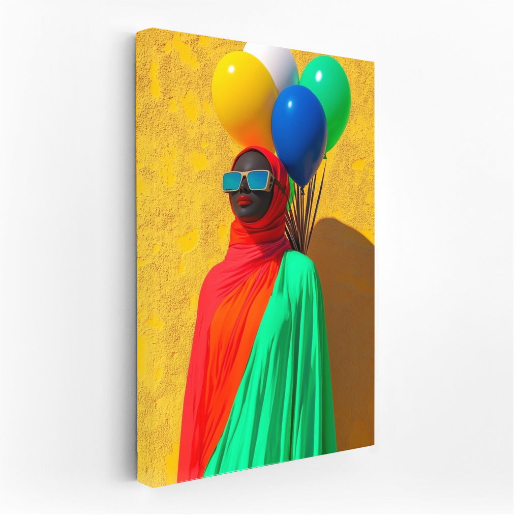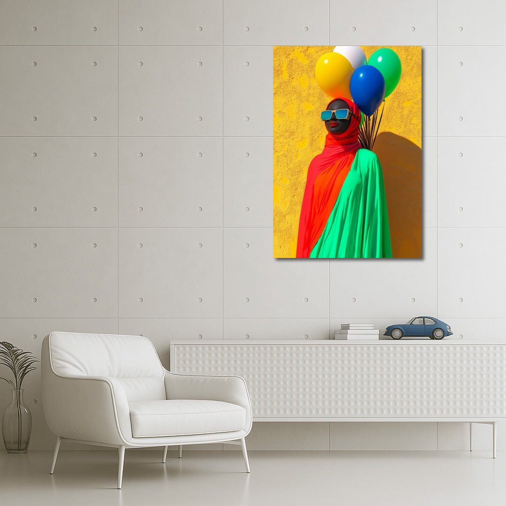 A bright poster: a mysterious figure in stylish glasses against a cheerful wall, surrounded by colorful balls. Wall art that enlivens the interior. See more from the collection: Mixed Wall Art