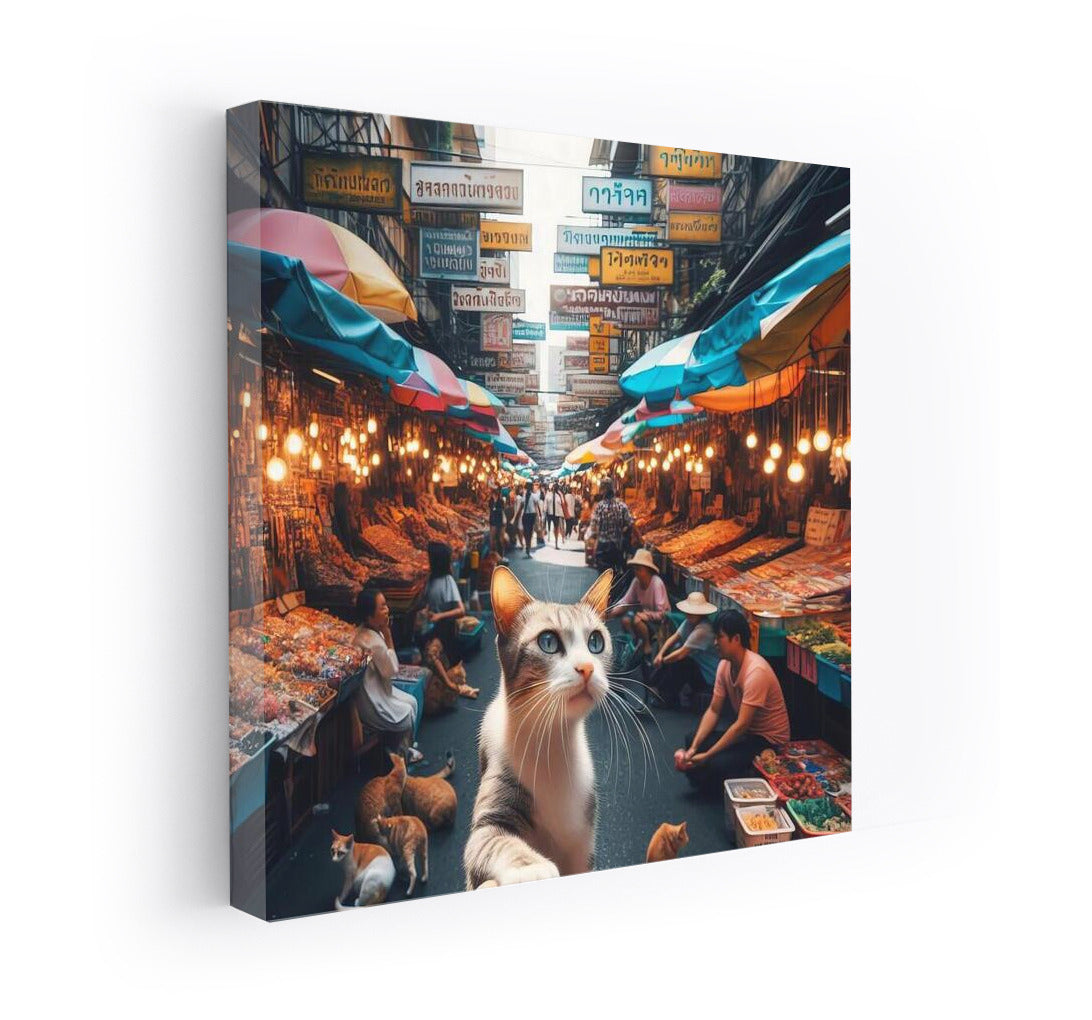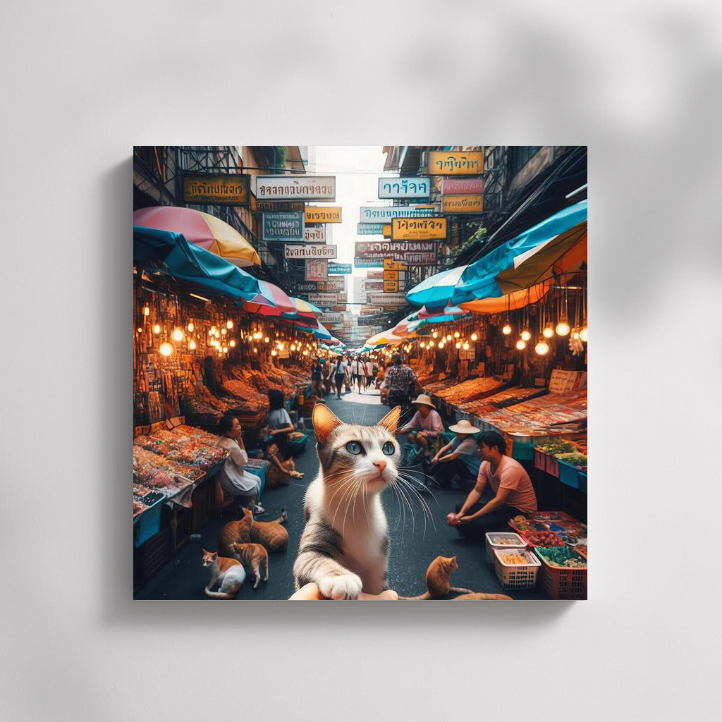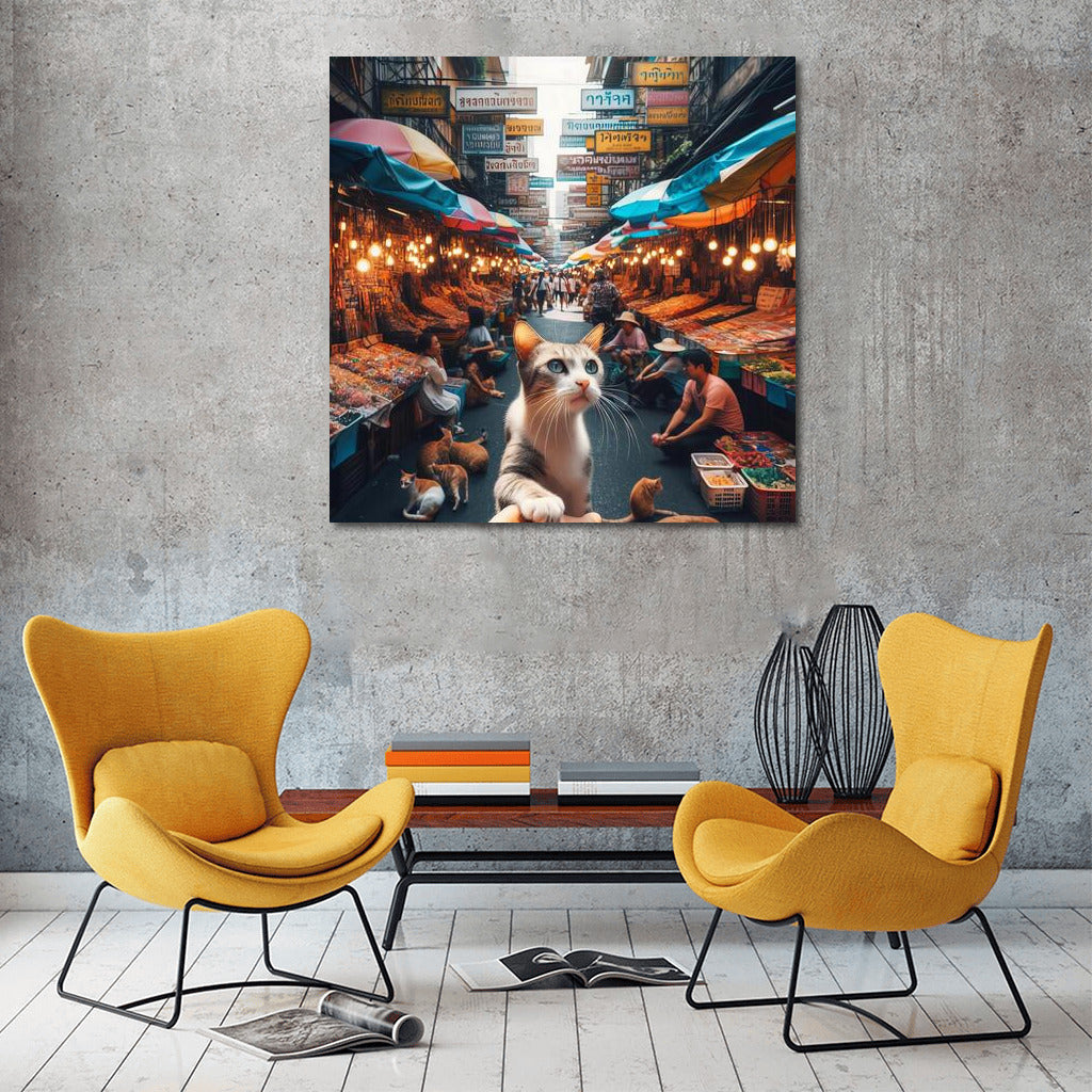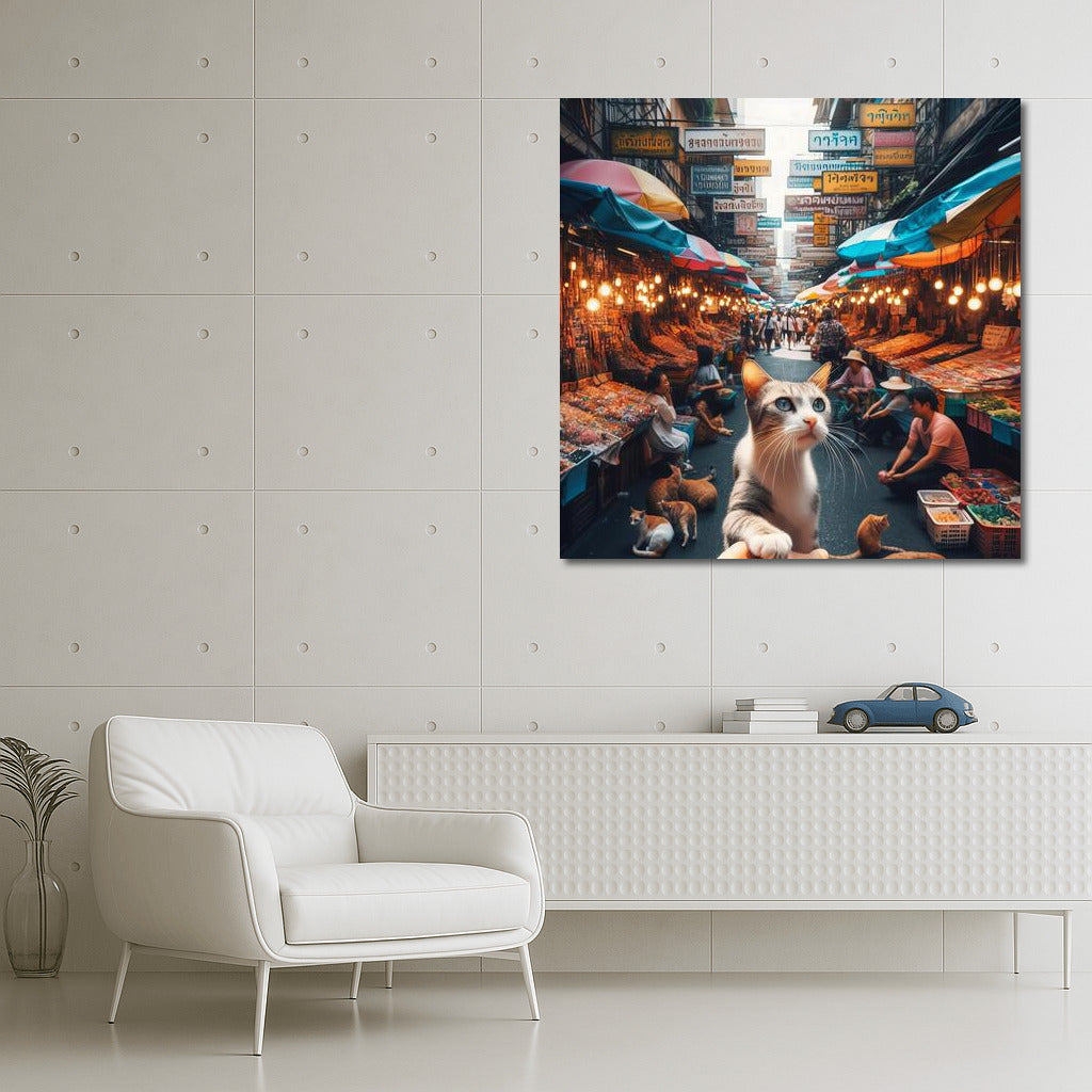 A cat explores a vibrant Bangkok street market. Wall art to bring your interior to life! See more from the collection: Animals Art