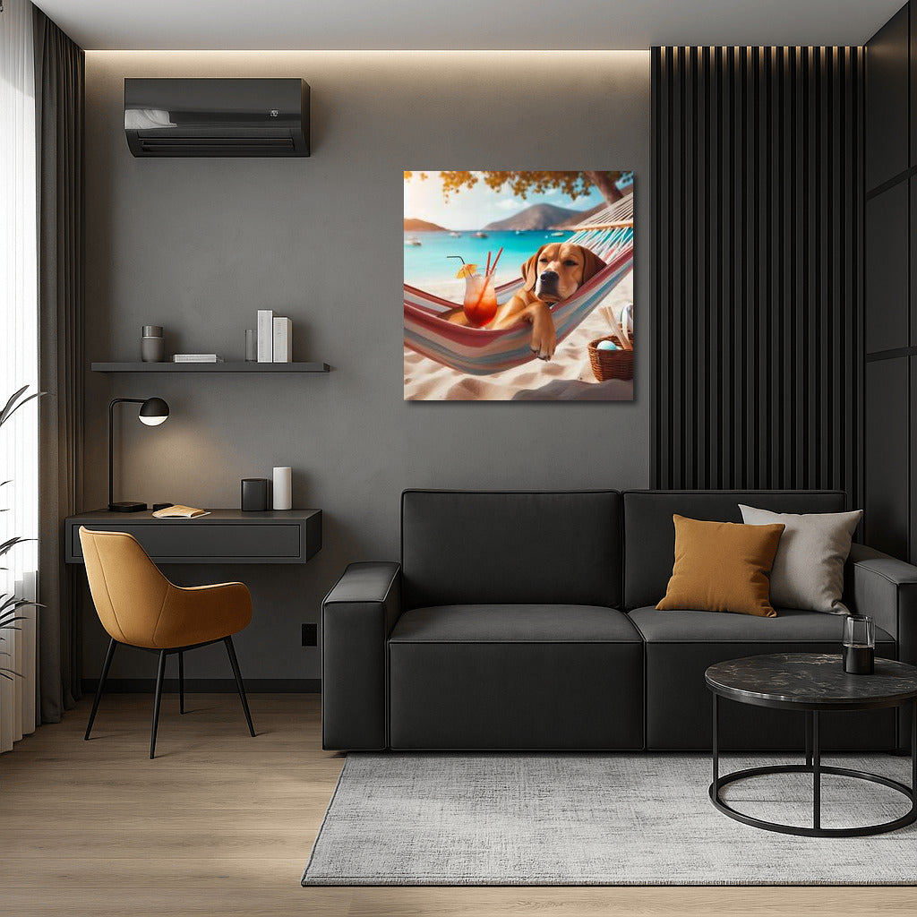 Sunny delight: dog in a hammock on the beach with a cocktail. Perfect wall art for a relaxing atmosphere. See more from the collection: Animals Art