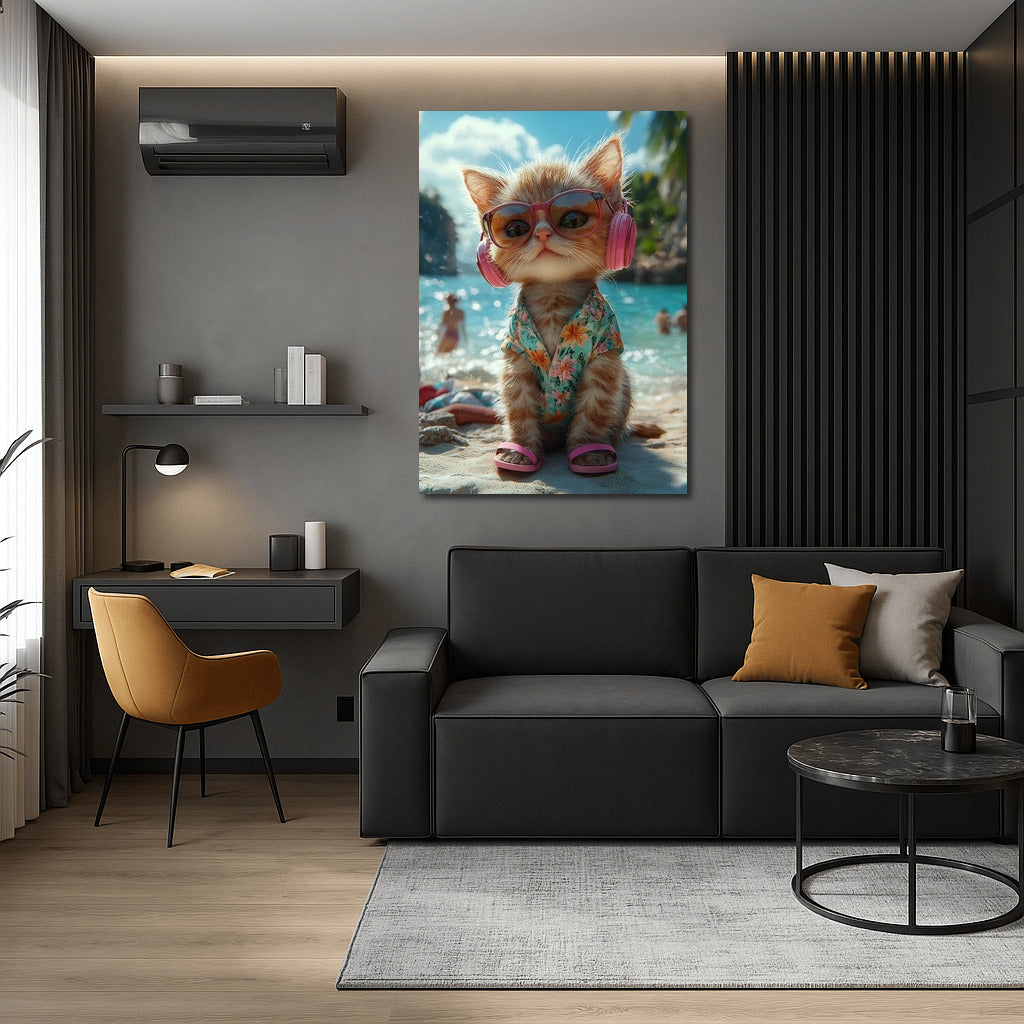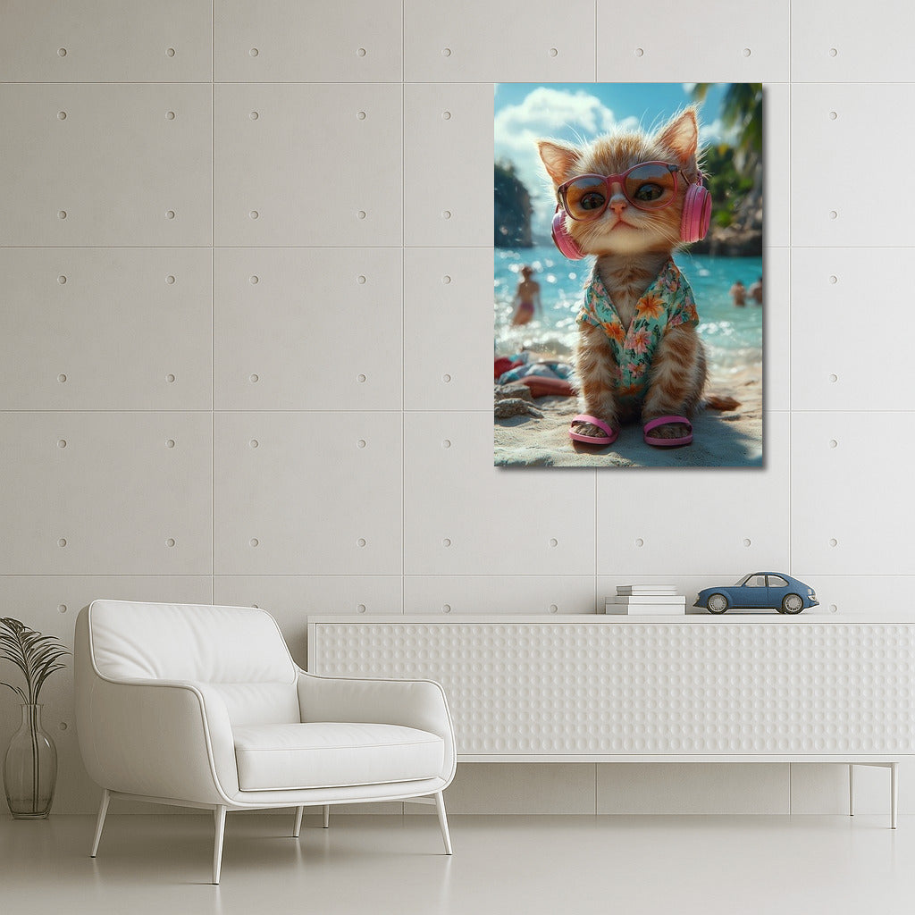 This poster of a kitten wearing headphones and sunglasses on the beach will bring a bright mood to your home. Wall art for those who love fun! See more from the collection: Animals Art