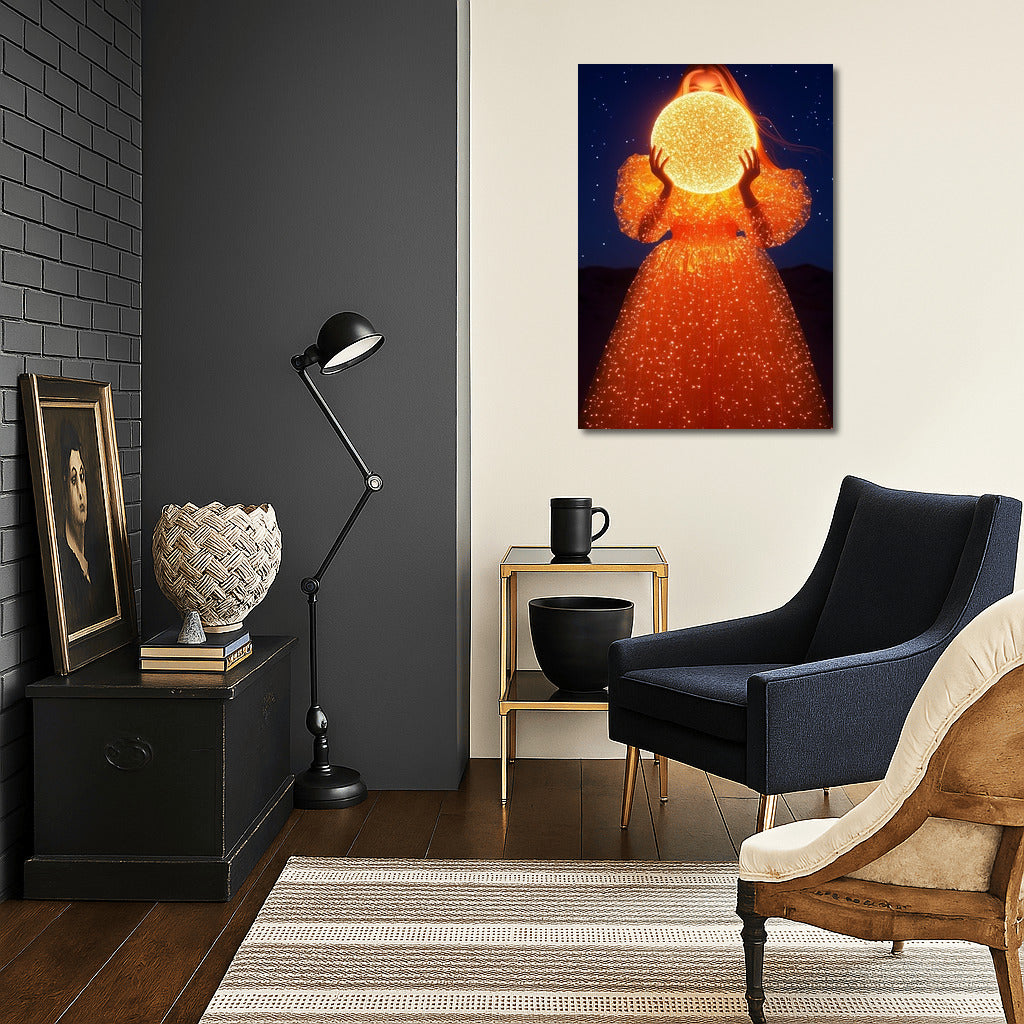 Immerse yourself in the magic of light with this poster of a mysterious figure holding a glowing orb under a starry sky. A wall wonder! See more from the collection: Fantasy Art