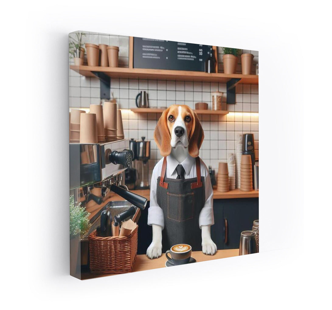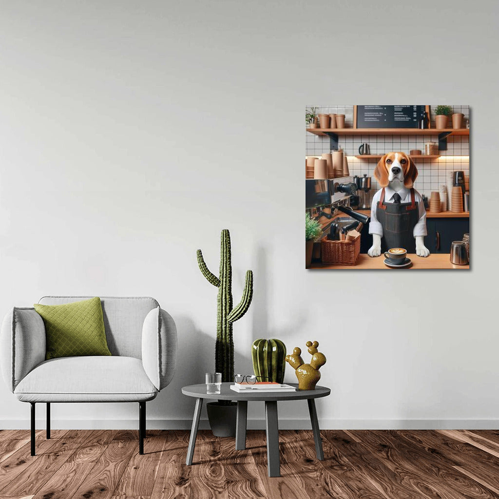 Beagle barista in apron behind coffee counter. Adorable wall art for coffee lovers and dogs! ☕? See more from the collection: Animals Art
