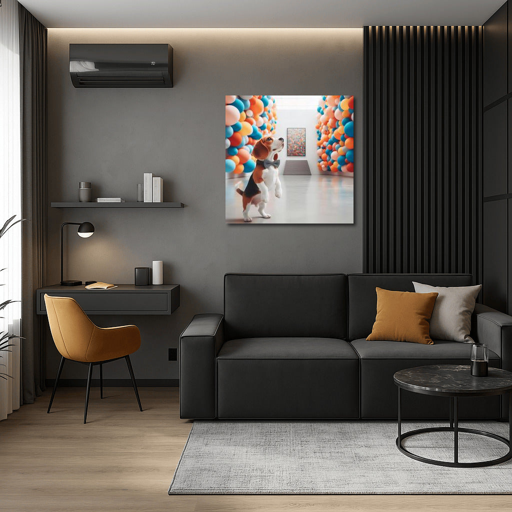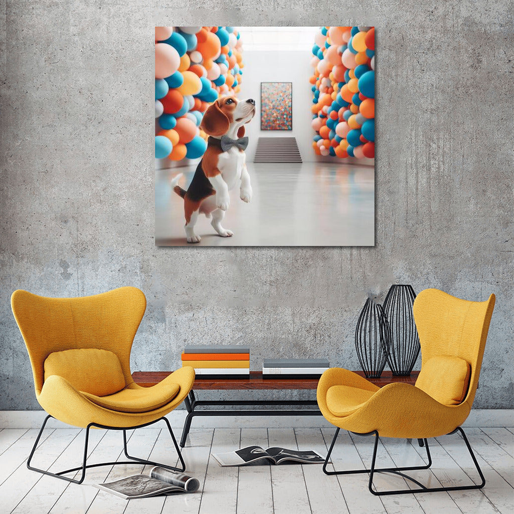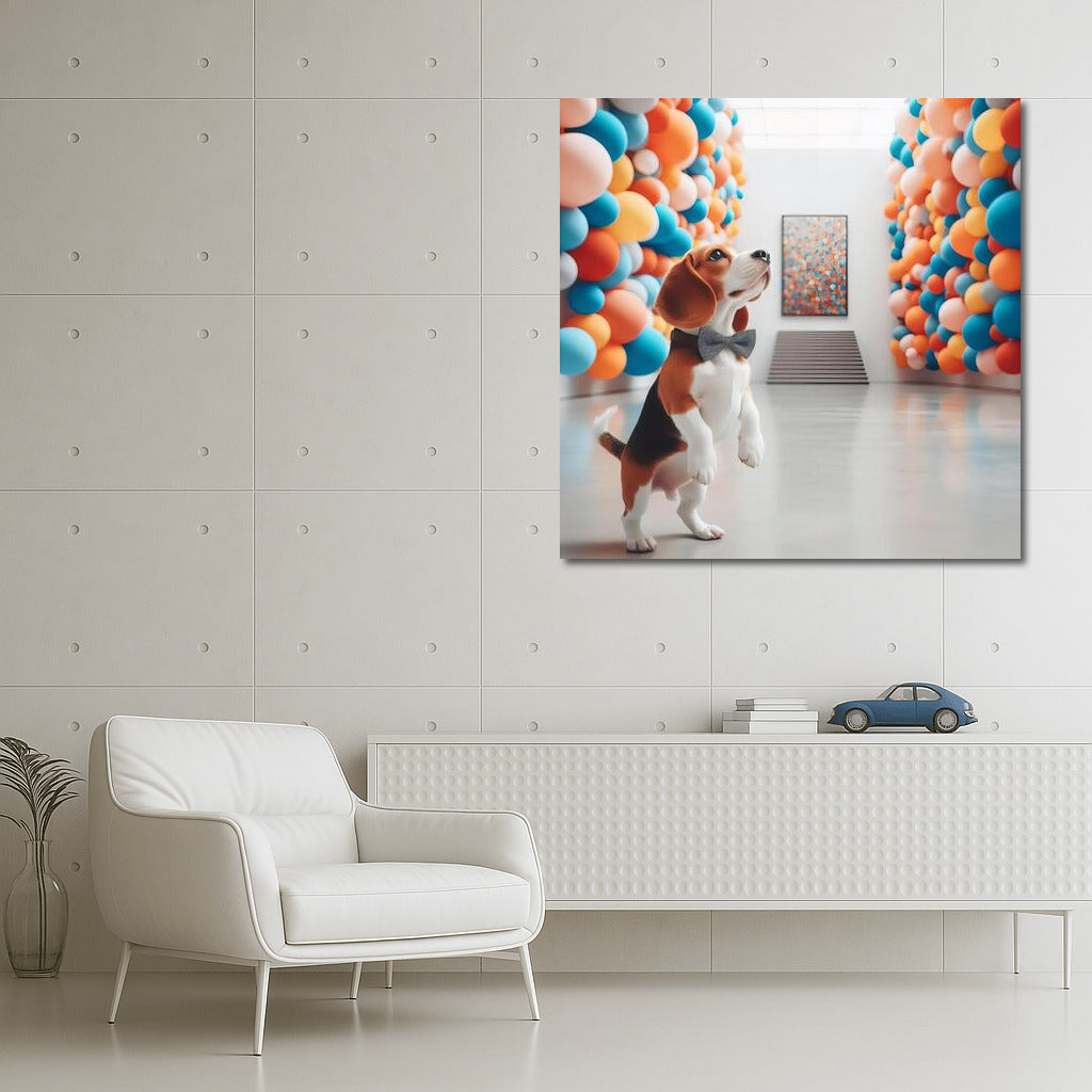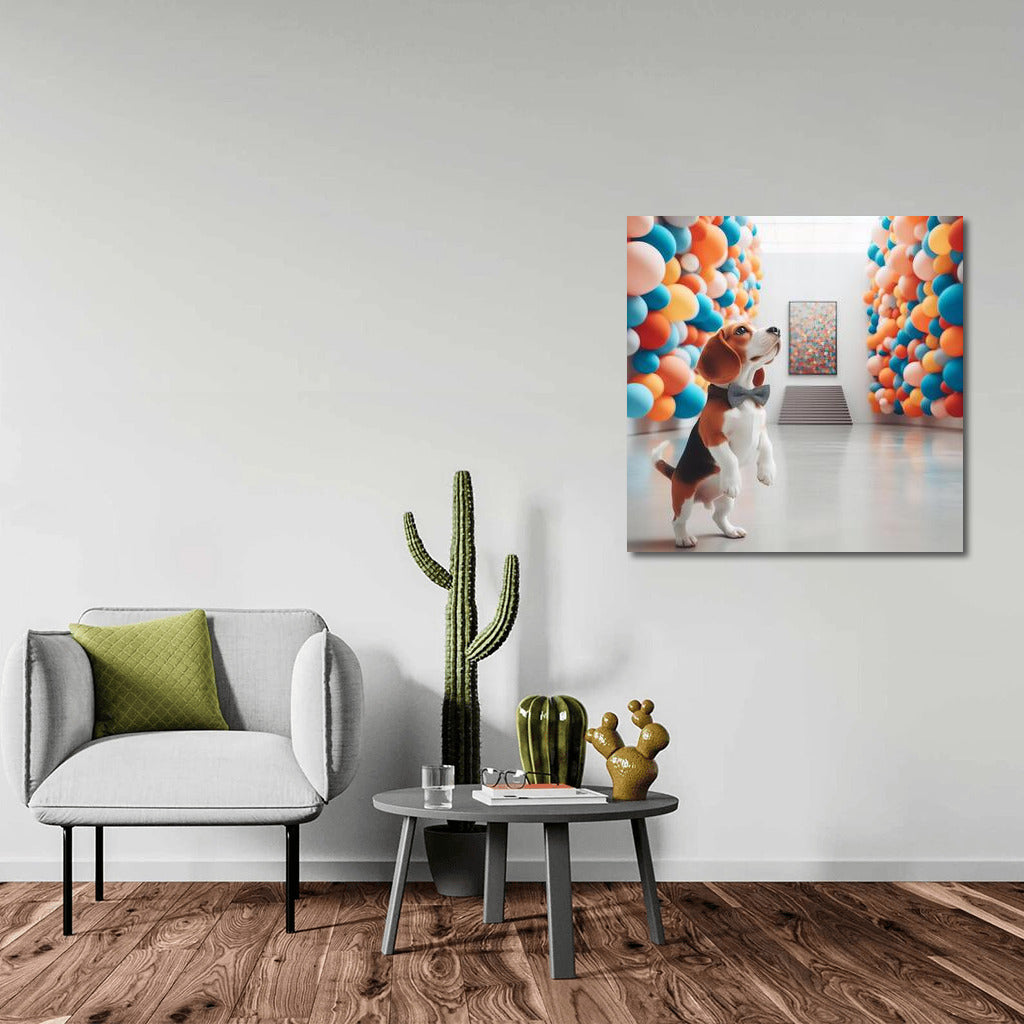 Poster Beagle in a Modern Museum 4: A mischievous beagle in a gallery of brightly colored balls, inspires new adventures in the world of art. See more from the collection: Animals Art