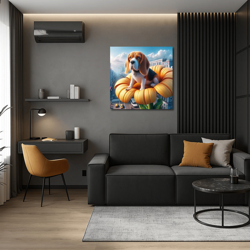 Beagle on a giant flower, traveling around the world. A unique poster for fans of fantastic adventures! See more from the collection: Animals Art