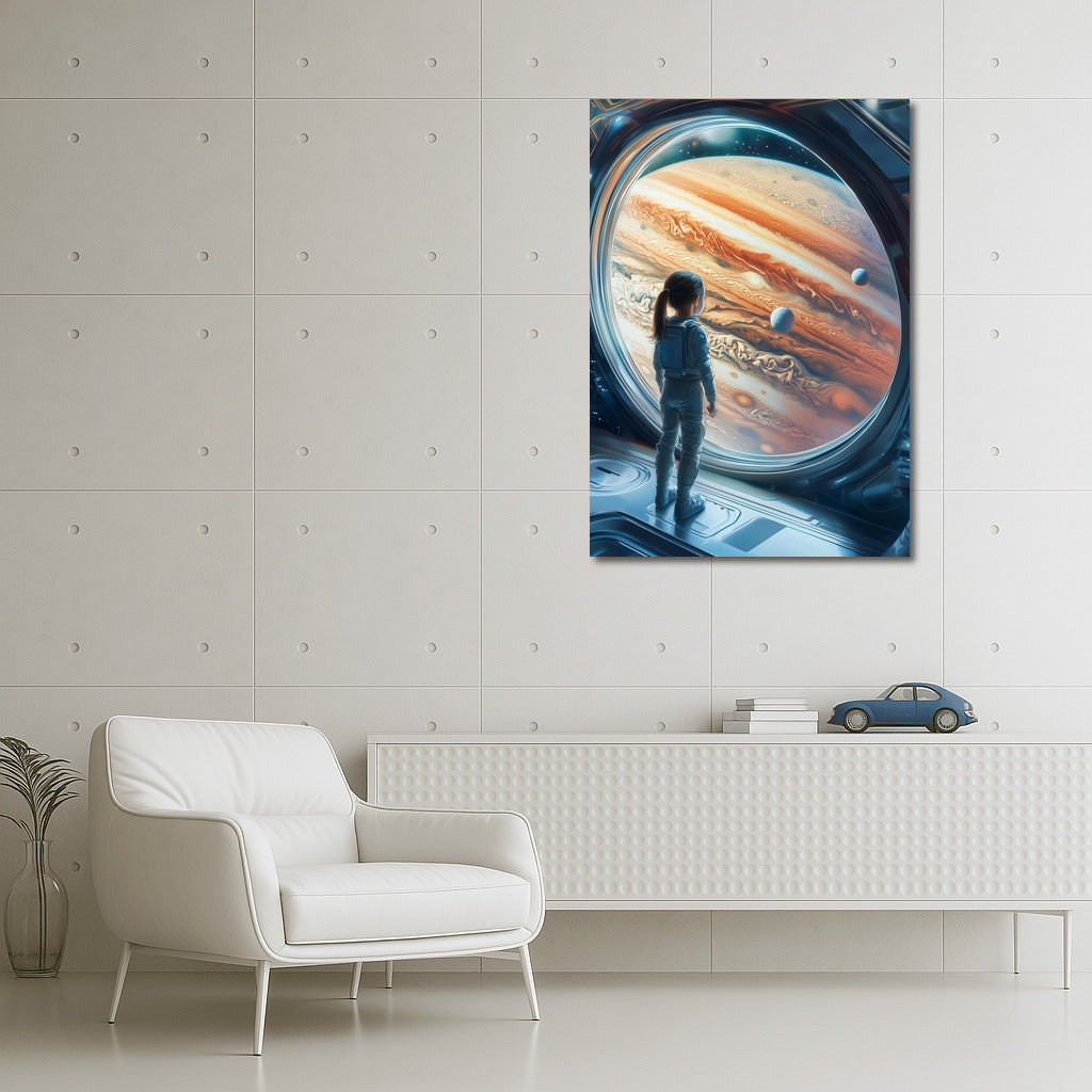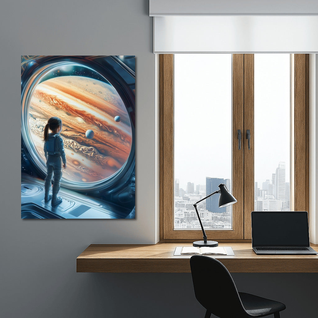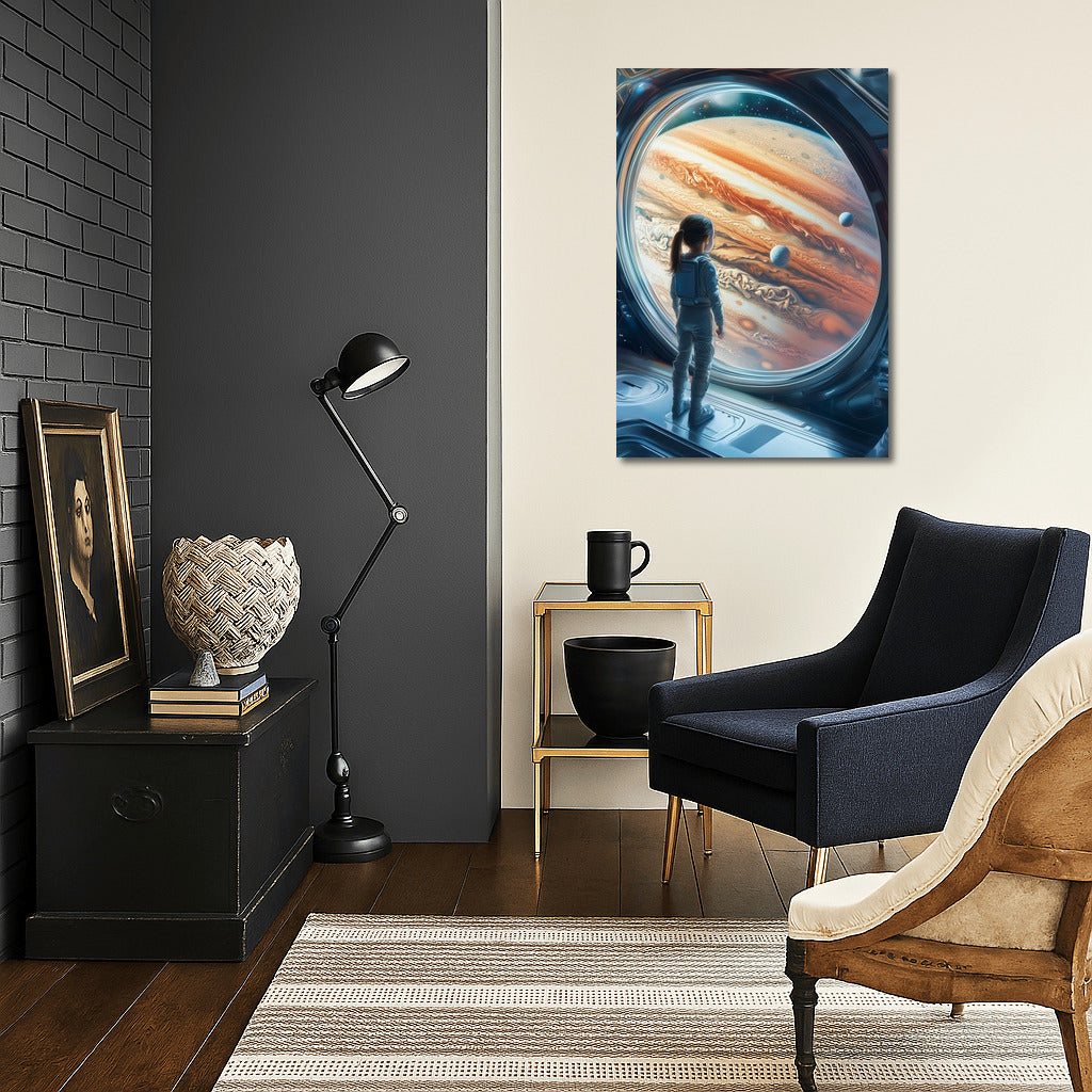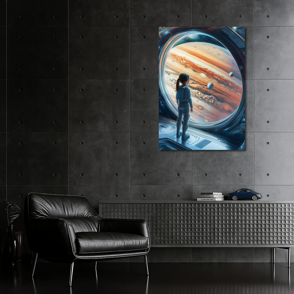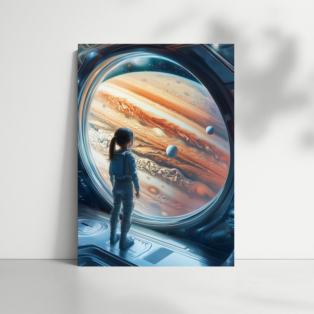 Amazing poster: silhouette in spacesuit admires the majesty of Jupiter. Space wall art for dreamers! See more from the collection: Space & Astronomy Art