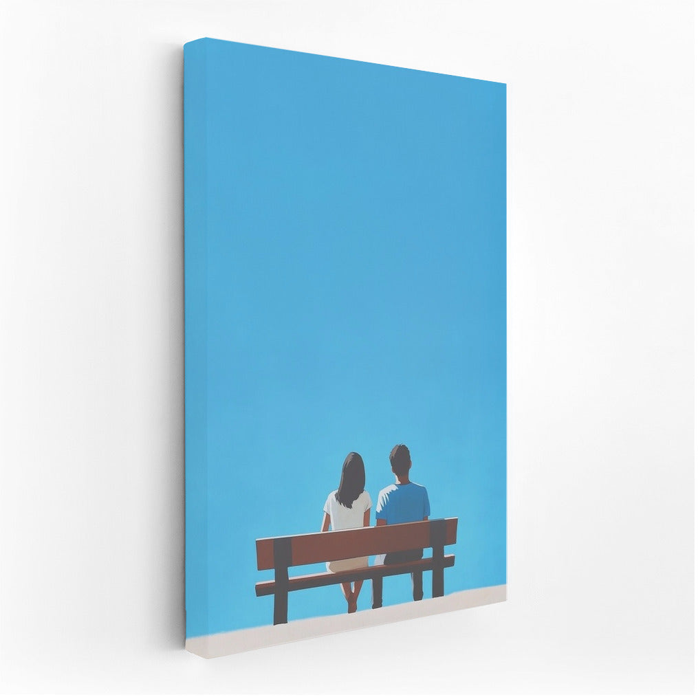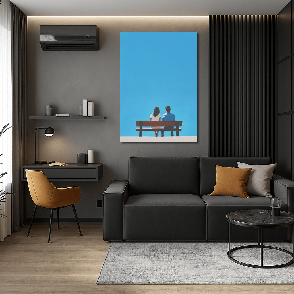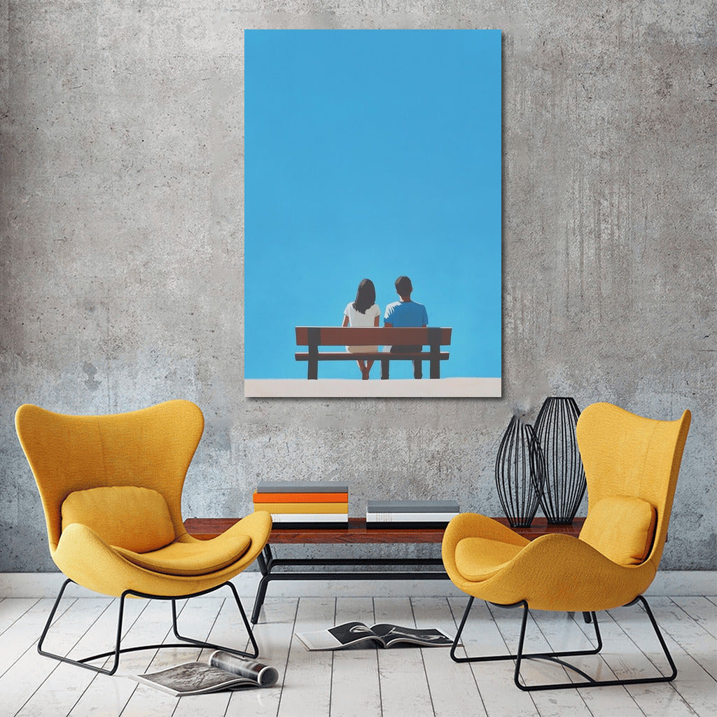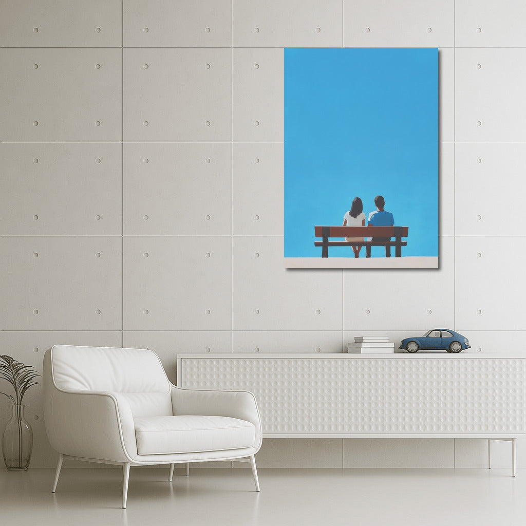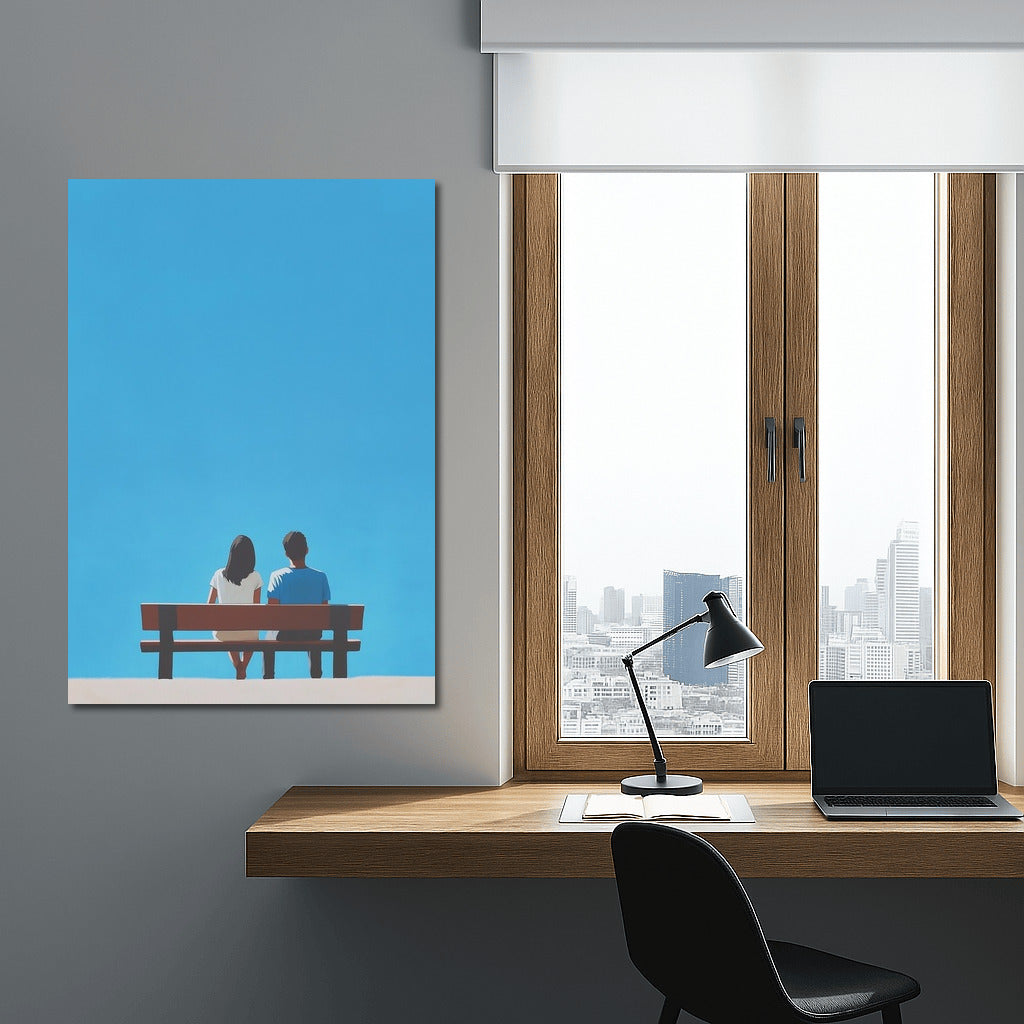 A poster of two figures on a bench under an endless sky. Wall art for those who appreciate moments of silence and solitude. See more from the collection: Mixed Wall Art
