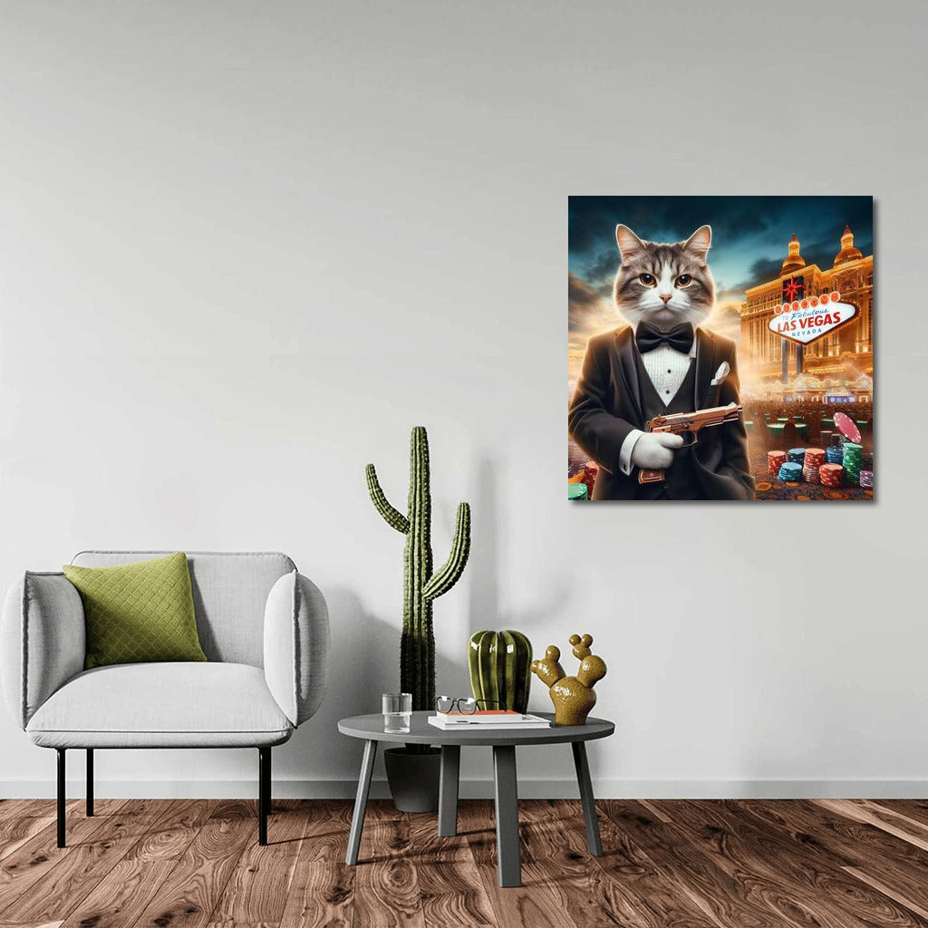 Bengal Agent 007: Cat in Tuxedo with Gun on Casino Backdrop Wall Art