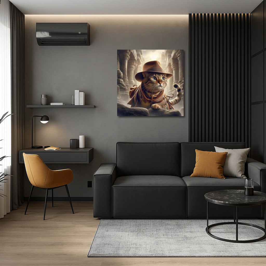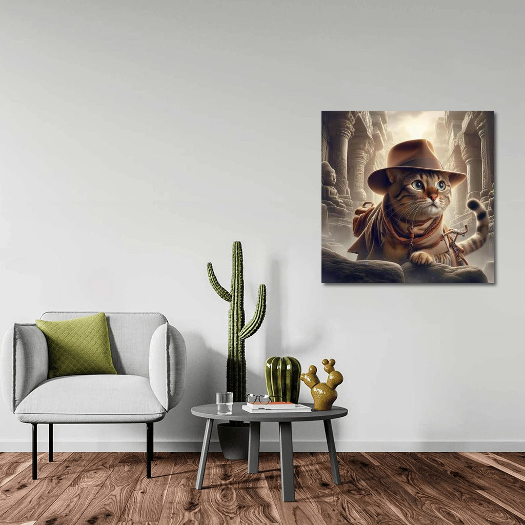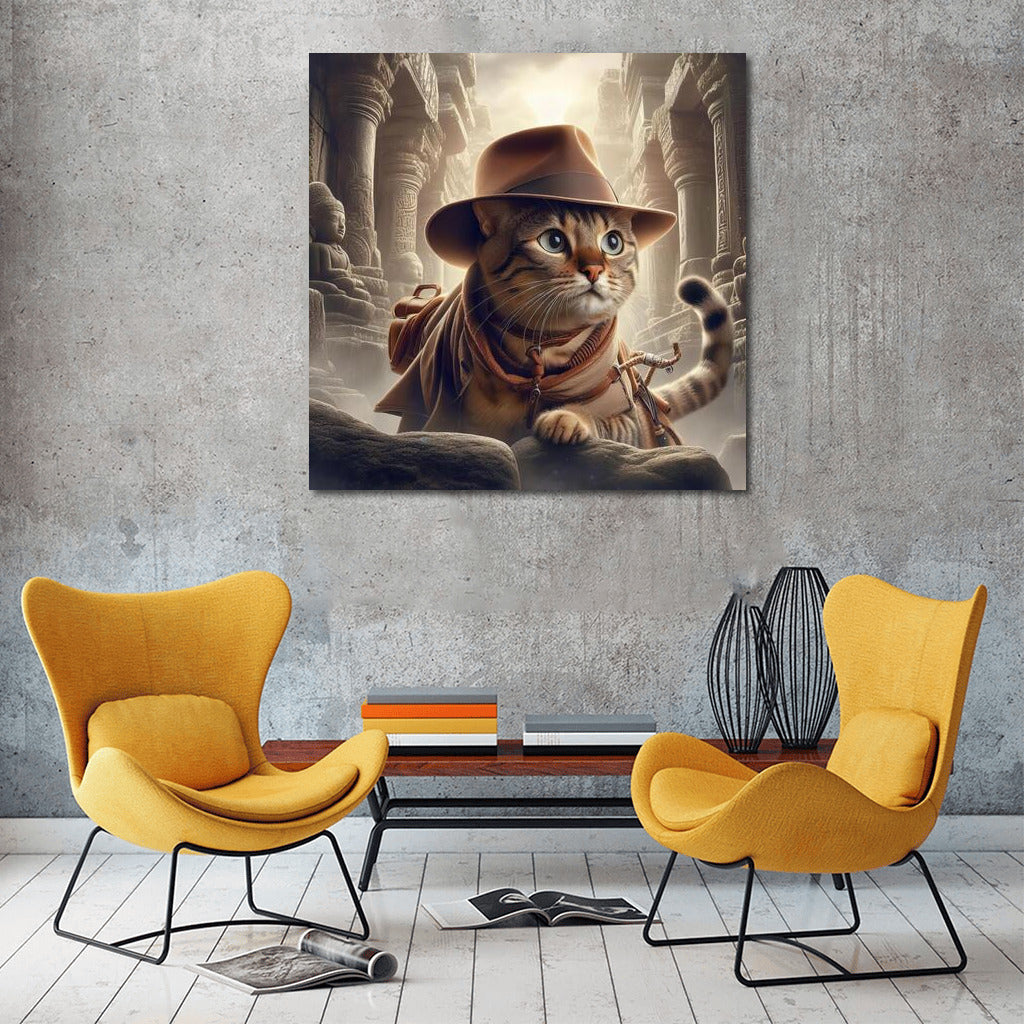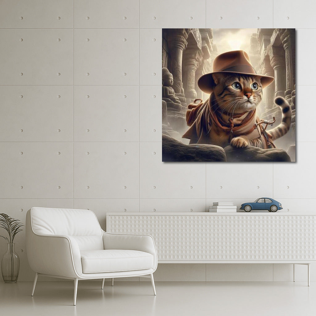 Adventure poster: a cat in a hat with a whip explores ancient ruins in Indiana Jones style. Wall art with character! See more from the collection: Animals Art