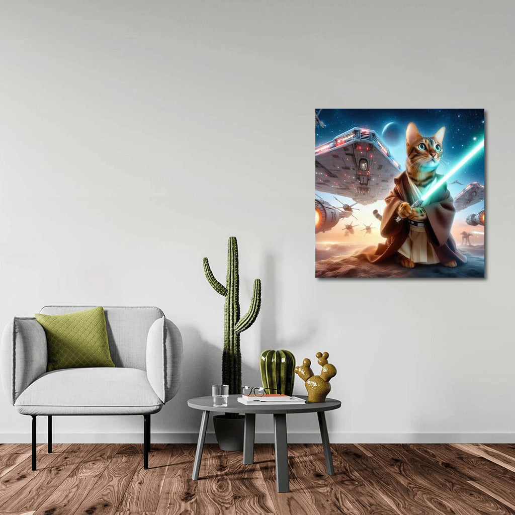 Jedi cat with laser sword in front of spaceship. Star Wars wall art for space and adventure fans! See more from the collection: Animals Art