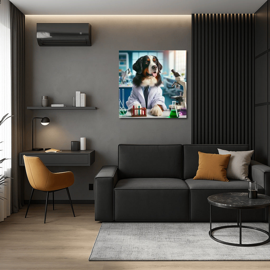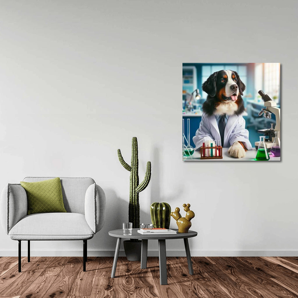 A poster with a Bernese Mountain Dog as a scientist: laboratory art and canine ingenuity in one canvas! See more from the collection: Animals Art