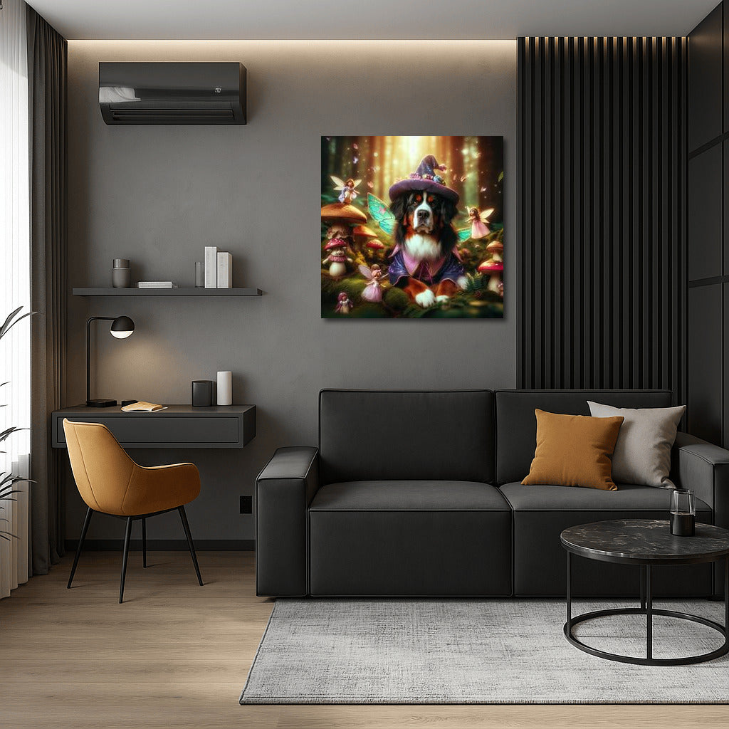 Bernese Mountain Dog in the Magical Forest: Fairytale Fairies and Mushrooms Wall Art